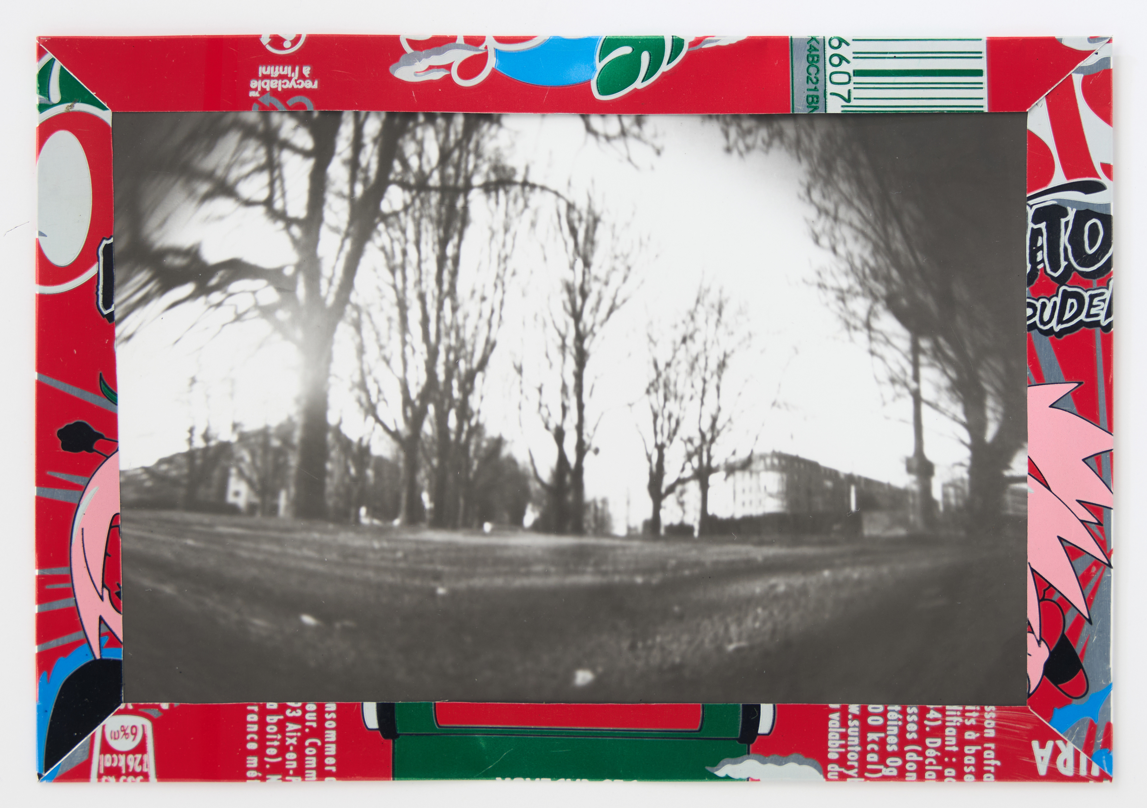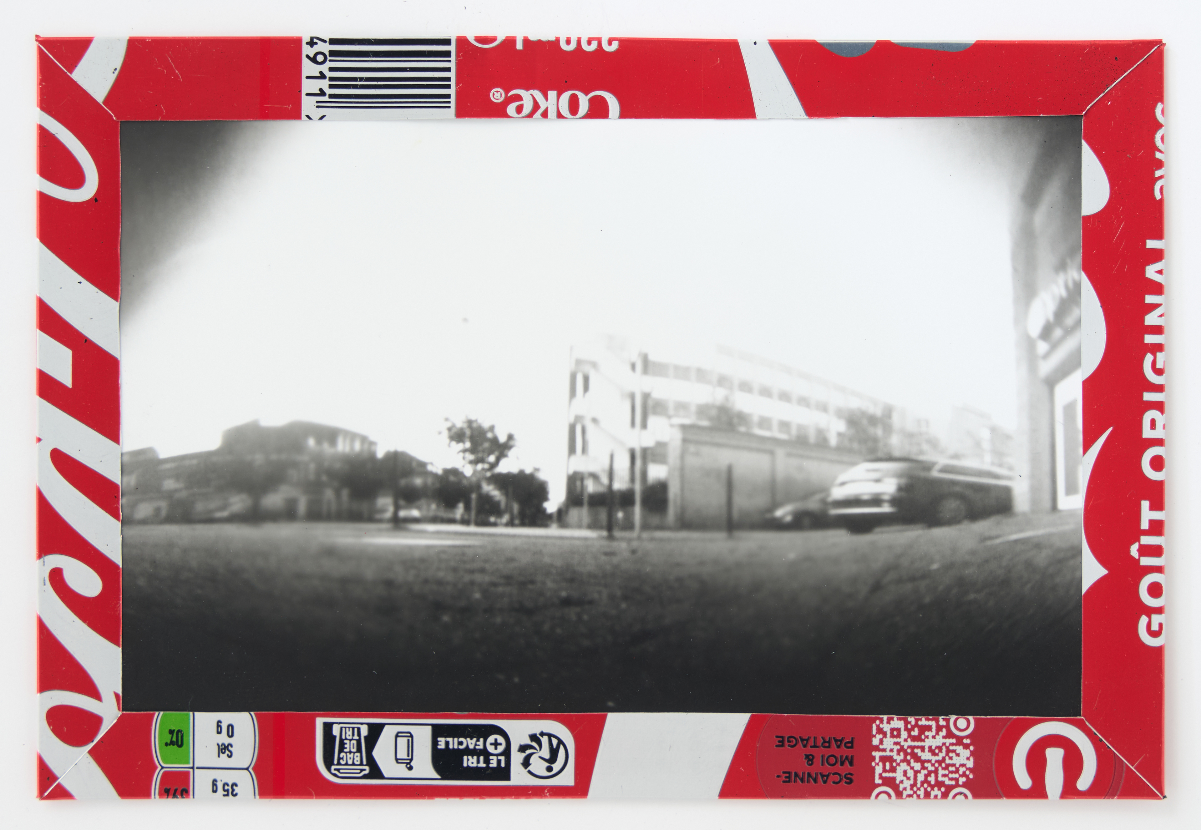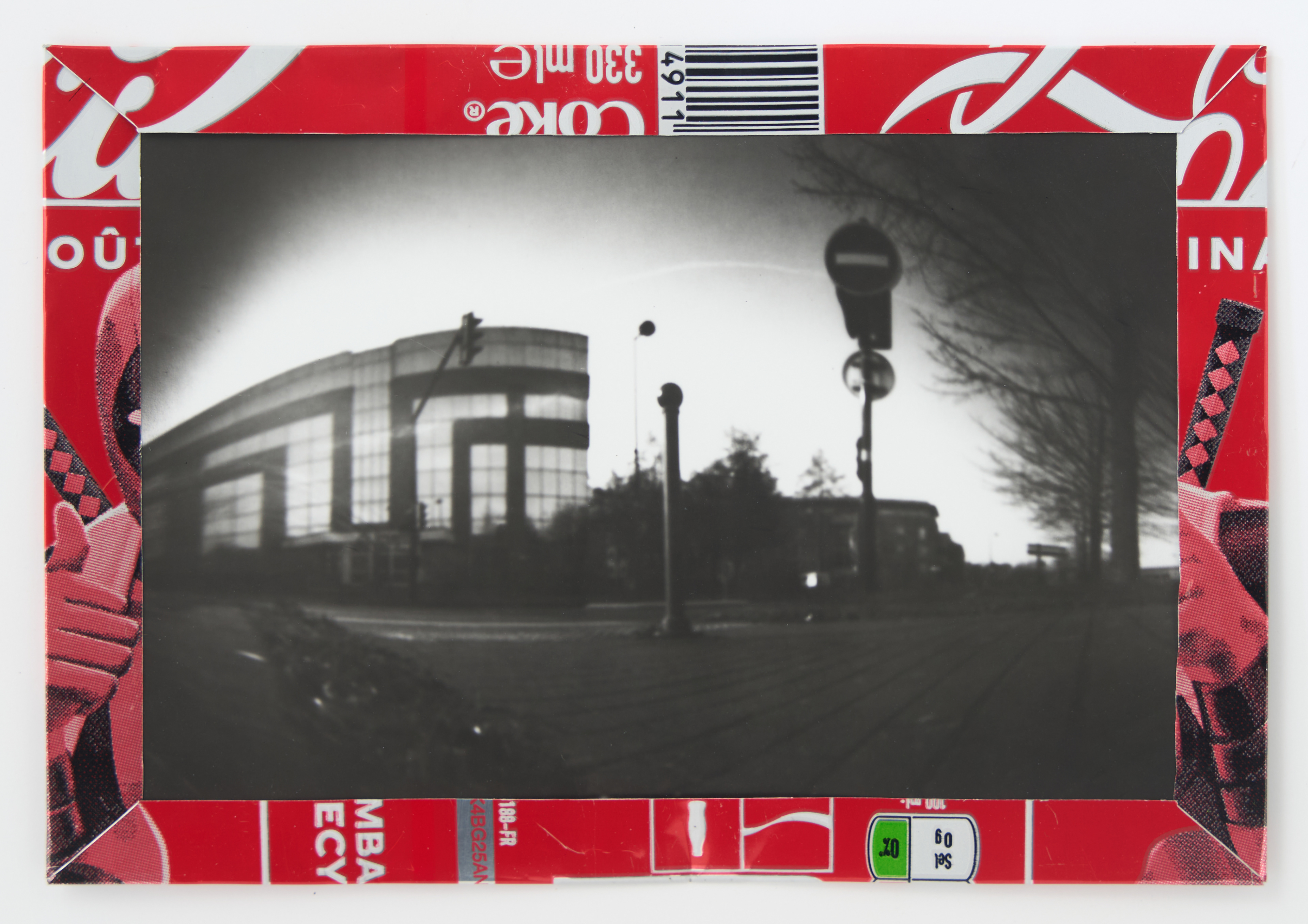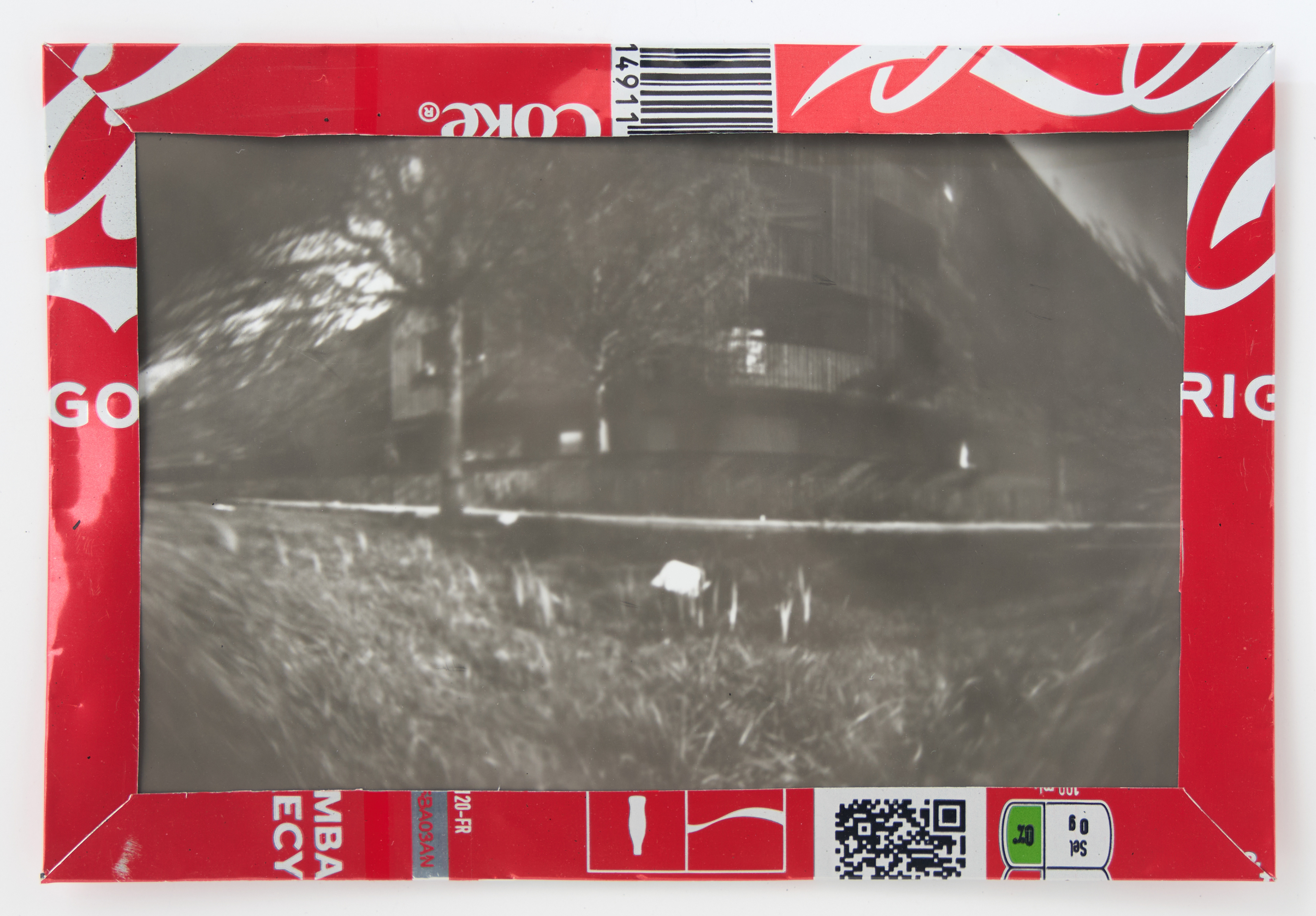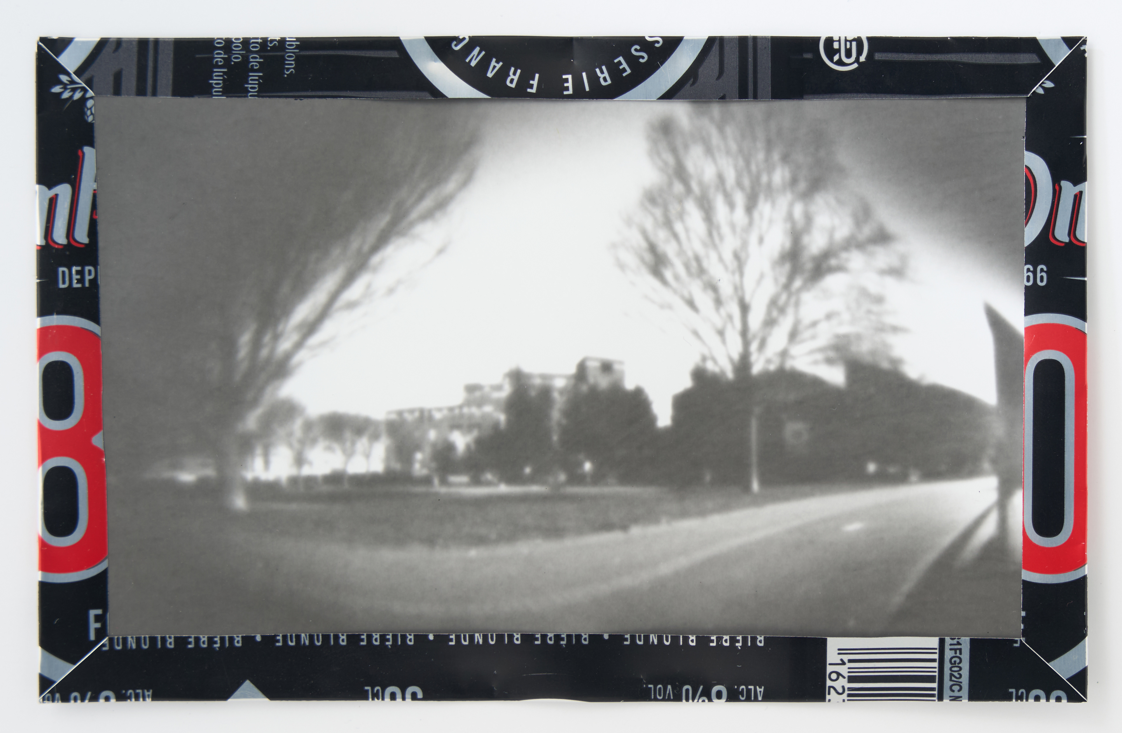 La canette sert ensuite d’encadrement à sa photographie, découpée et pliée ; ainsi ce cadre devient une extension du processus, cherchant à optimiser son recyclage.