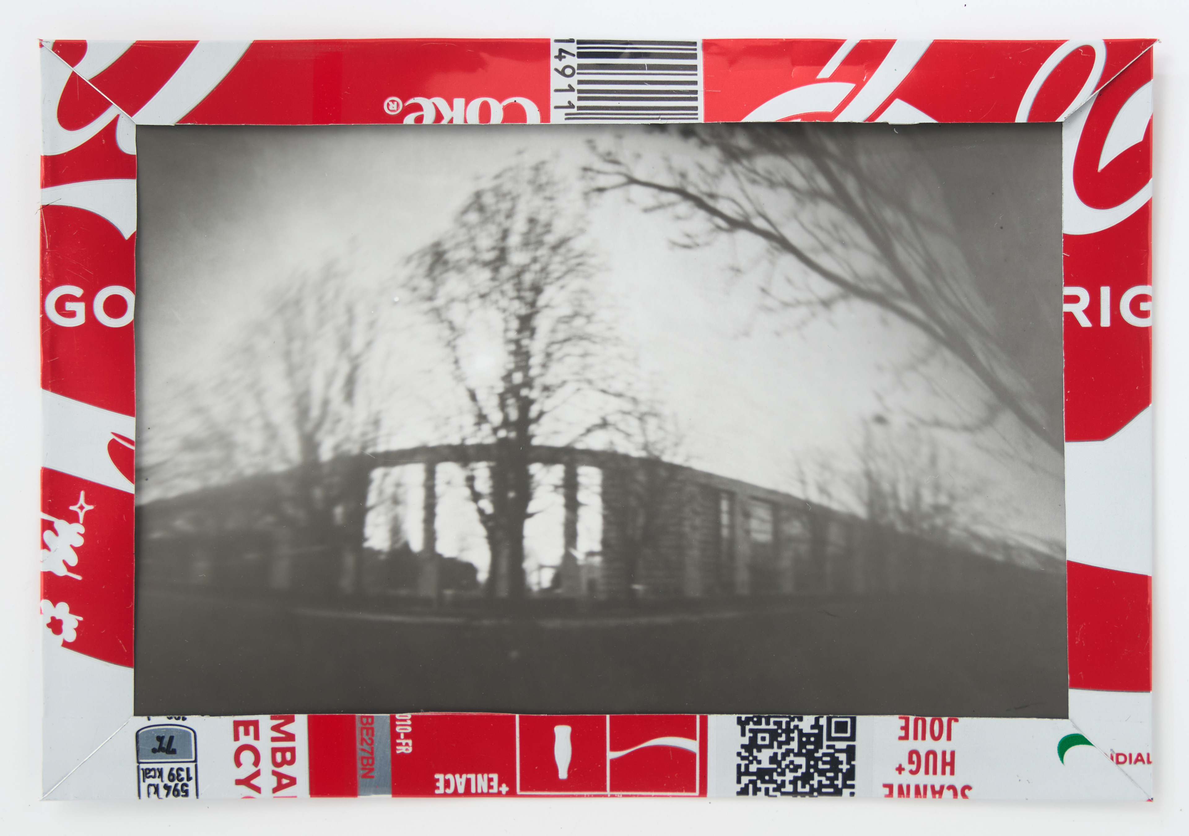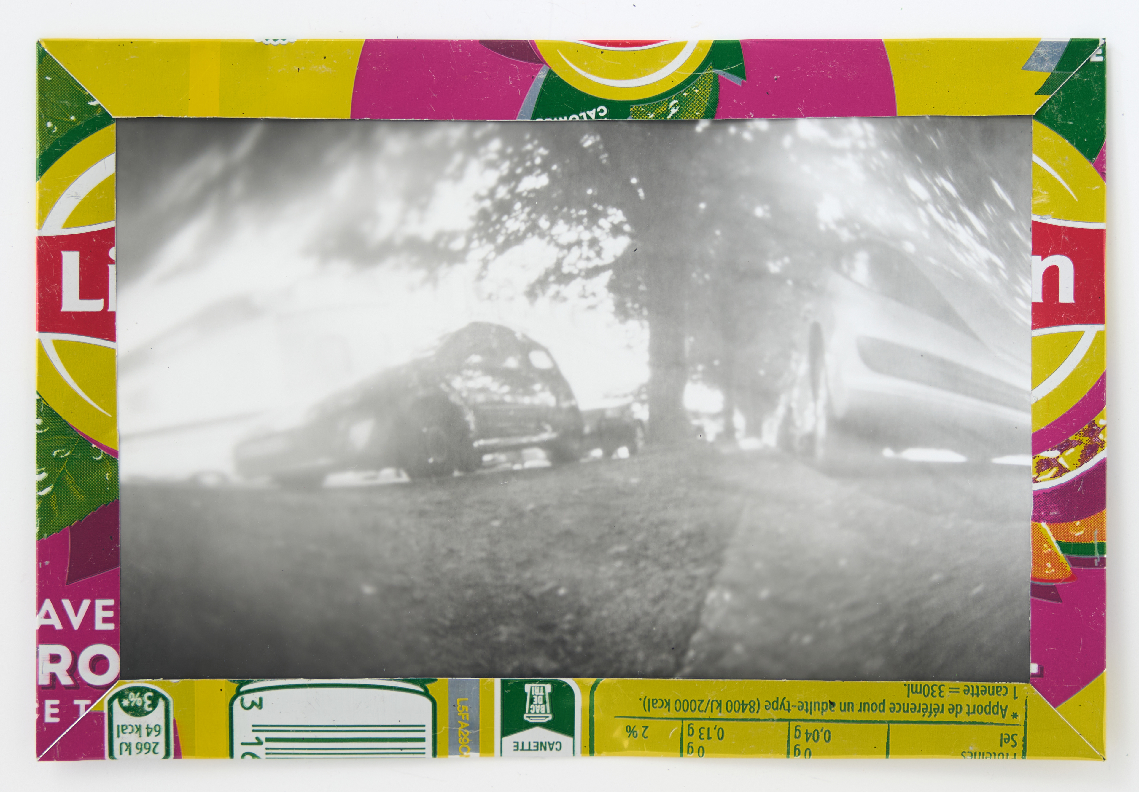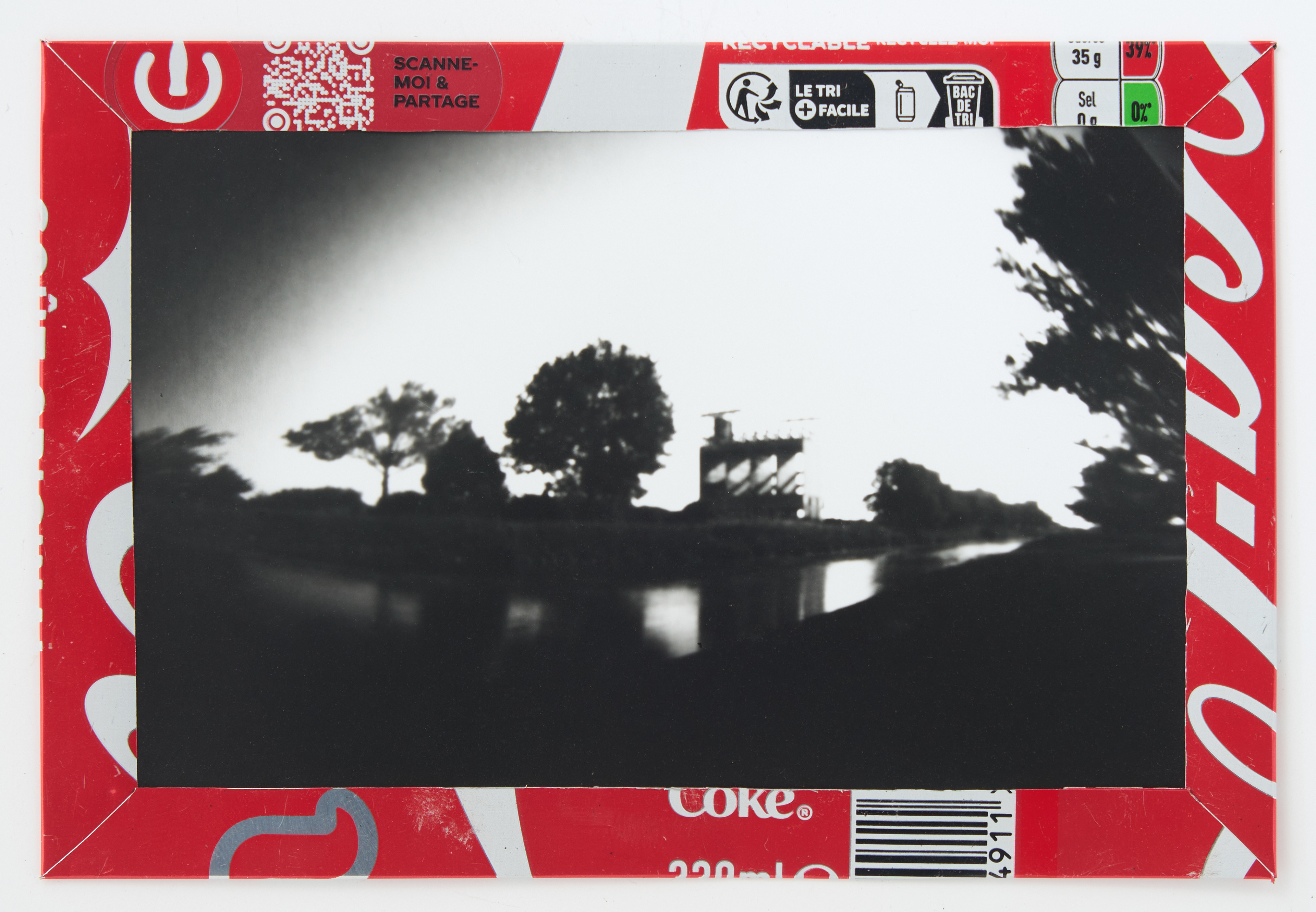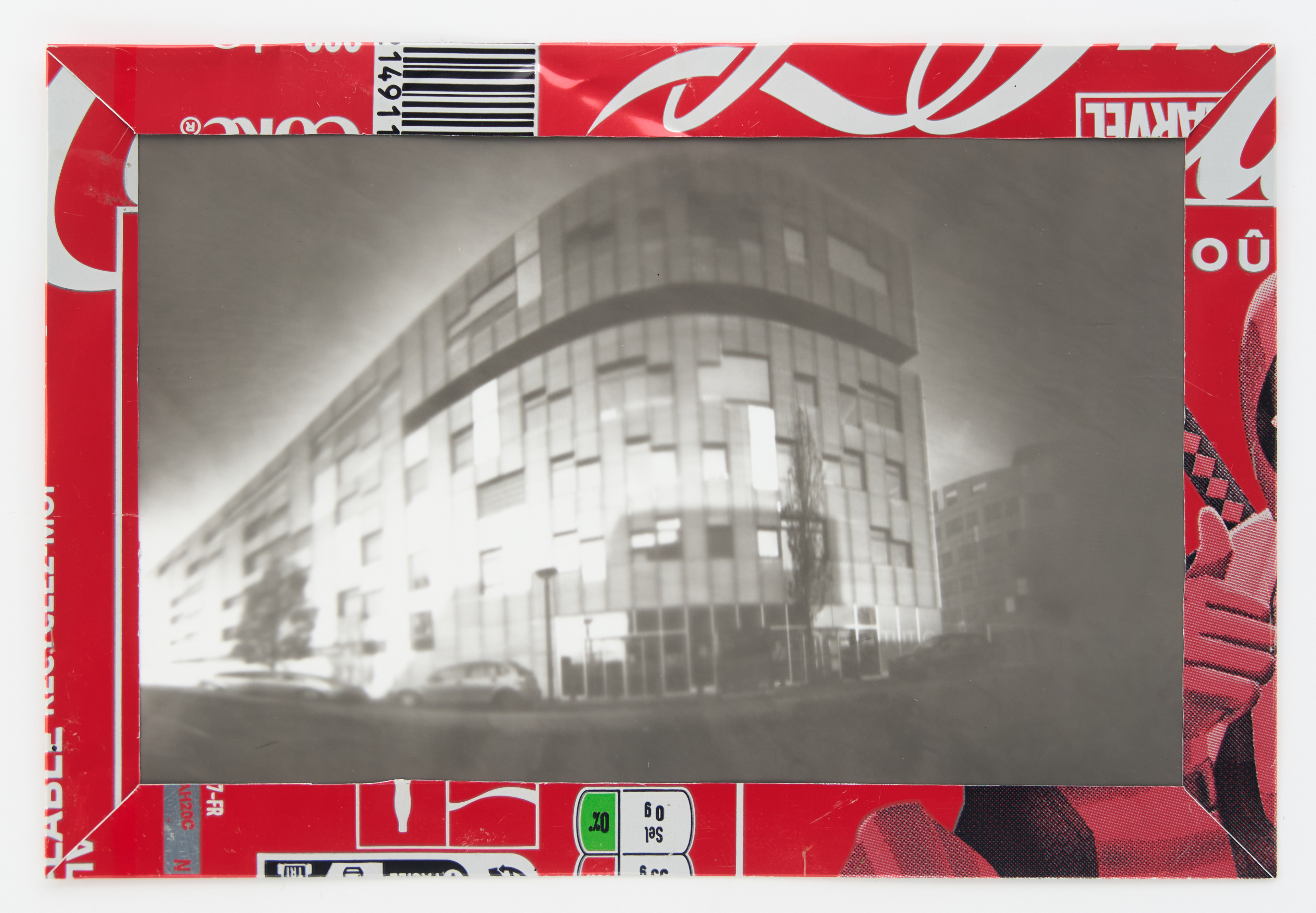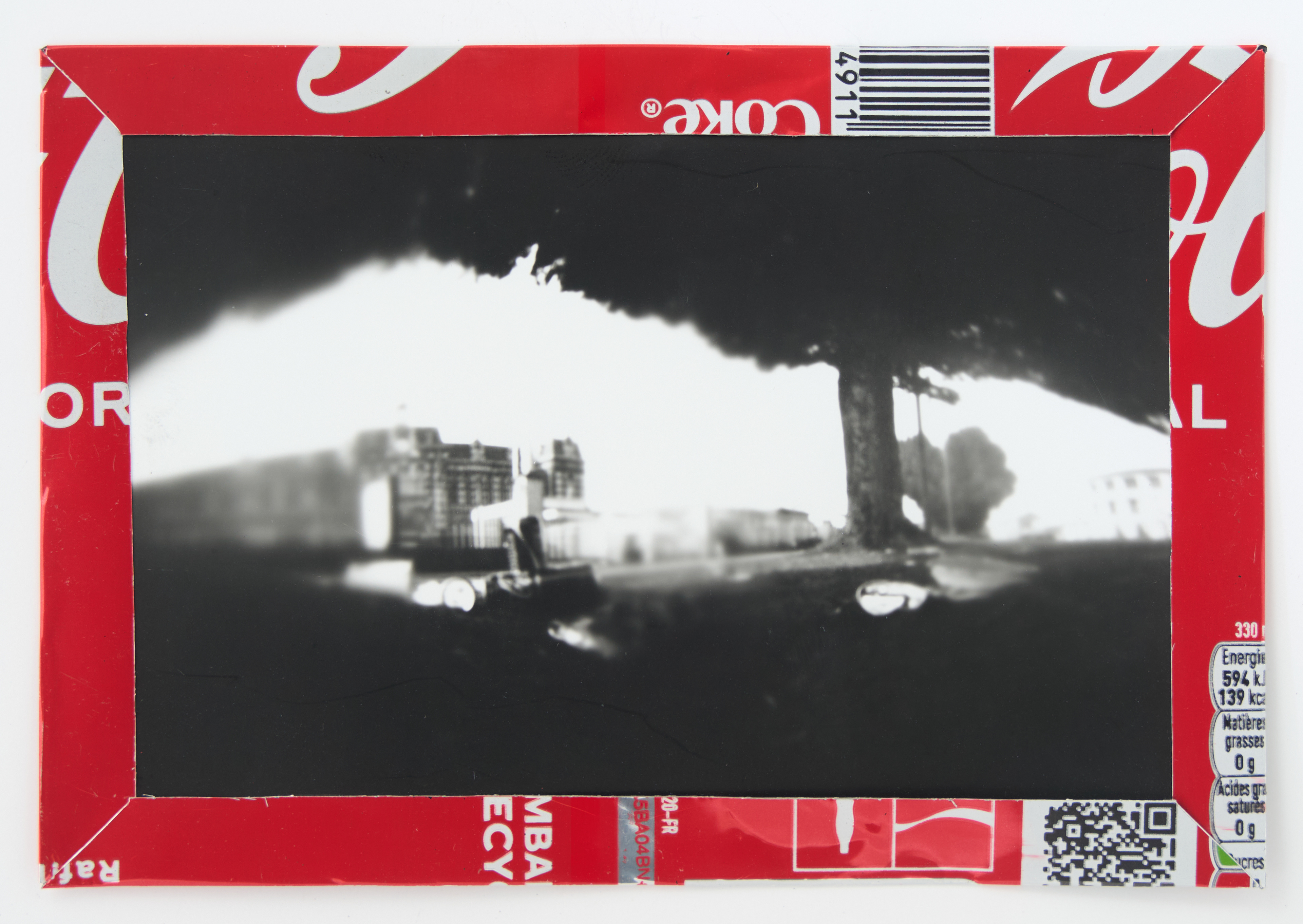 La canette sert ensuite d’encadrement à sa photographie, découpée et pliée ; ainsi ce cadre devient une extension du processus, cherchant à optimiser son recyclage.