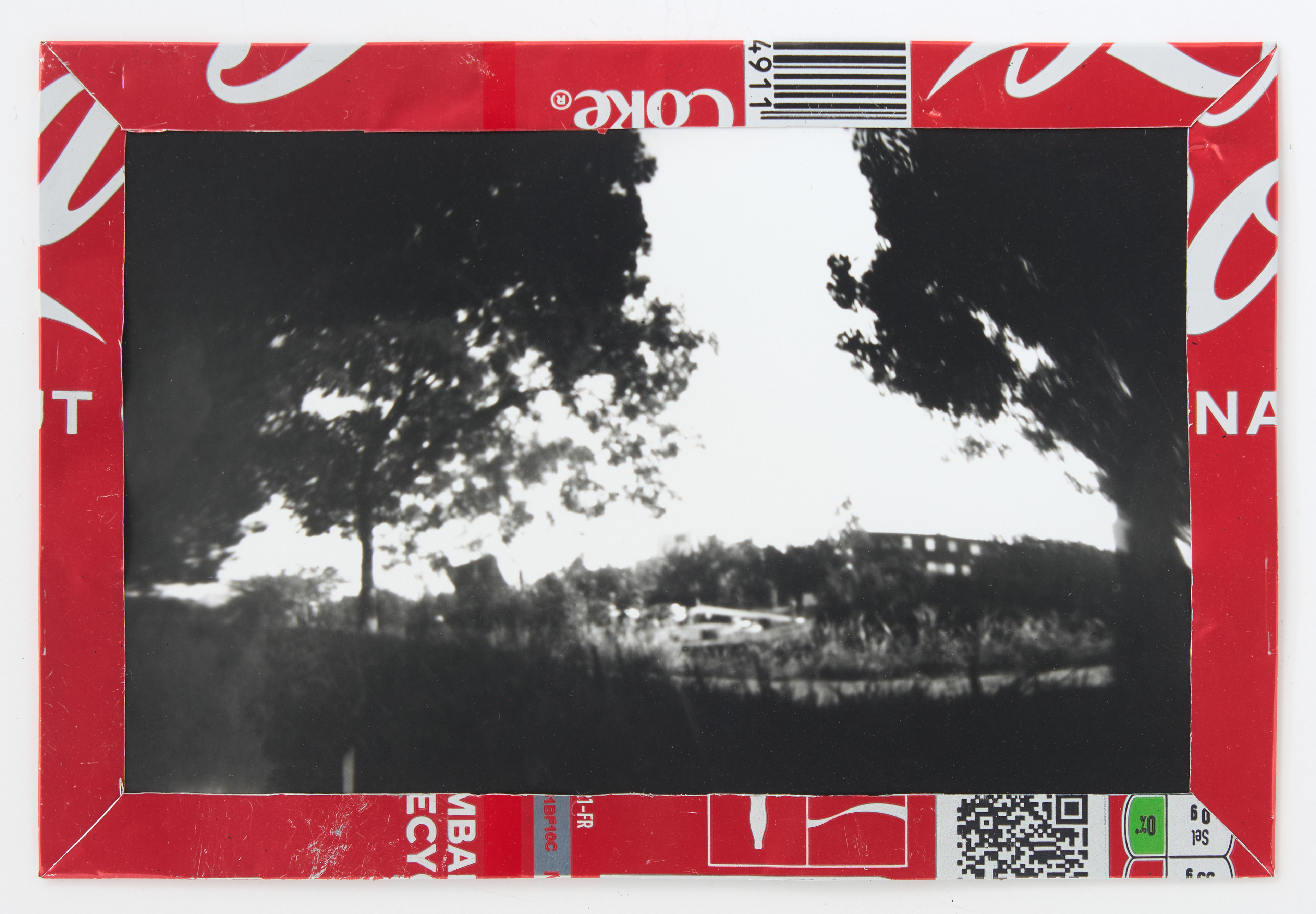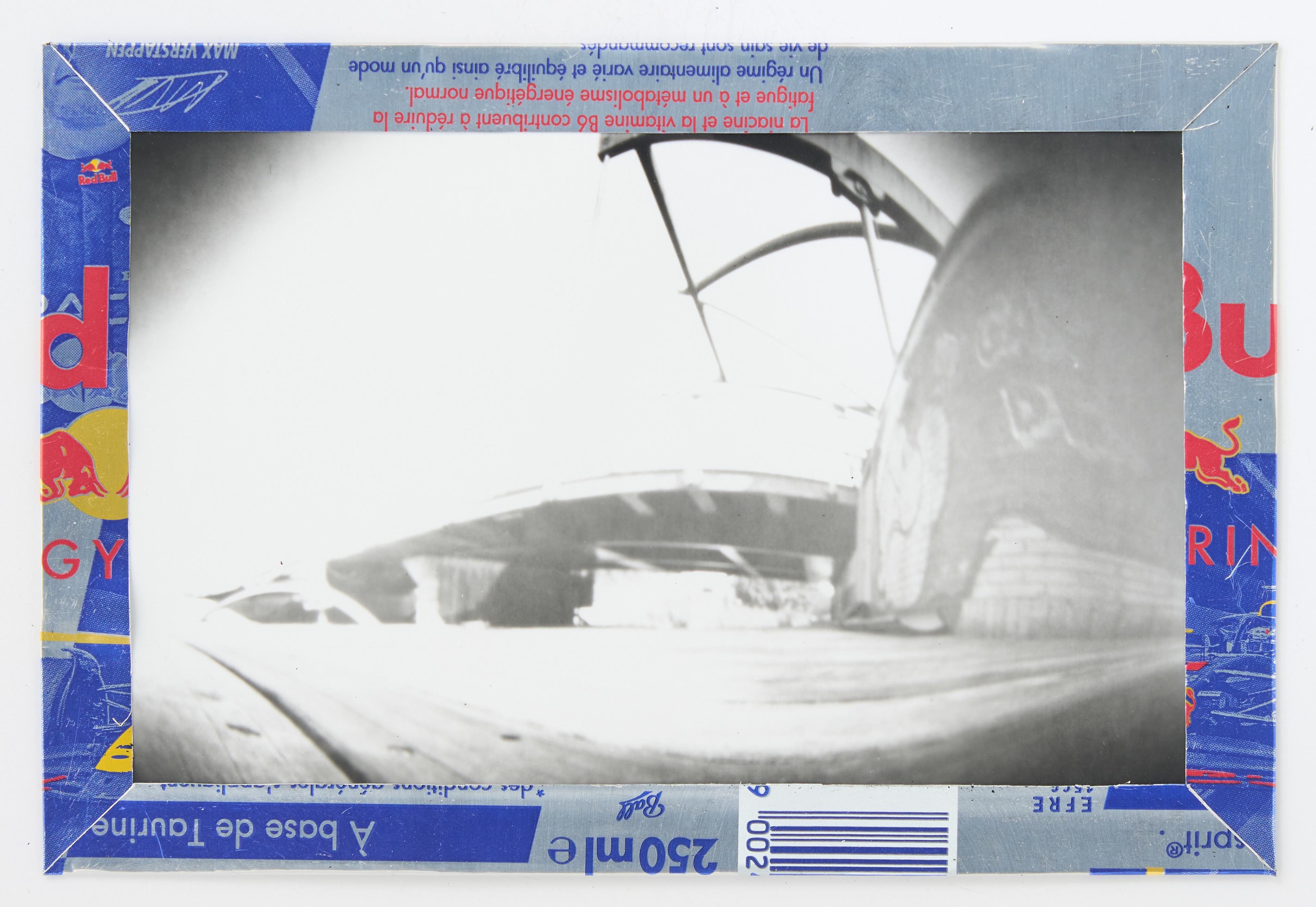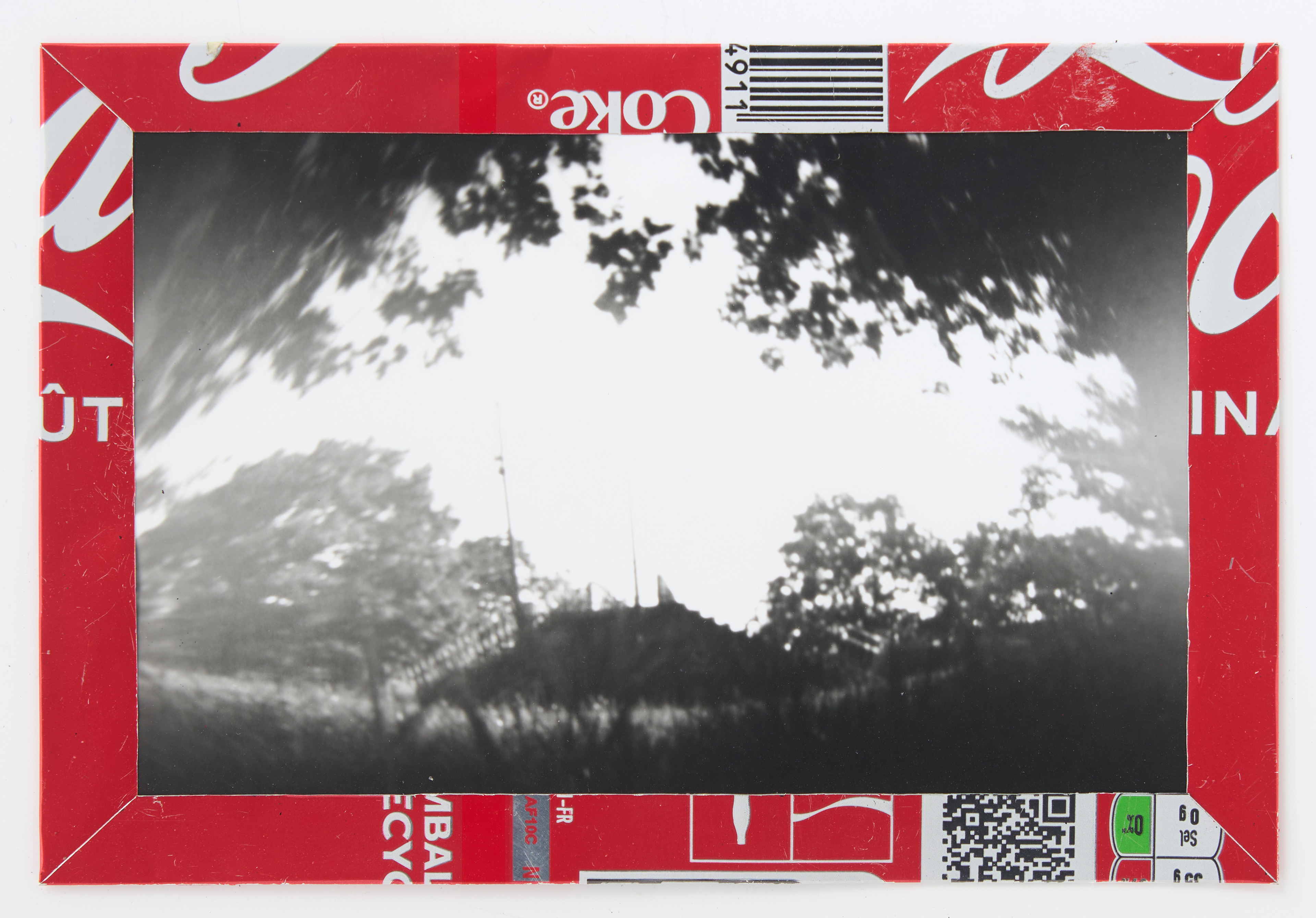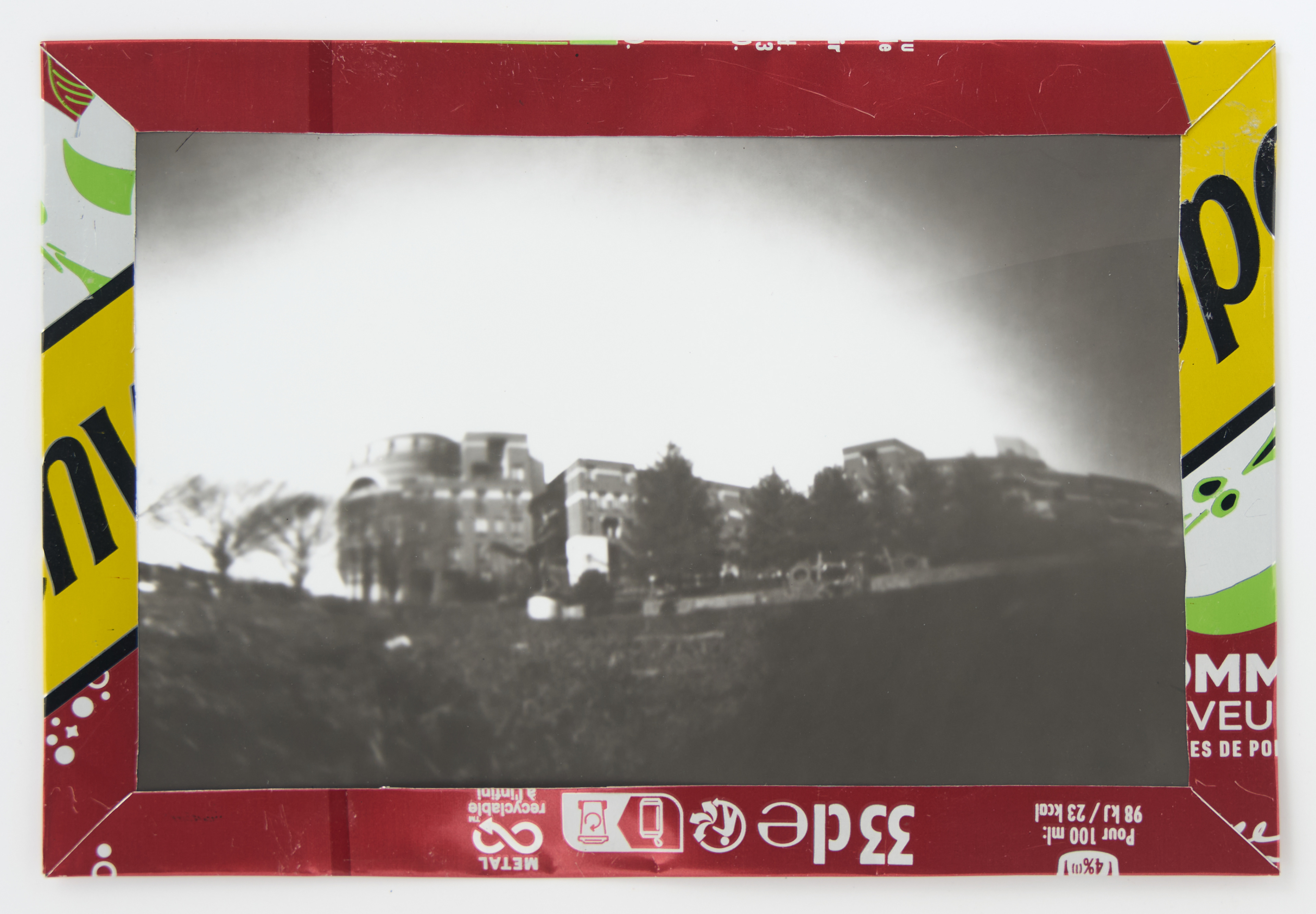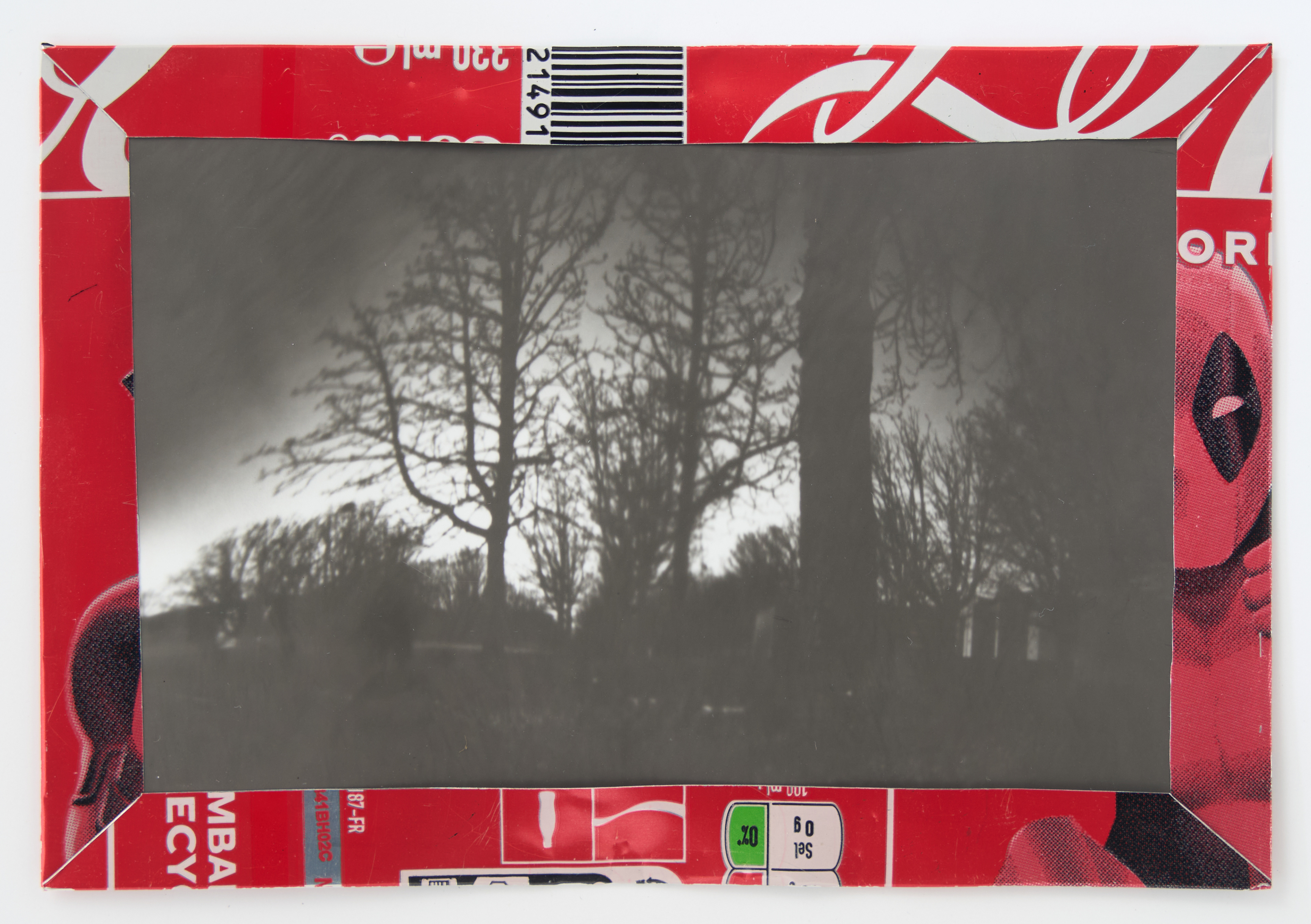 La canette sert ensuite d’encadrement à sa photographie, découpée et pliée ; ainsi ce cadre devient une extension du processus, cherchant à optimiser son recyclage.