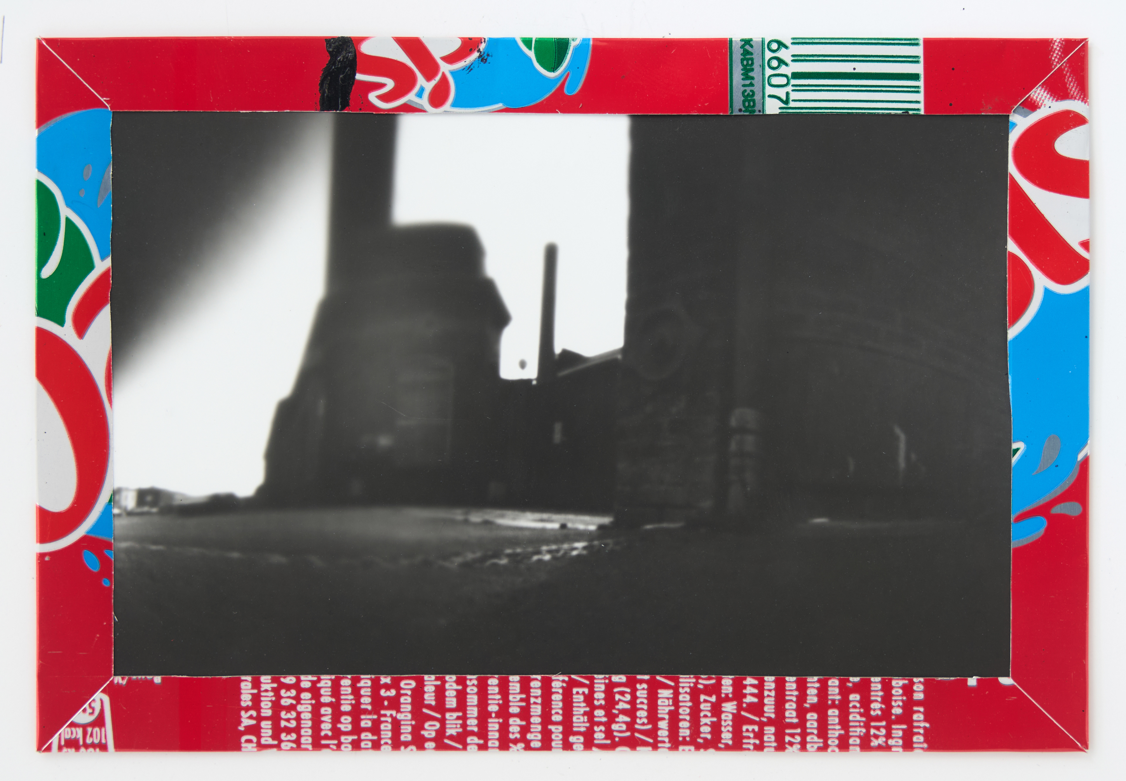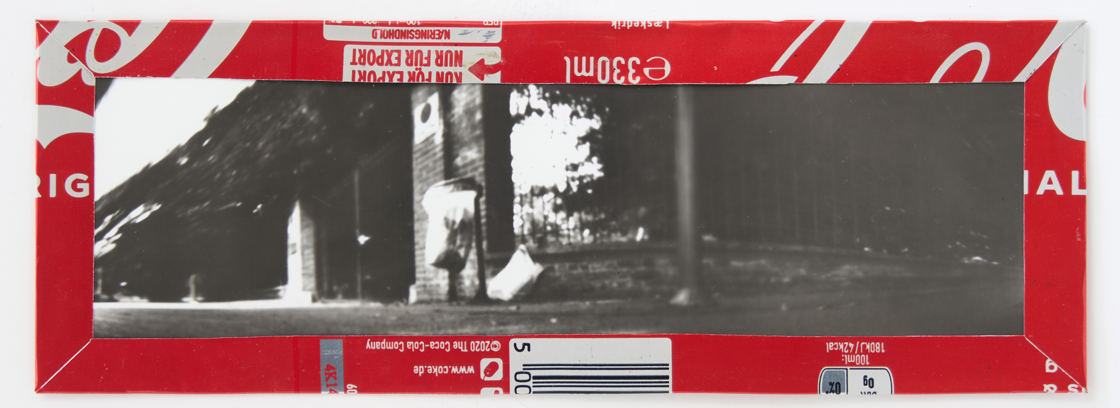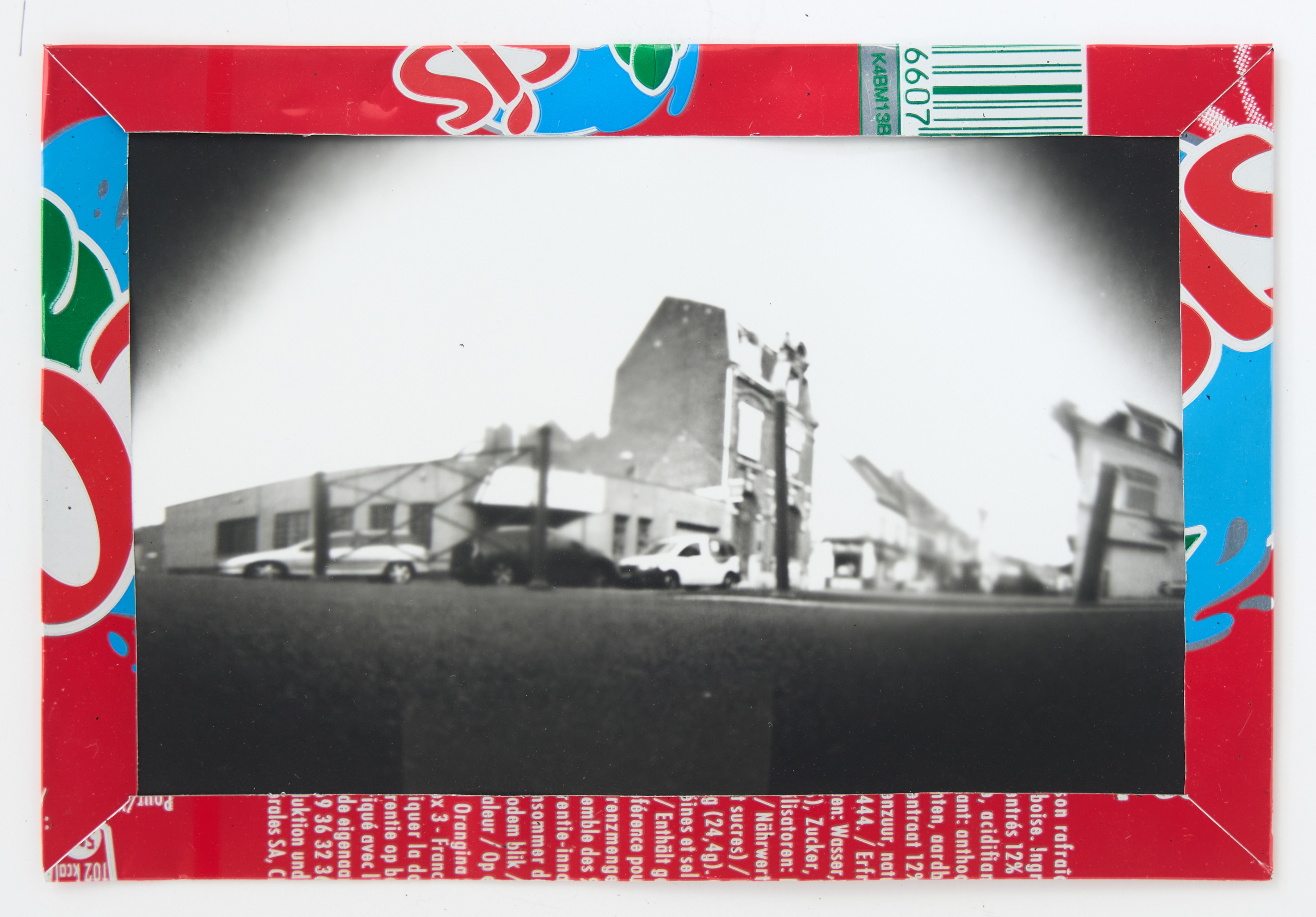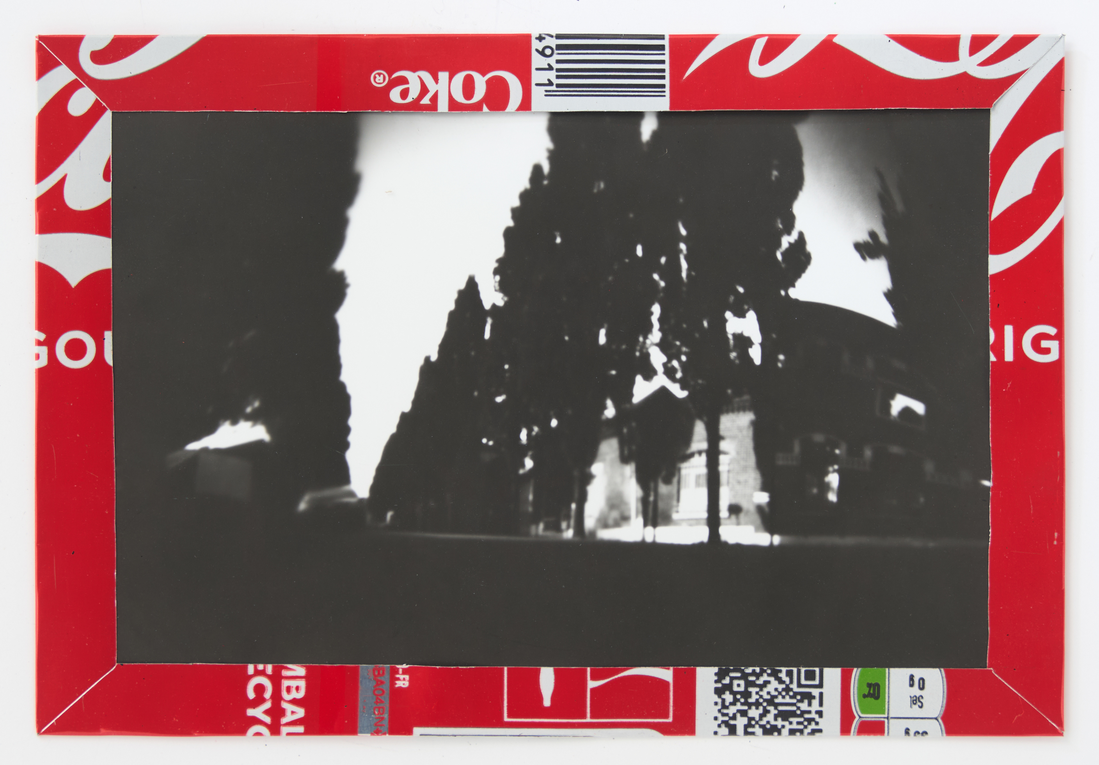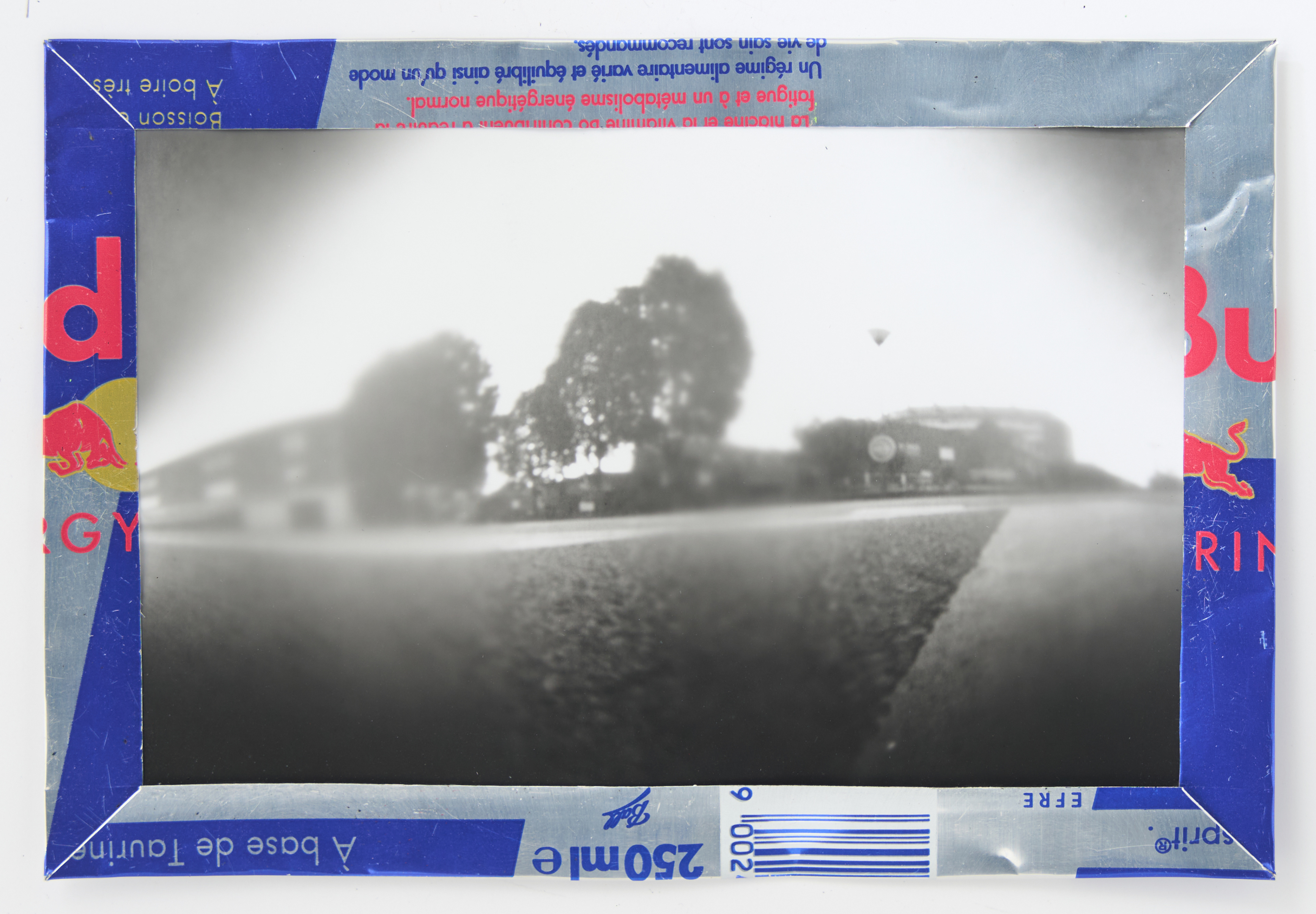 La canette sert ensuite d’encadrement à sa photographie, découpée et pliée ; ainsi ce cadre devient une extension du processus, cherchant à optimiser son recyclage.