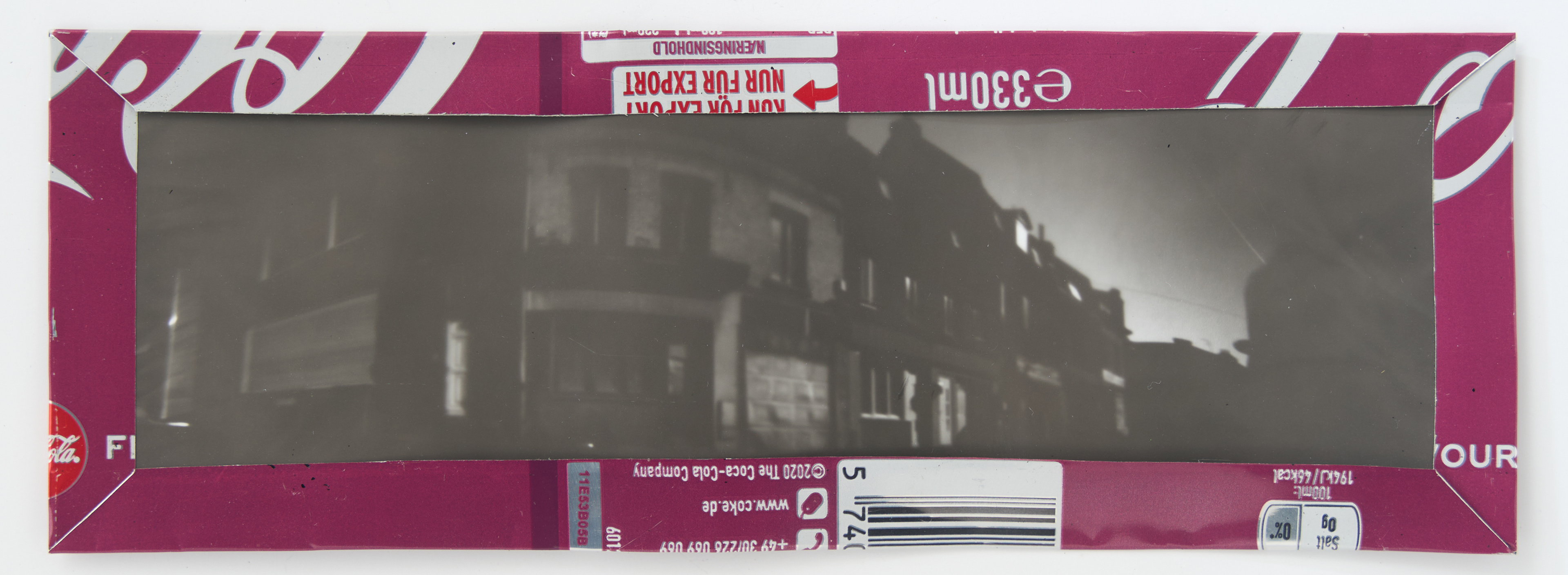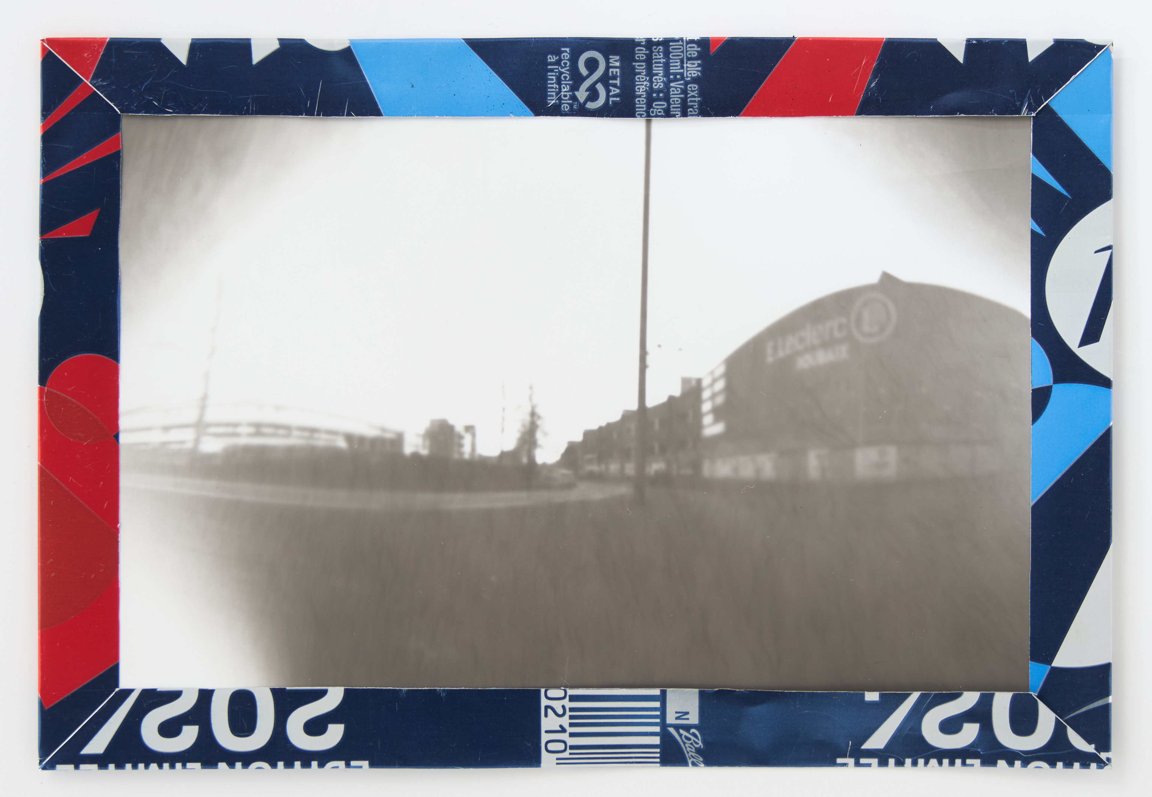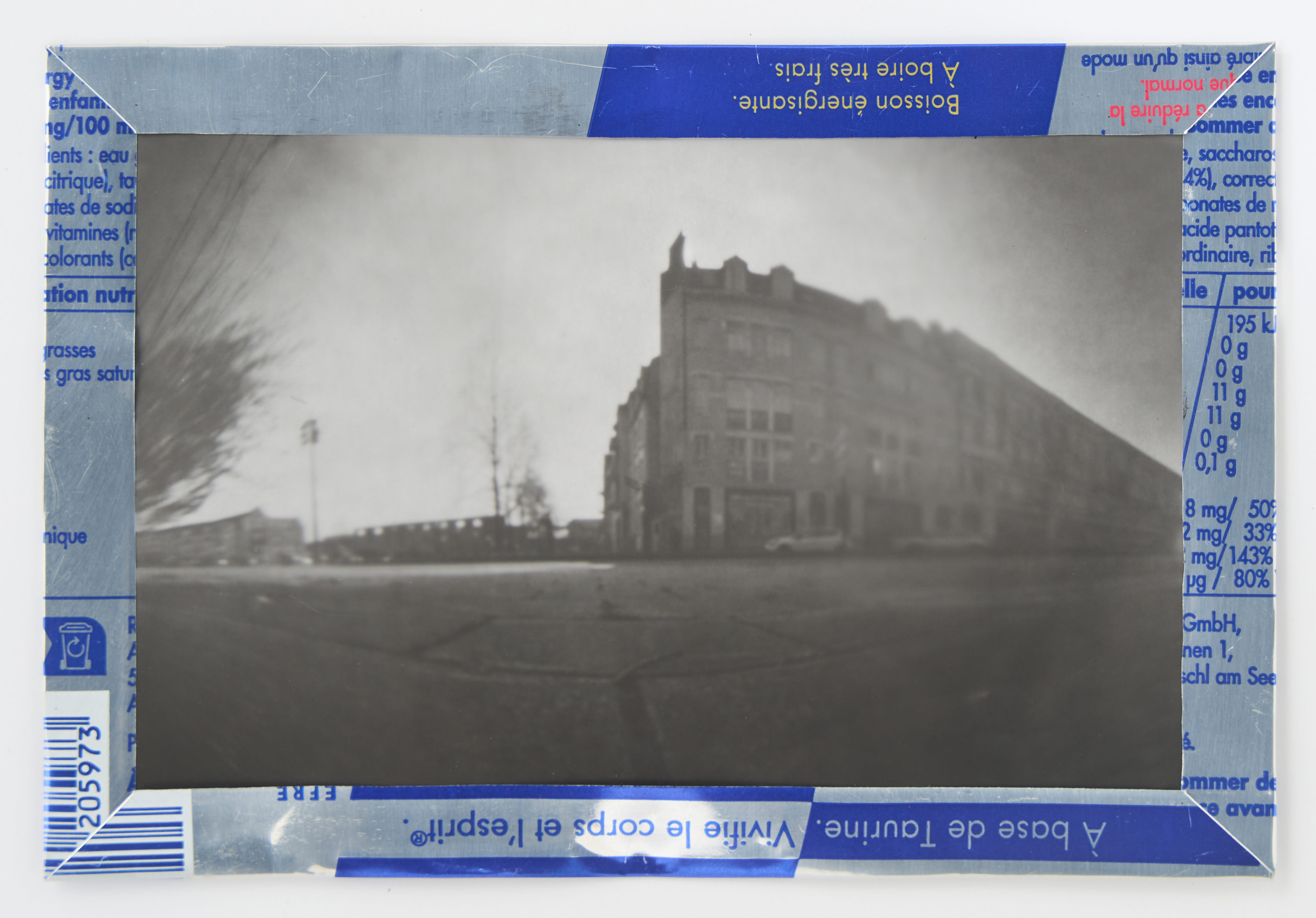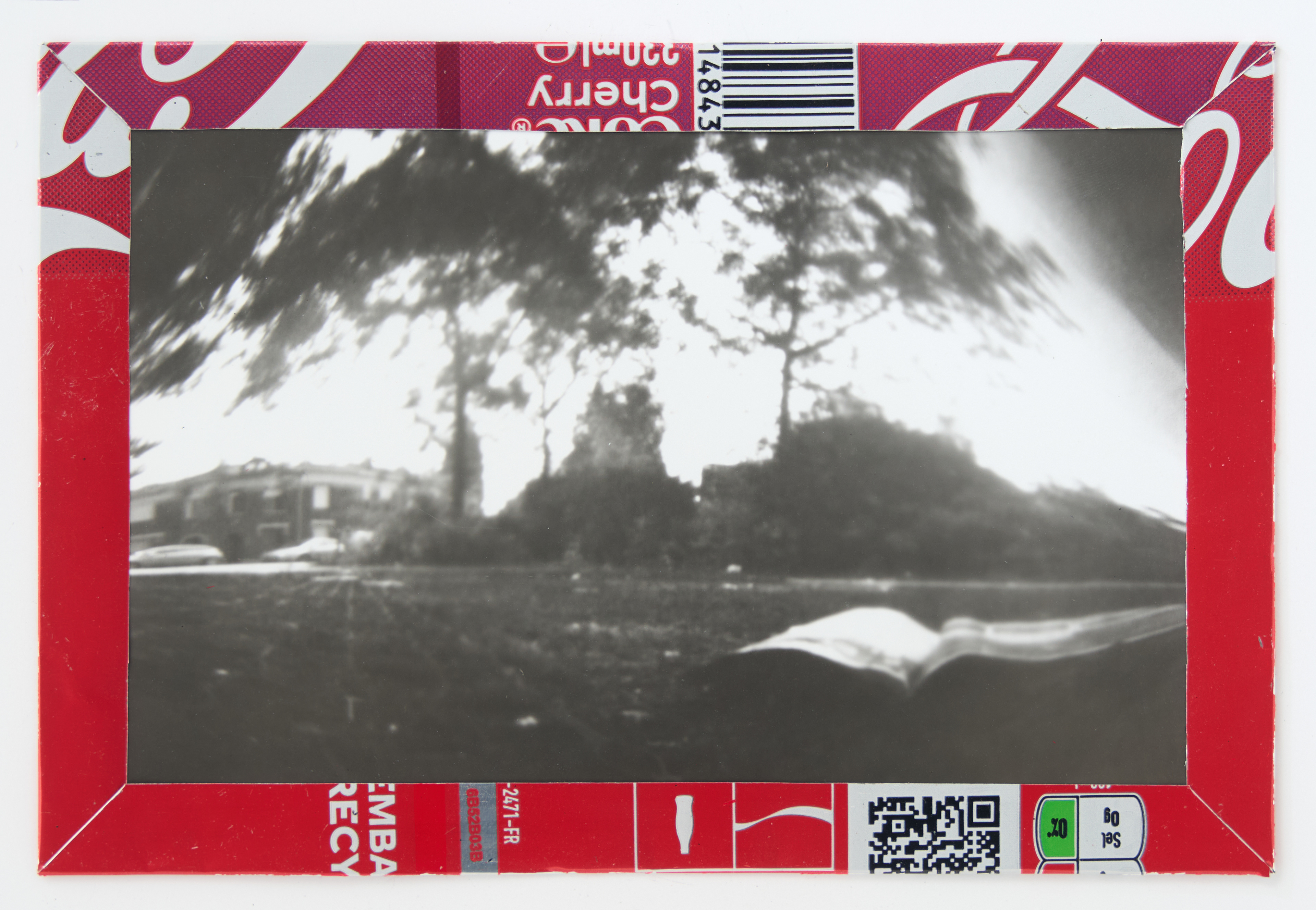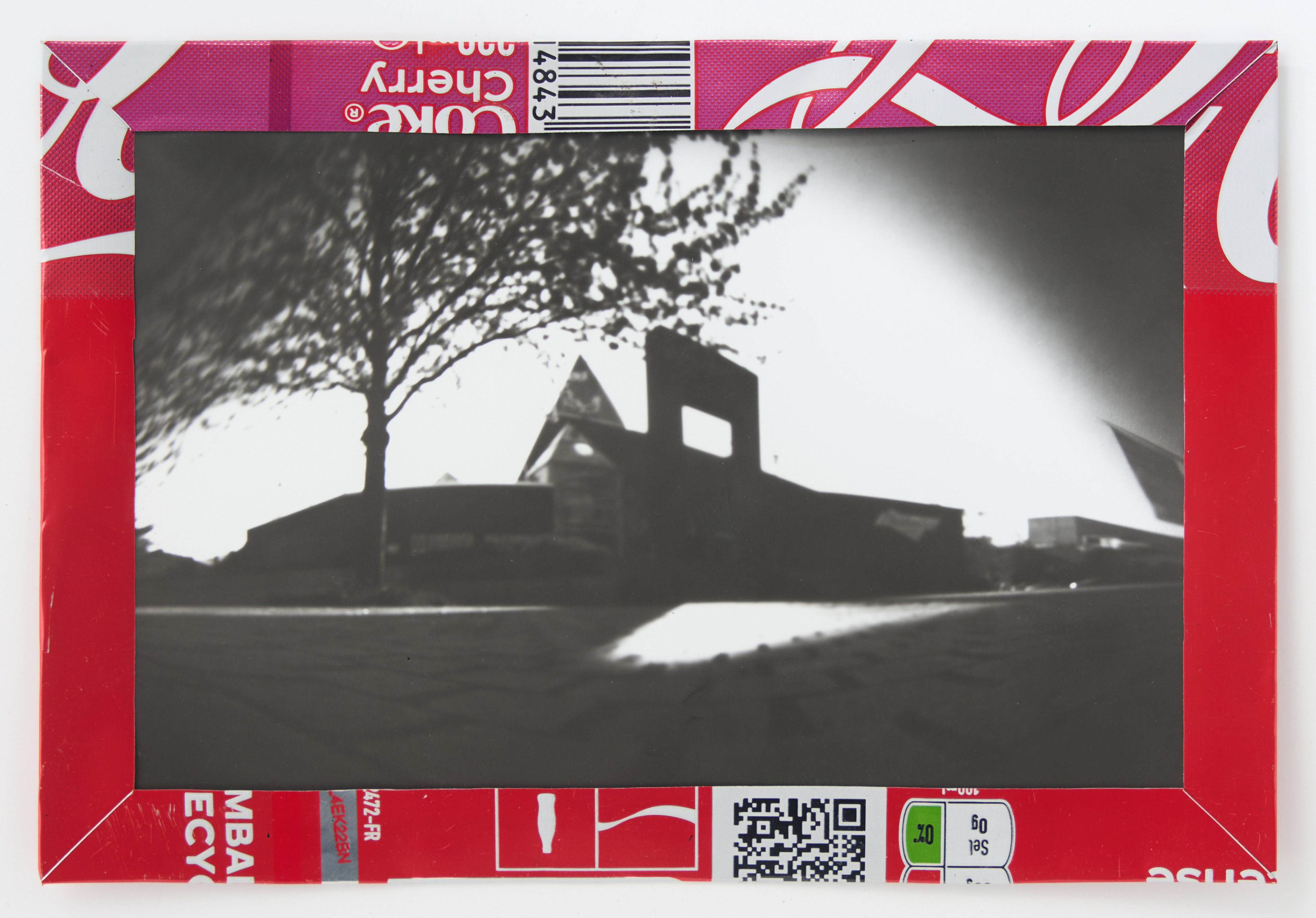 La canette sert ensuite d’encadrement à sa photographie, découpée et pliée ; ainsi ce cadre devient une extension du processus, cherchant à optimiser son recyclage.