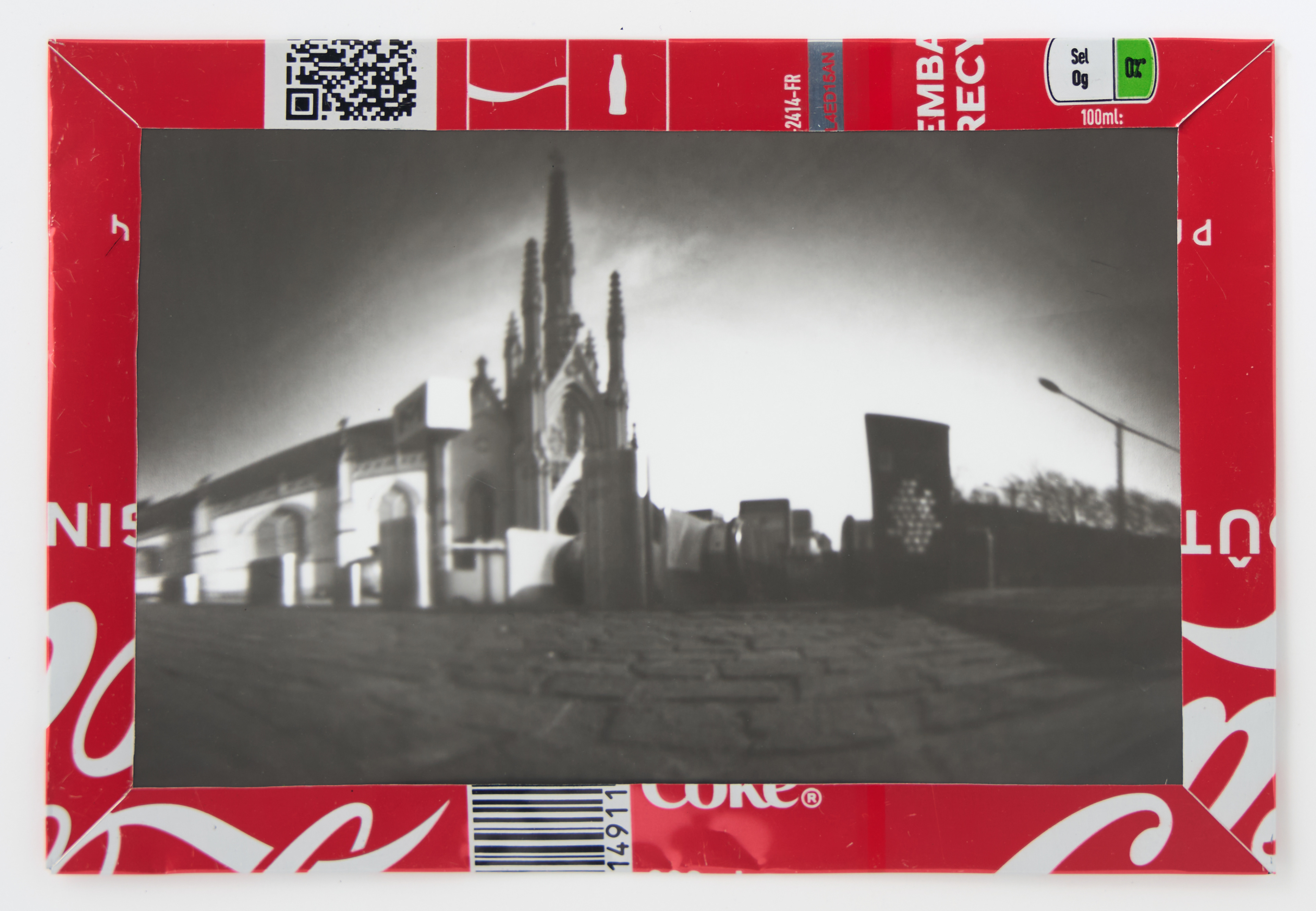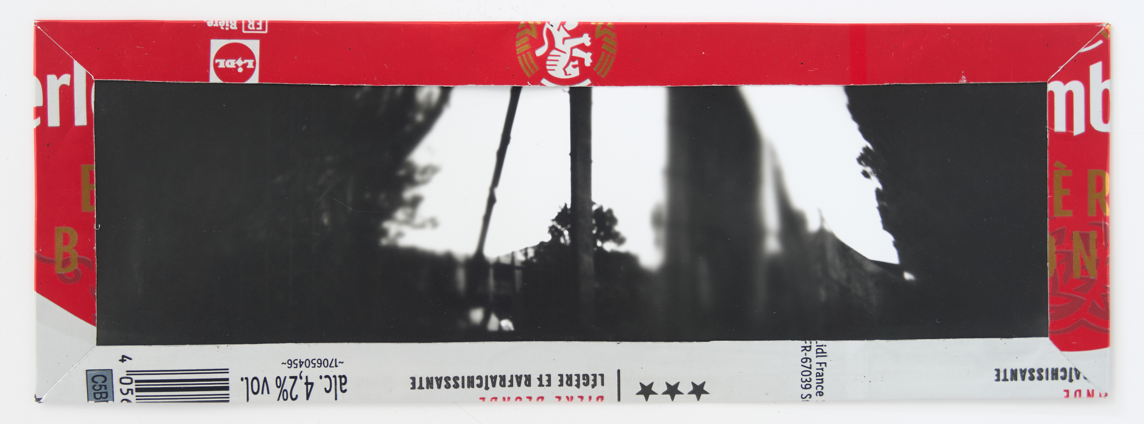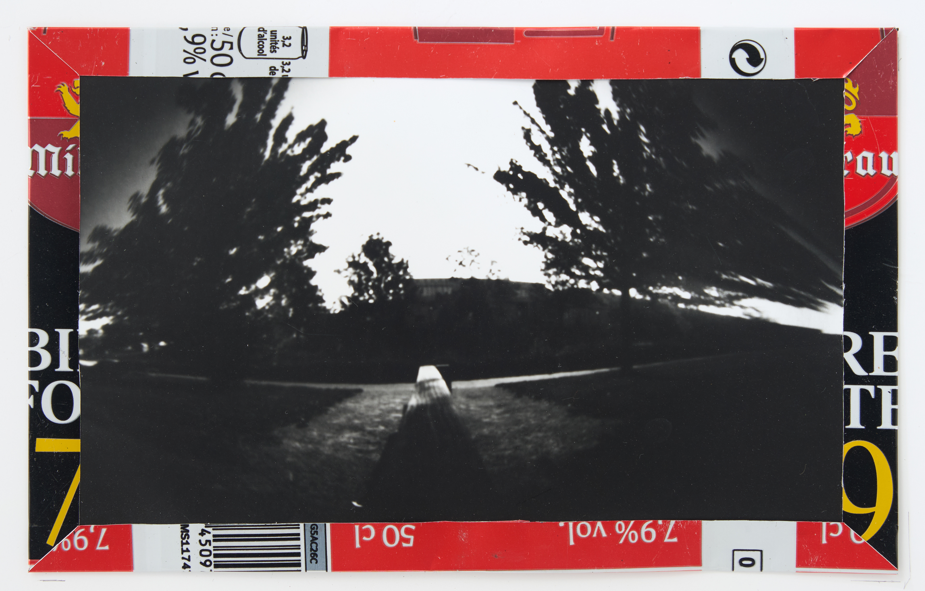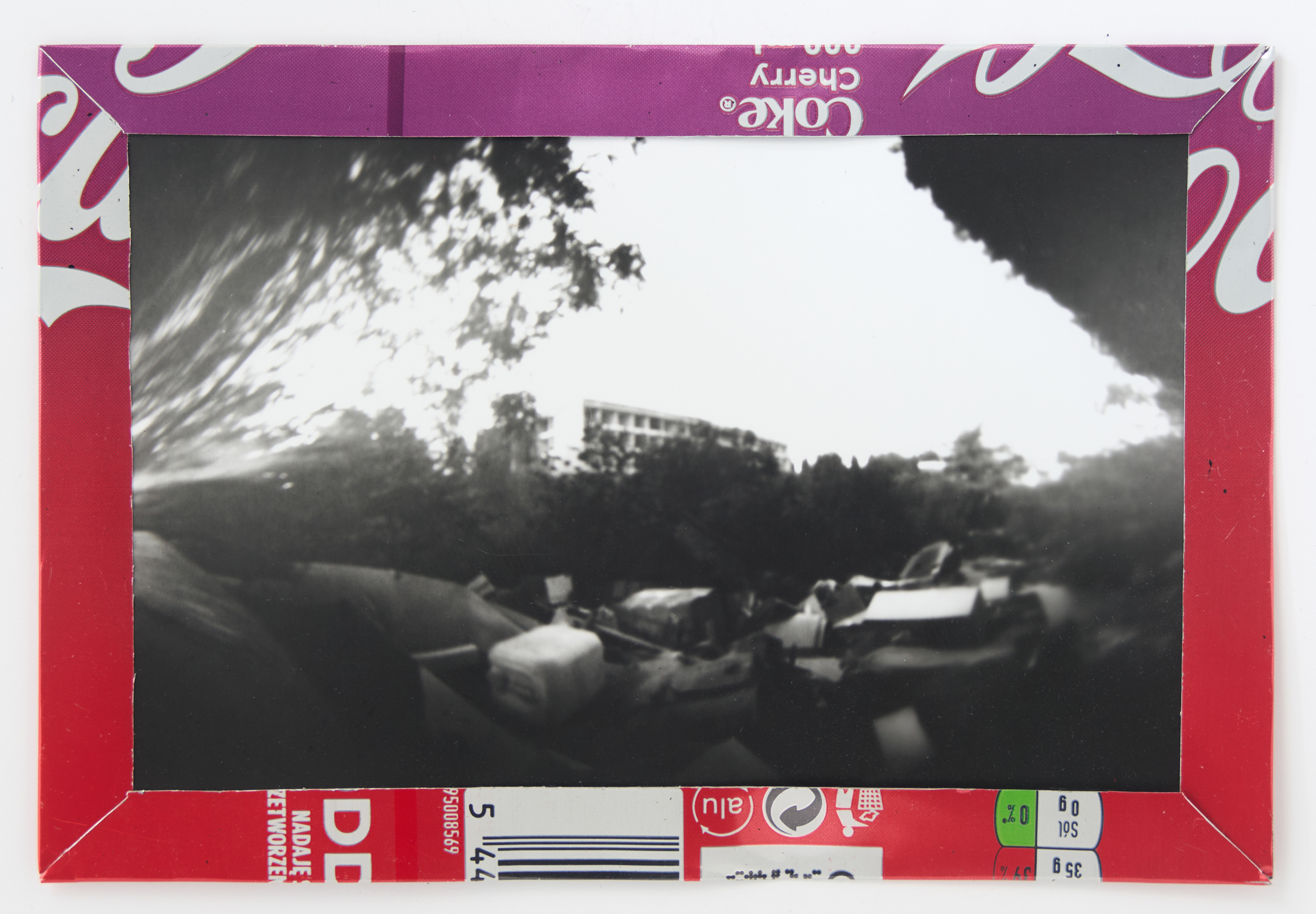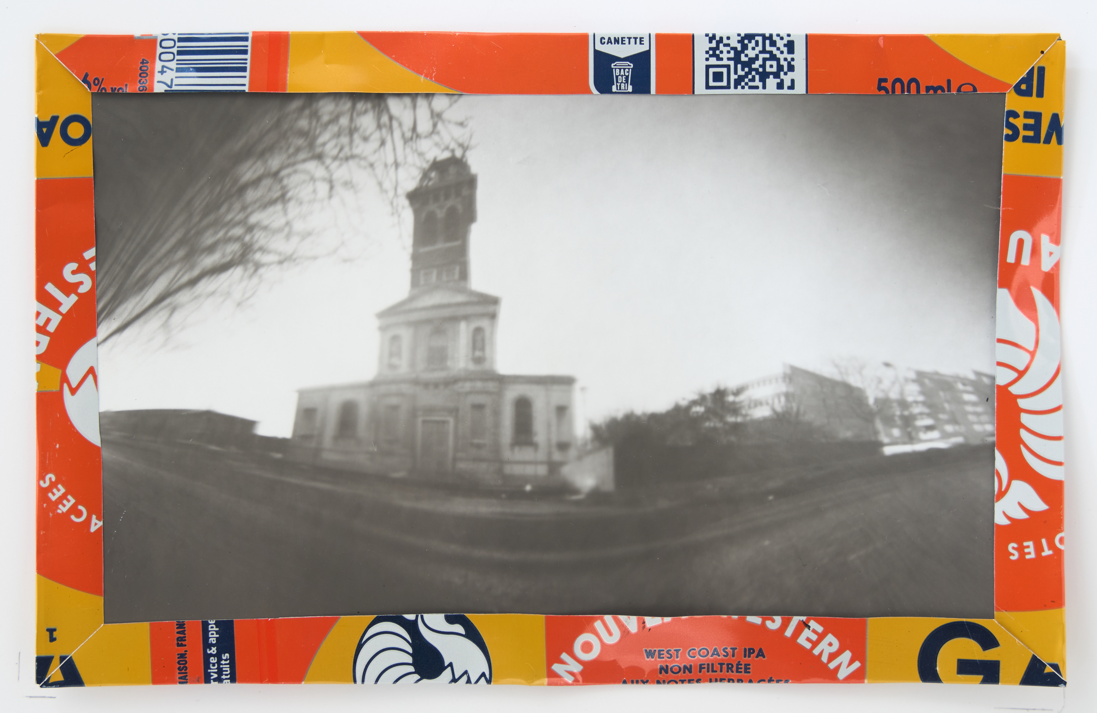 La canette sert ensuite d’encadrement à sa photographie, découpée et pliée ; ainsi ce cadre devient une extension du processus, cherchant à optimiser son recyclage.