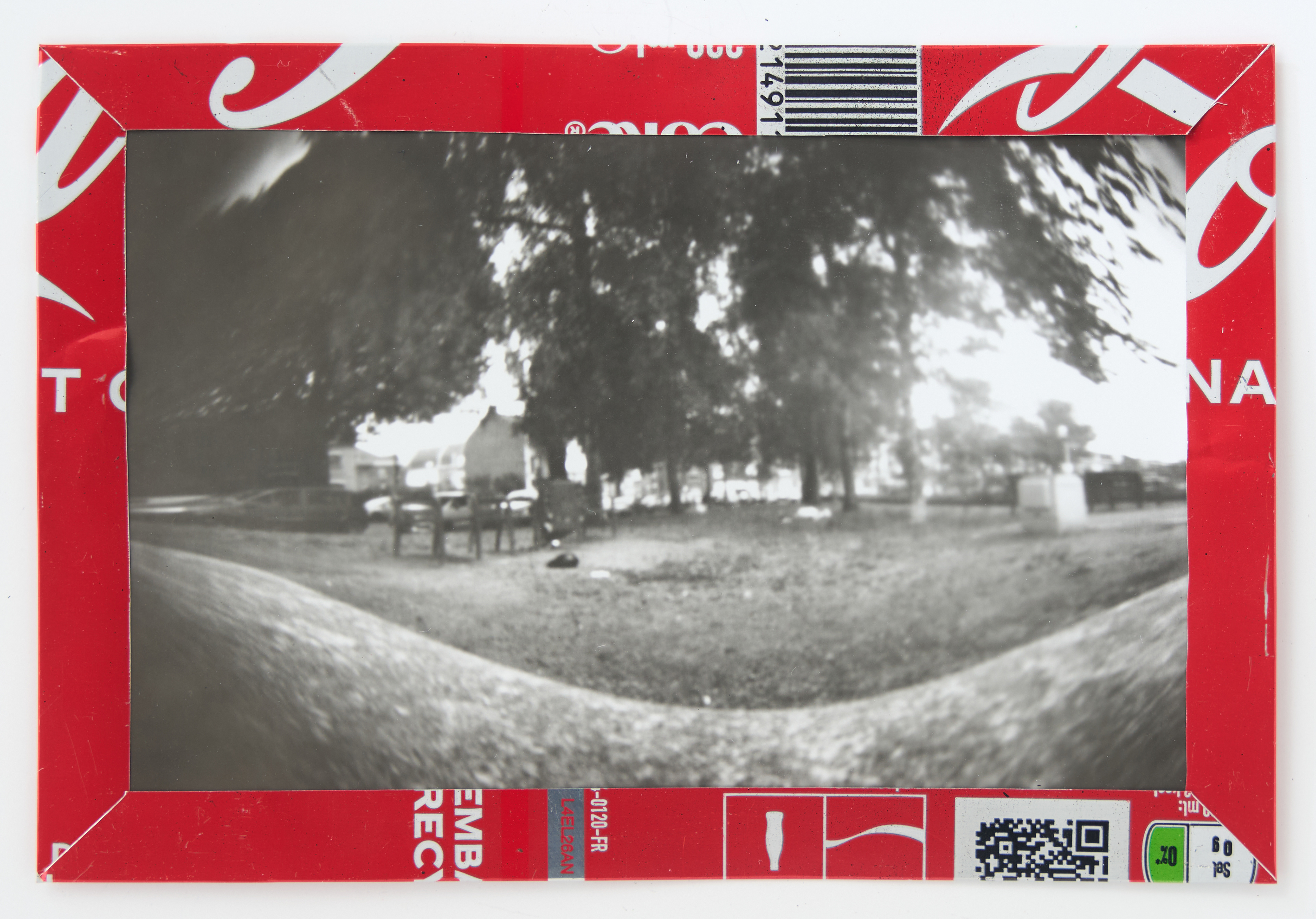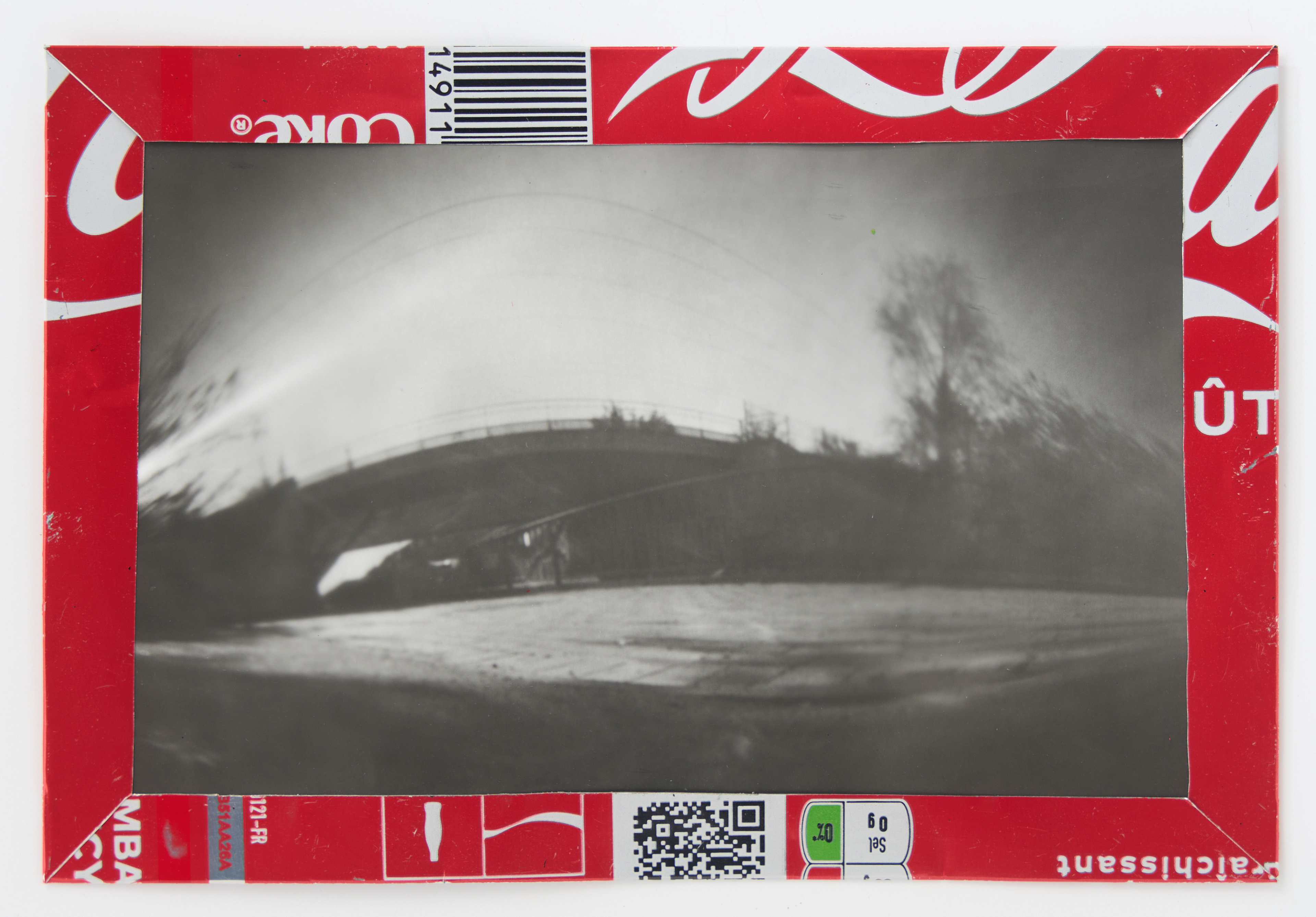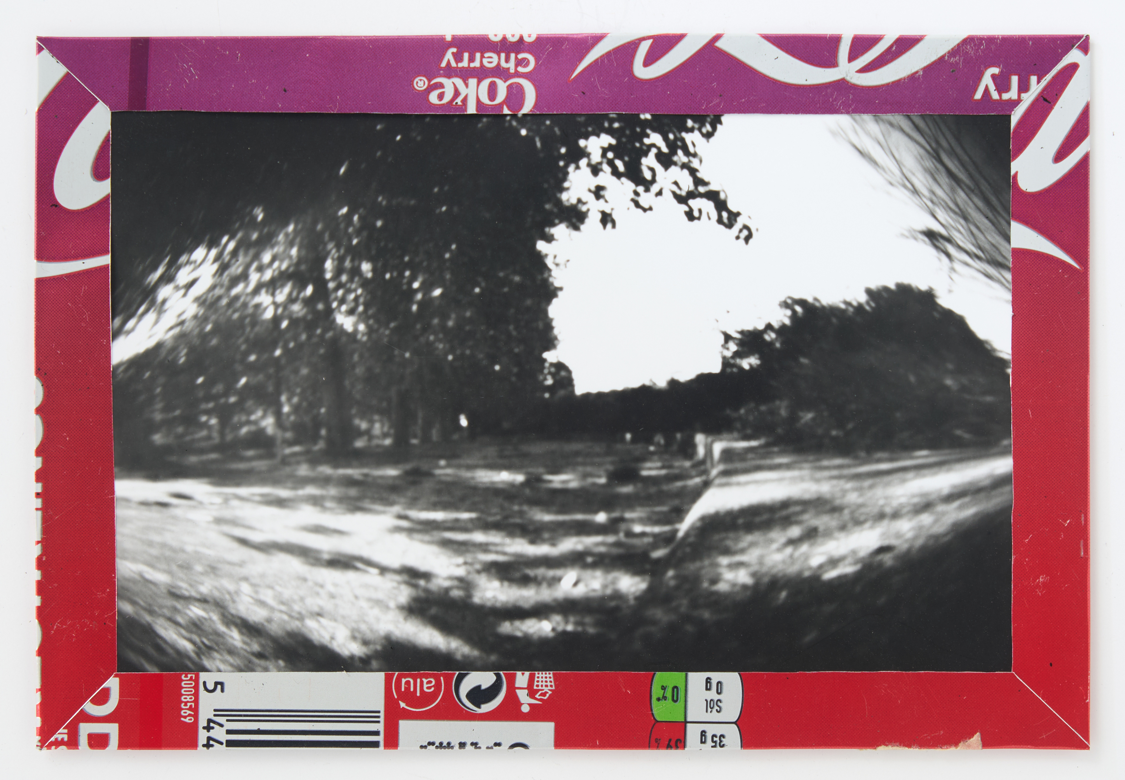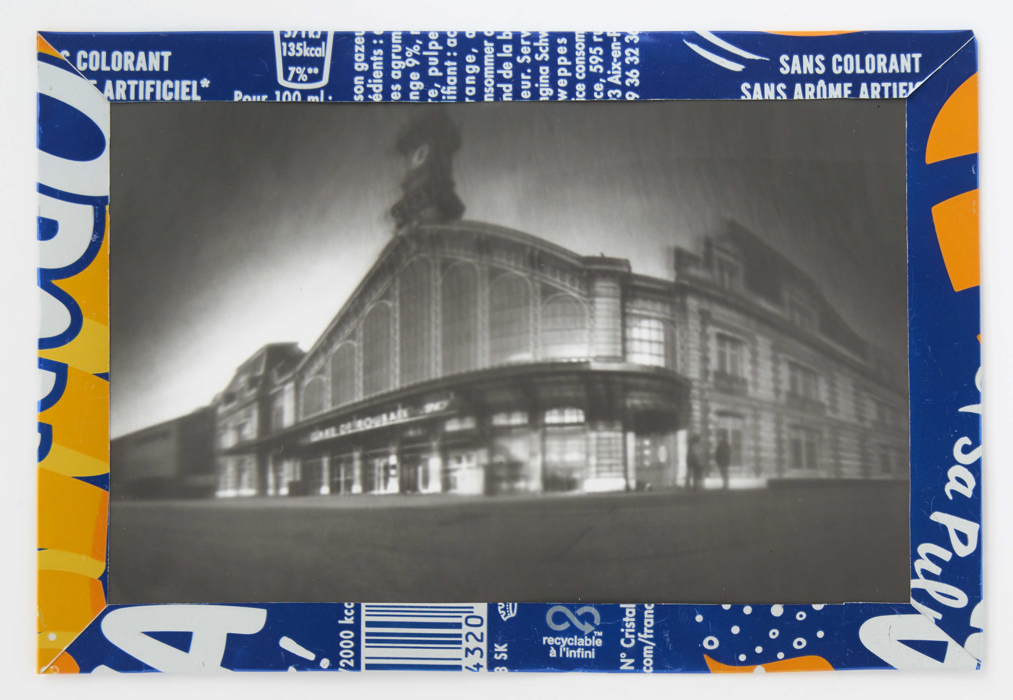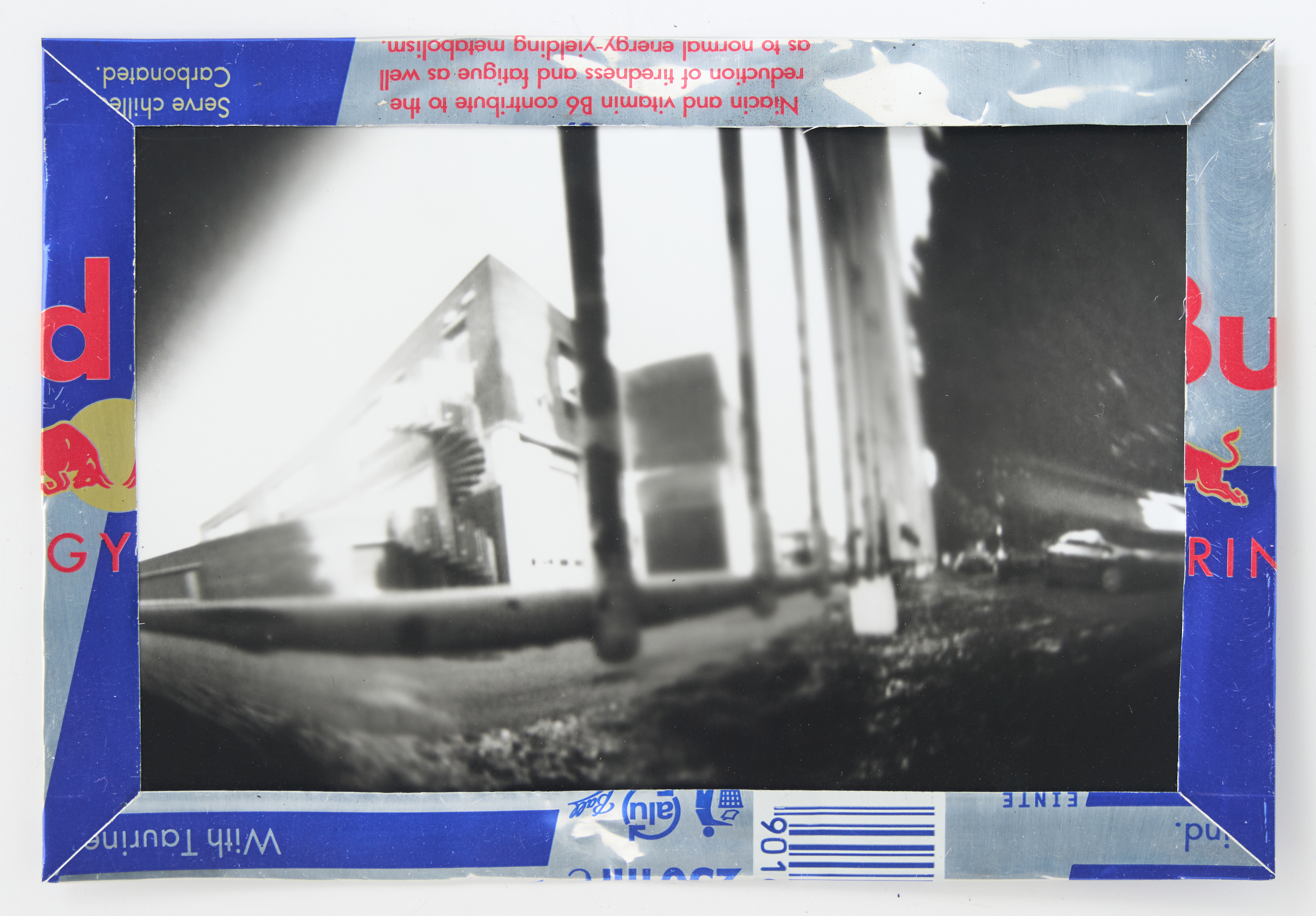 La canette sert ensuite d’encadrement à sa photographie, découpée et pliée ; ainsi ce cadre devient une extension du processus, cherchant à optimiser son recyclage.