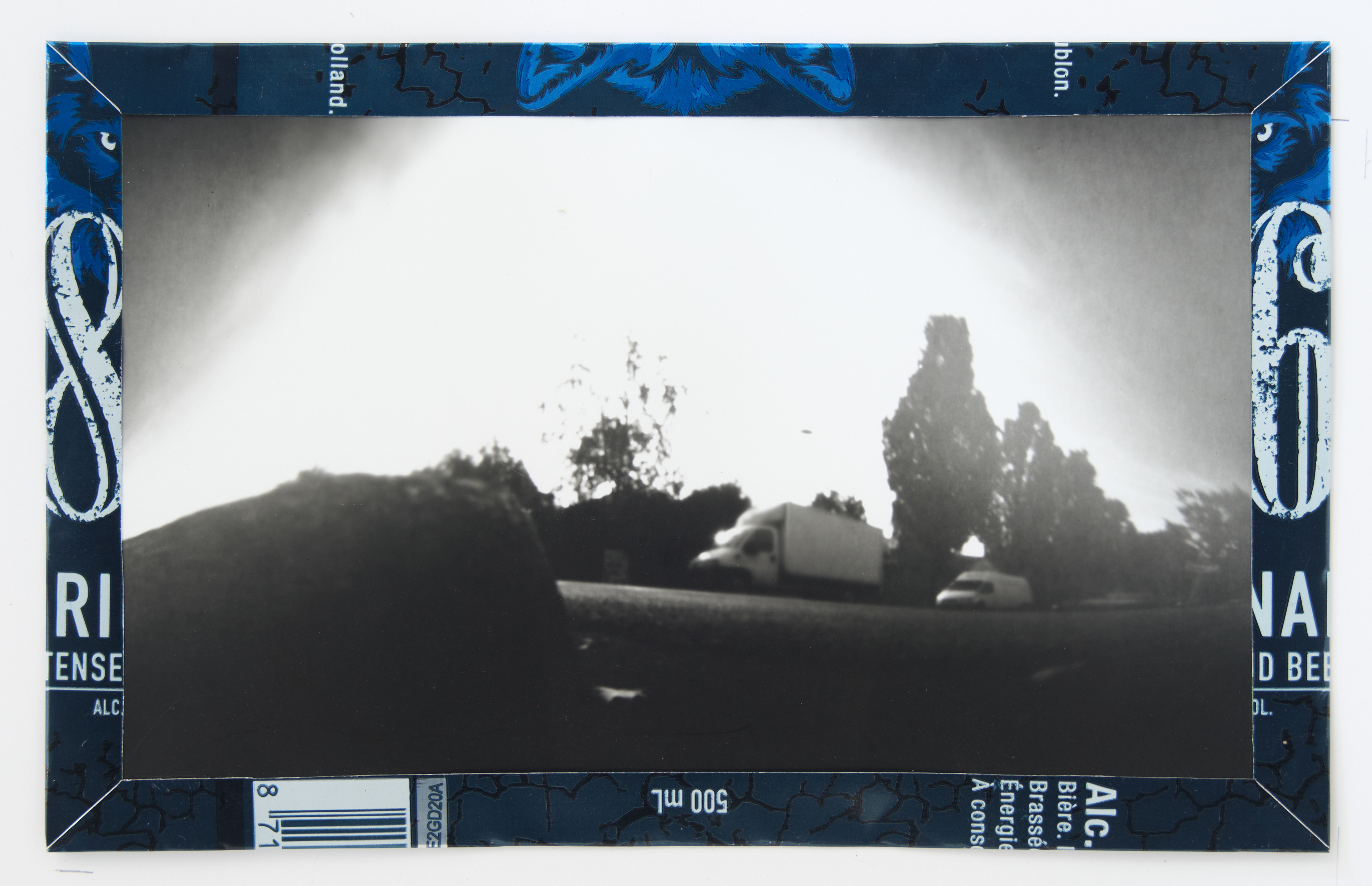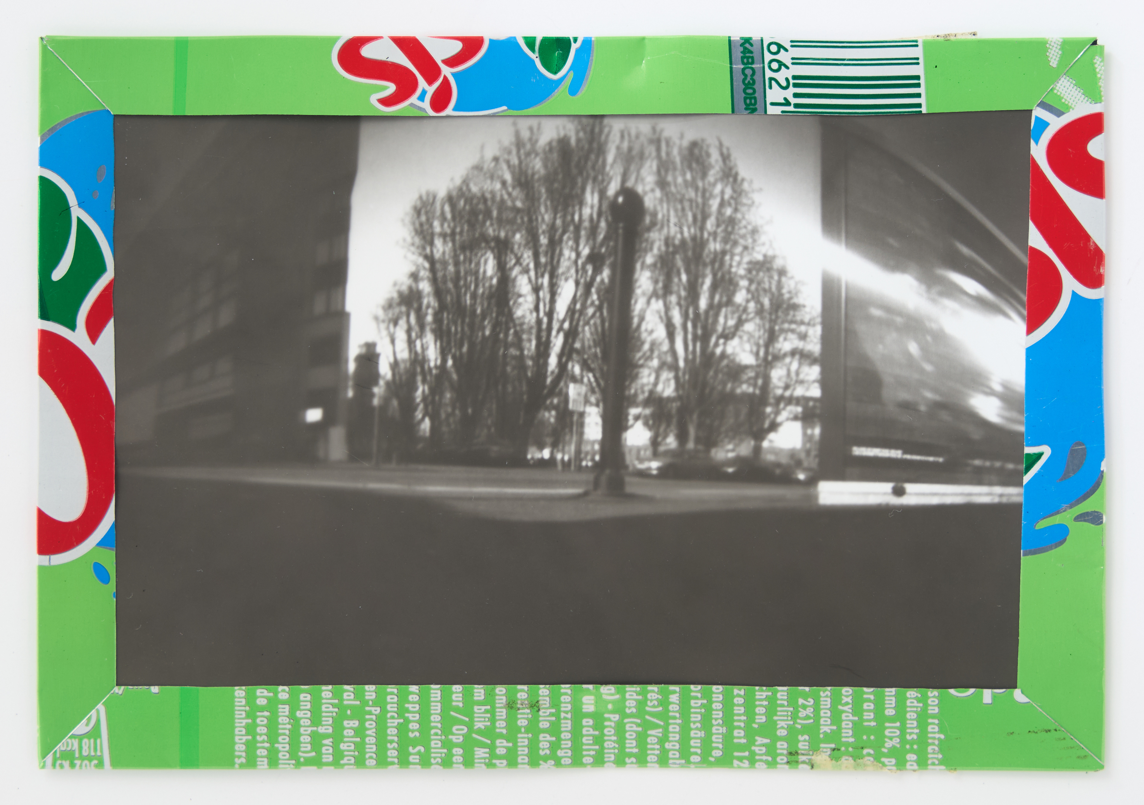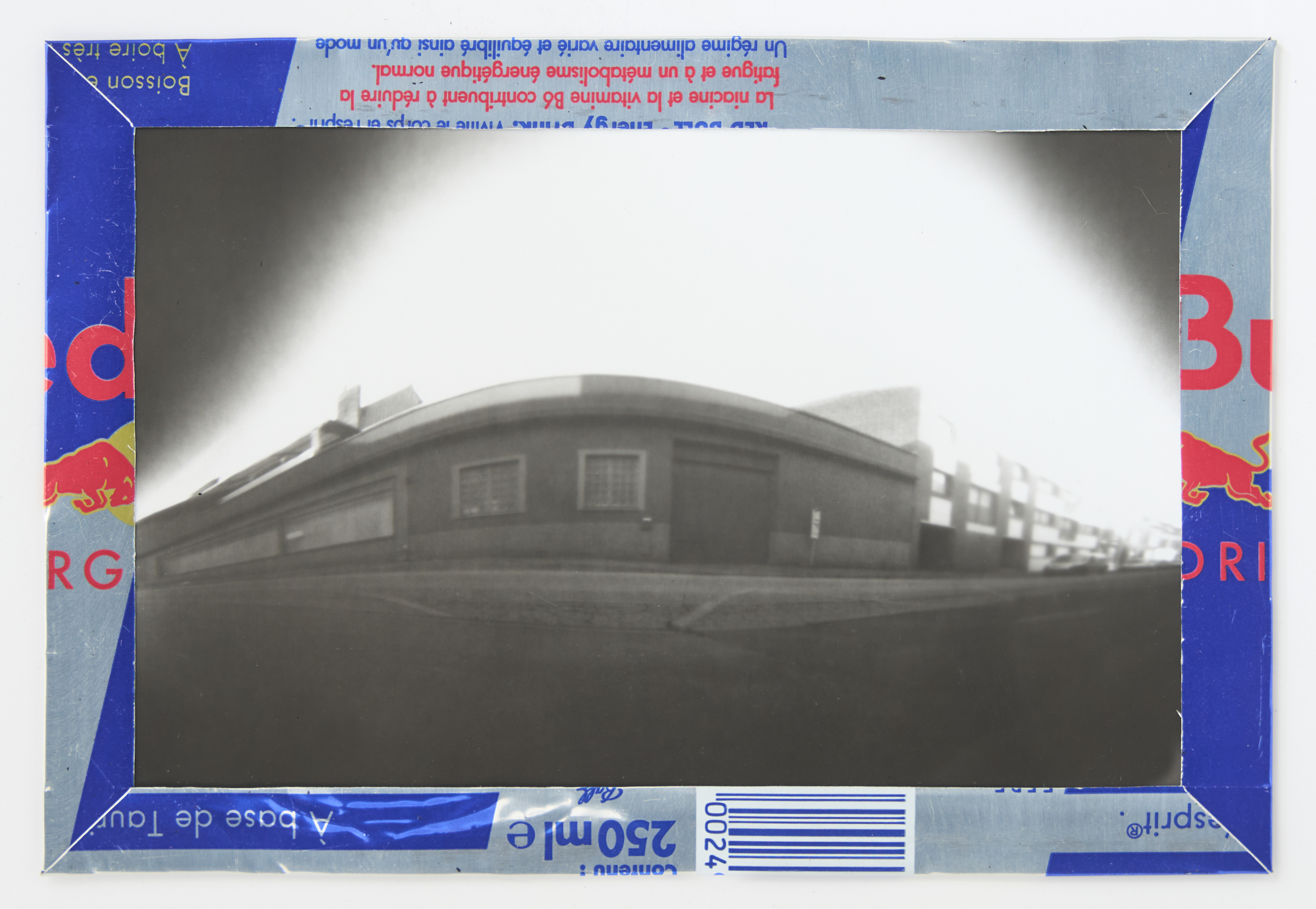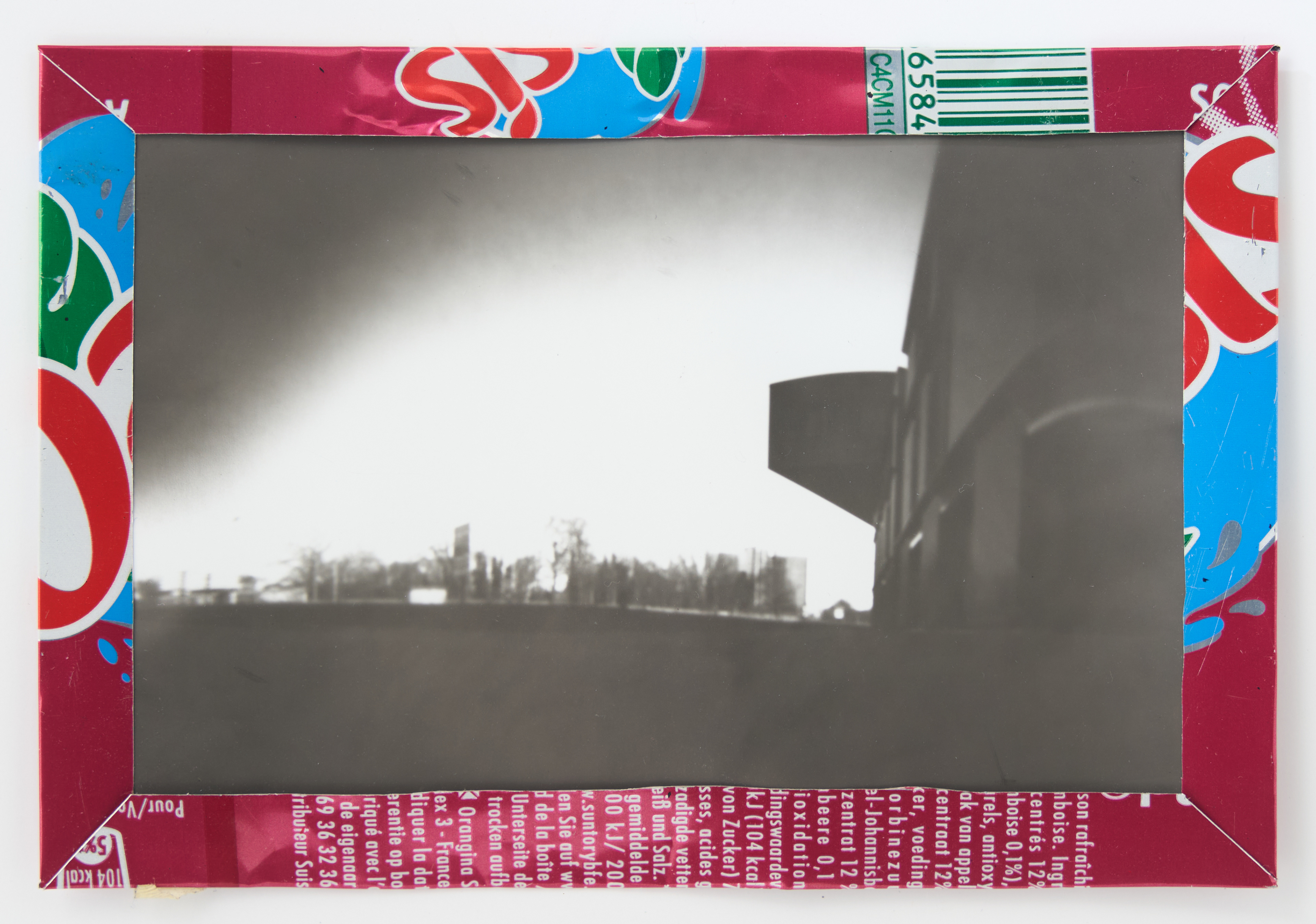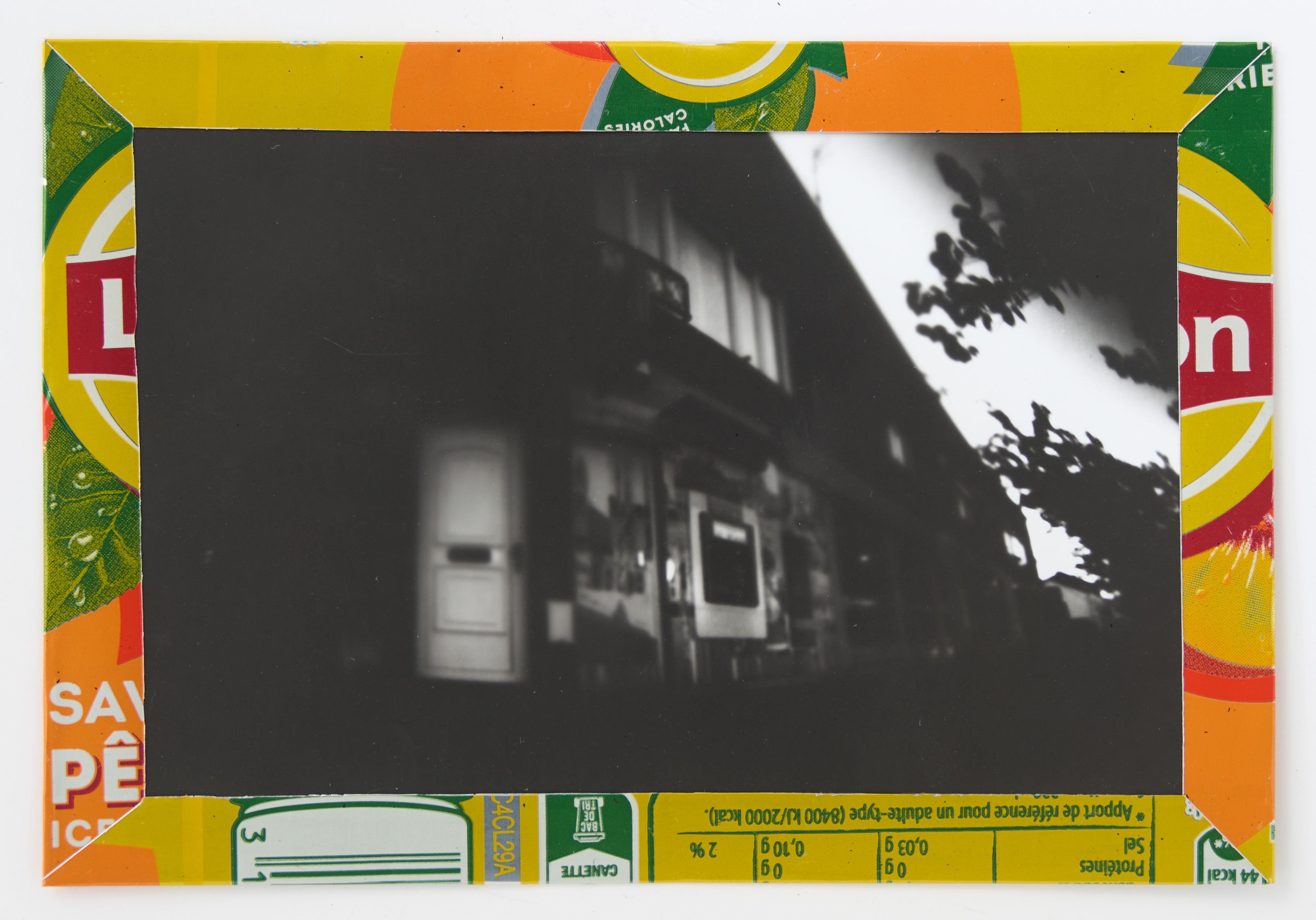La canette sert ensuite d’encadrement à sa photographie, découpée et pliée ; ainsi ce cadre devient une extension du processus, cherchant à optimiser son recyclage.