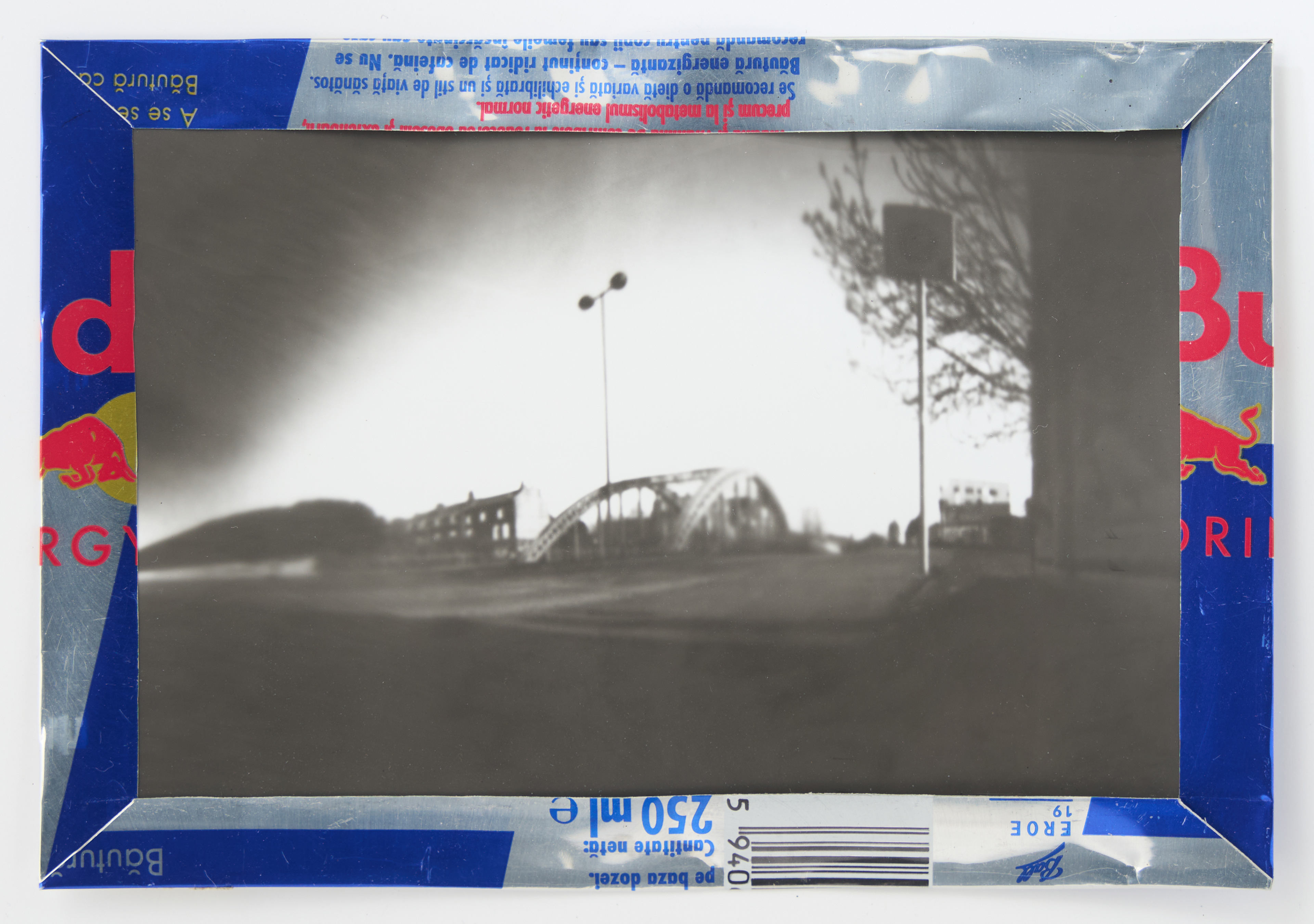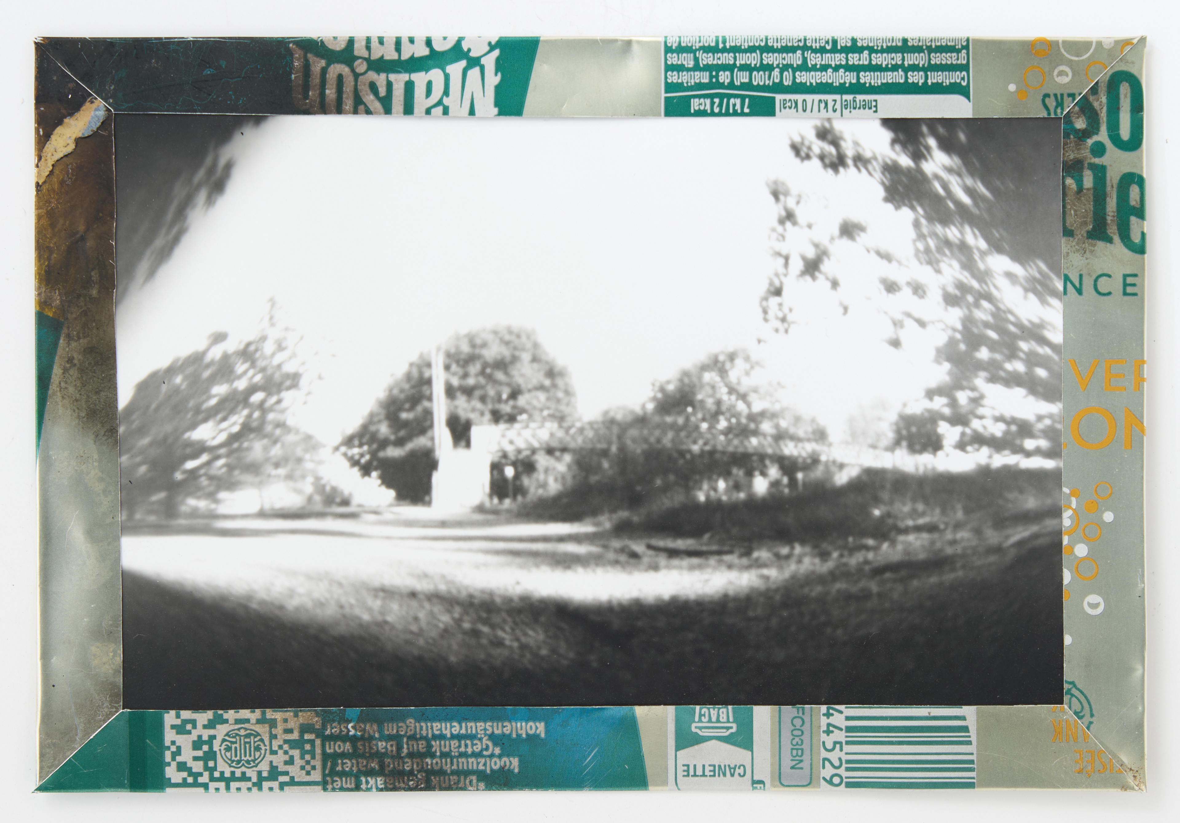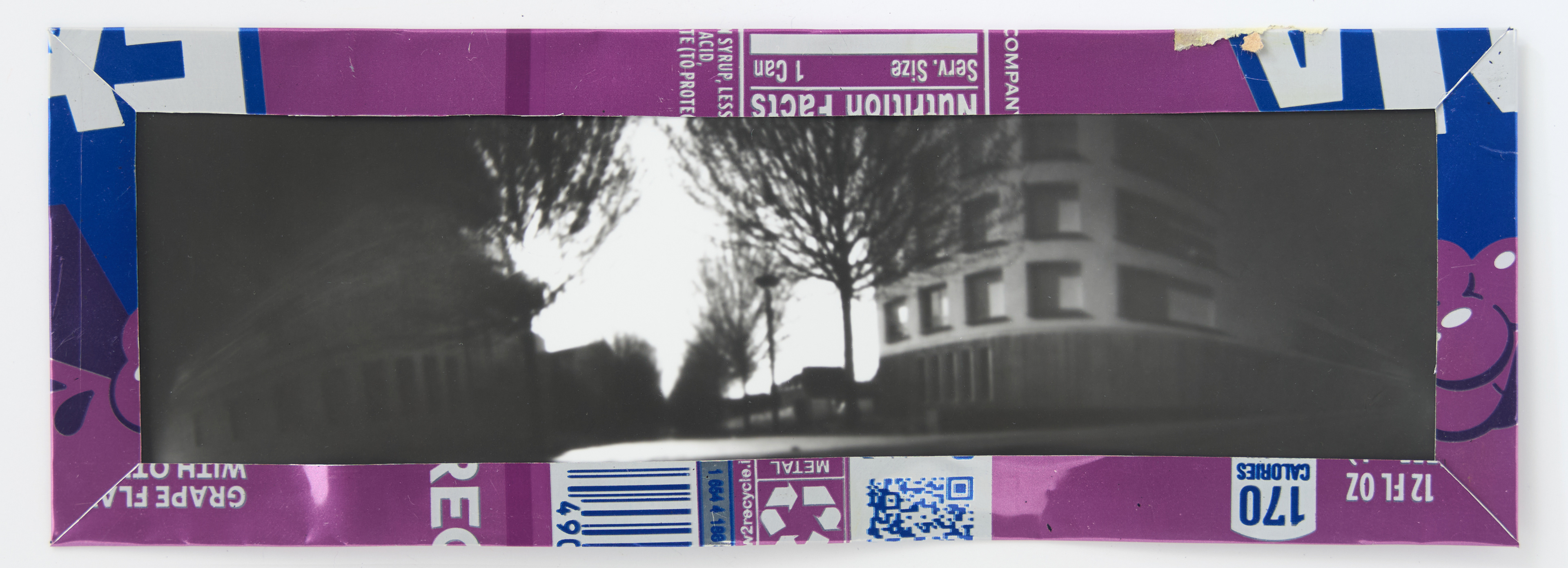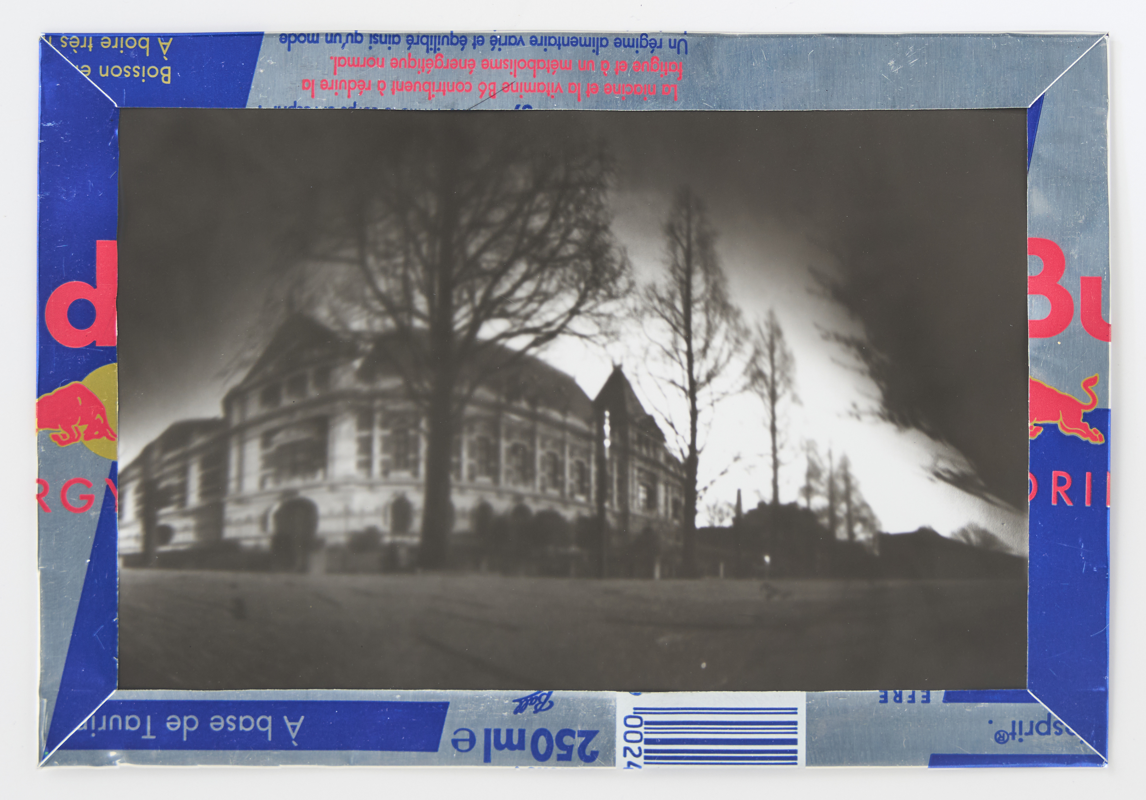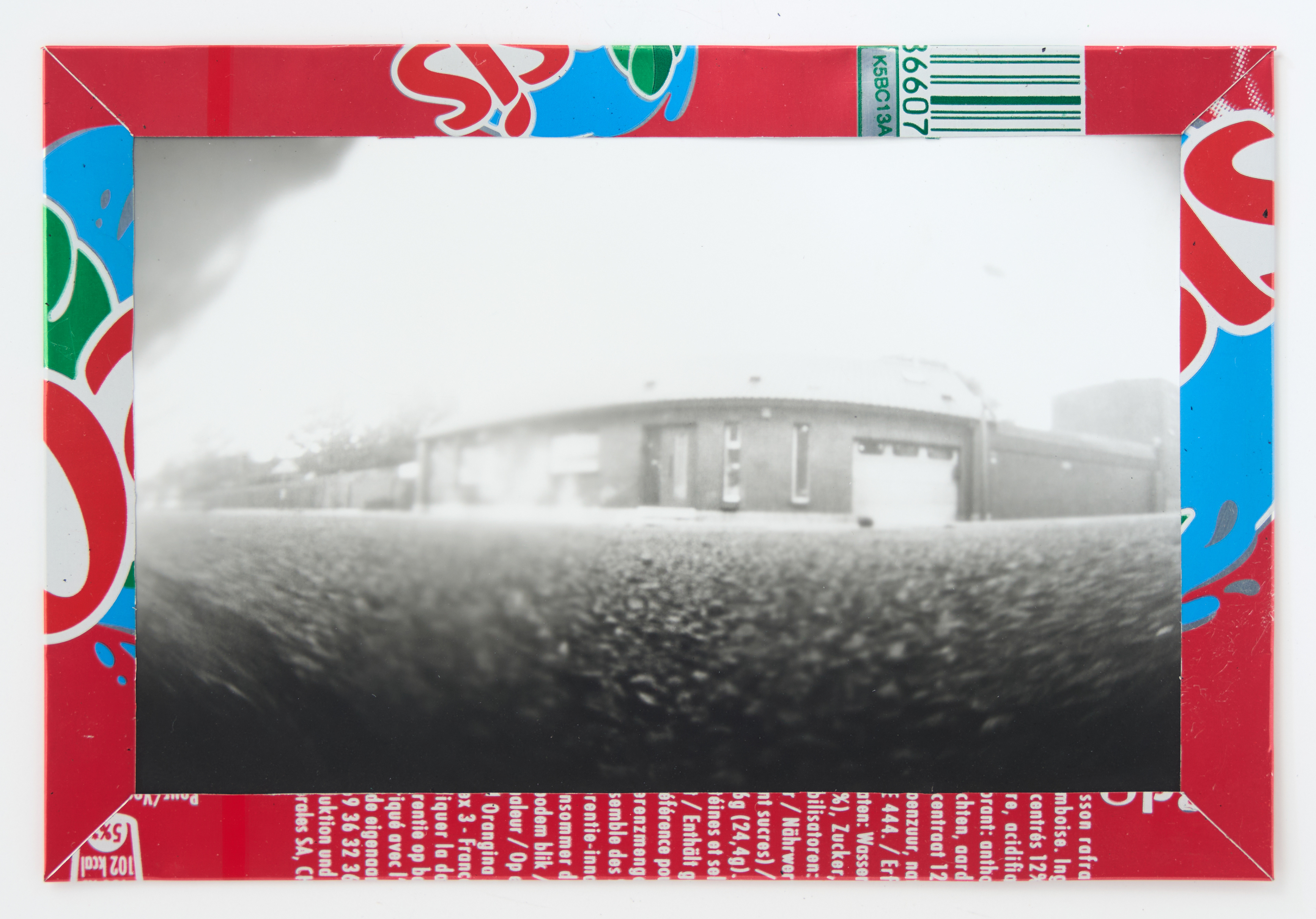 La canette sert ensuite d’encadrement à sa photographie, découpée et pliée ; ainsi ce cadre devient une extension du processus, cherchant à optimiser son recyclage.