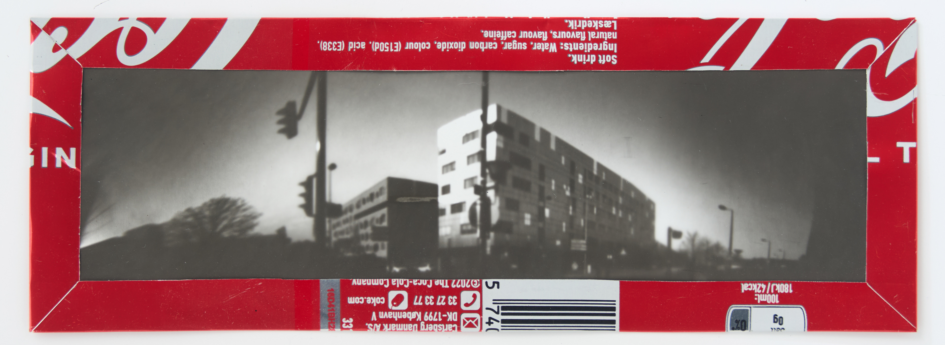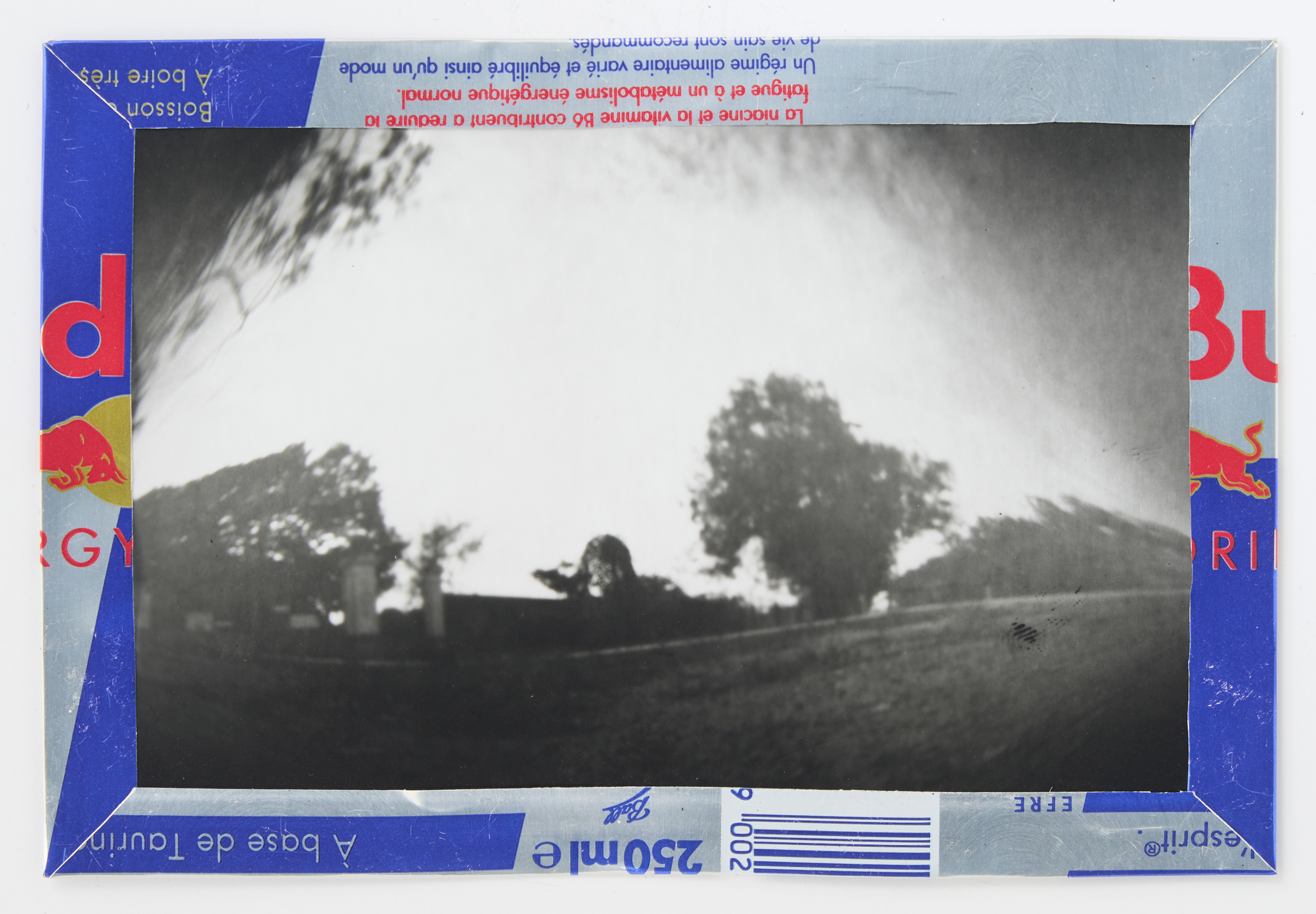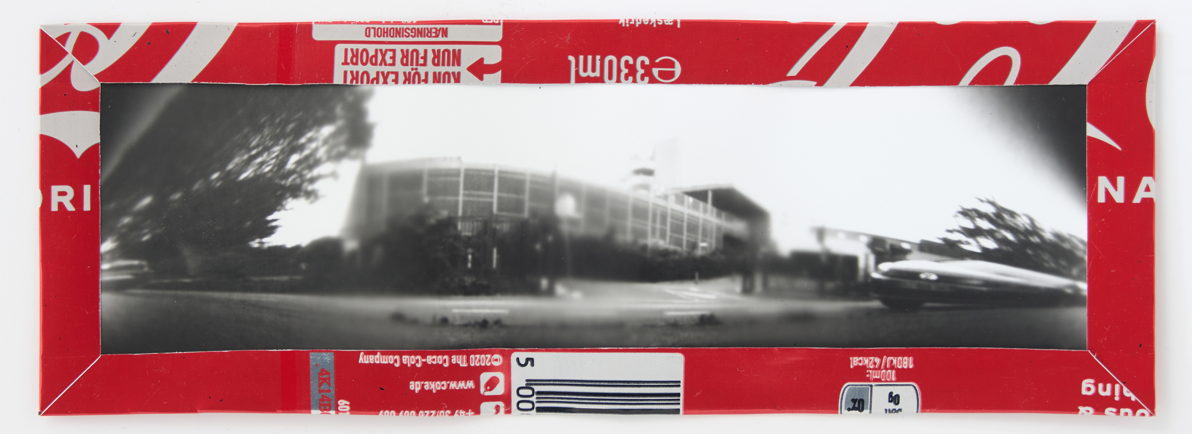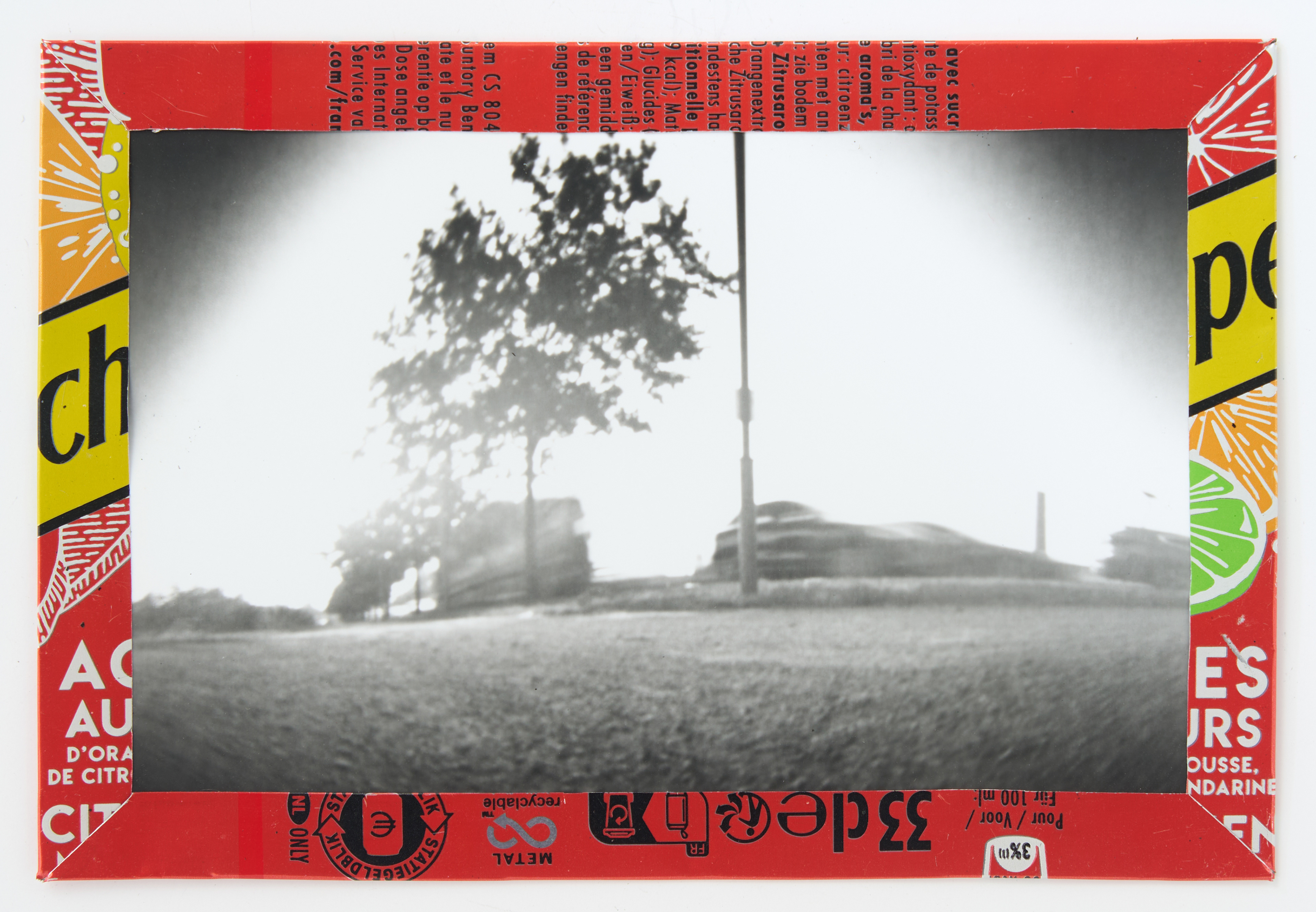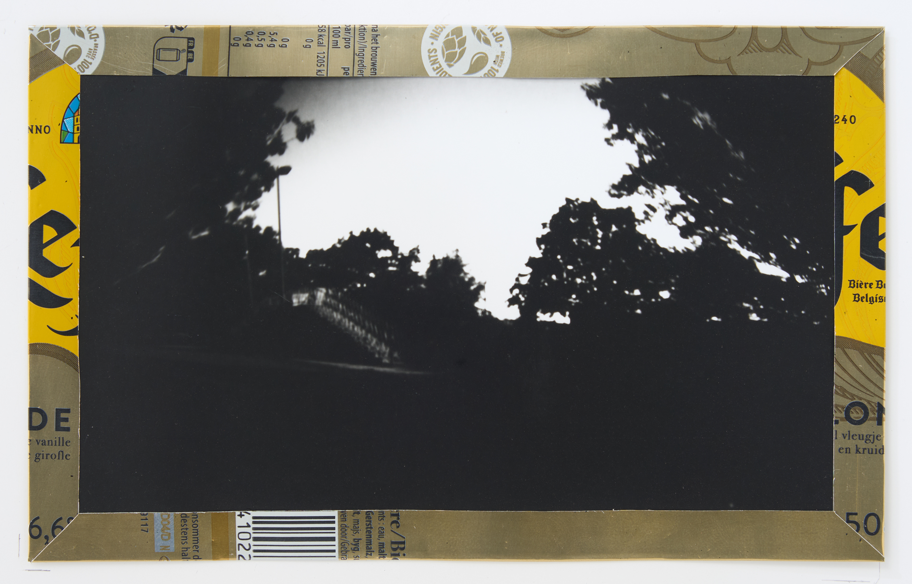 La canette sert ensuite d’encadrement à sa photographie, découpée et pliée ; ainsi ce cadre devient une extension du processus, cherchant à optimiser son recyclage.