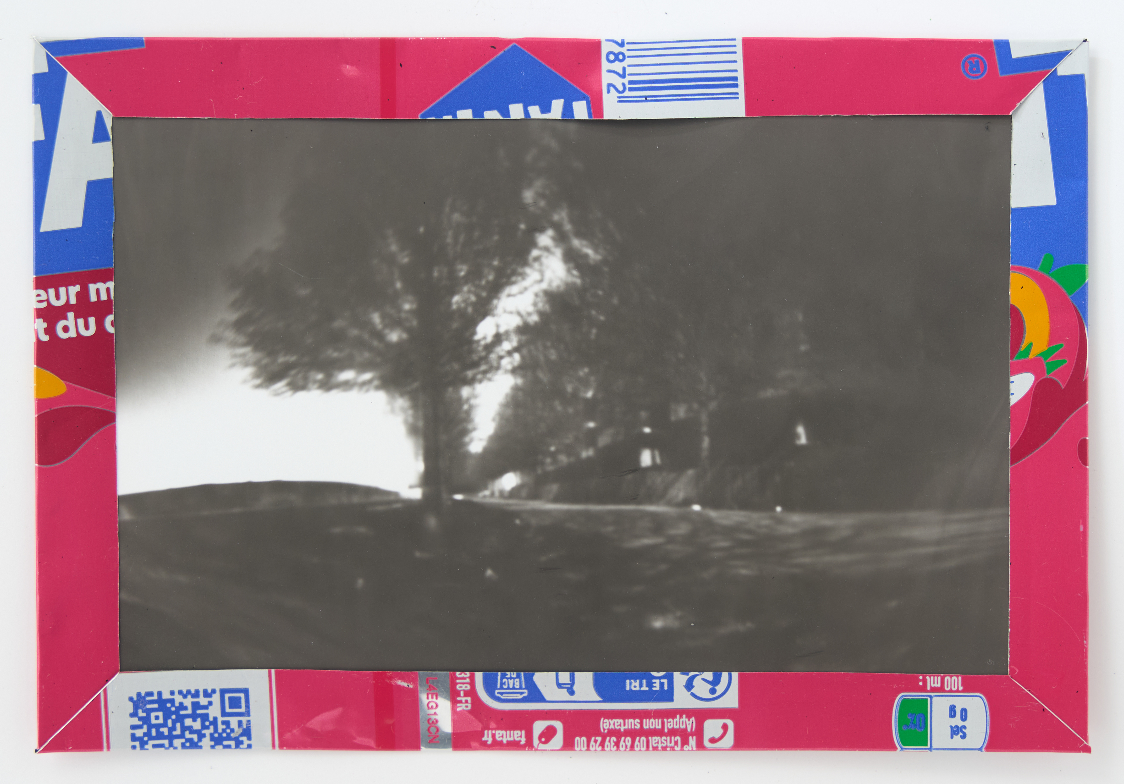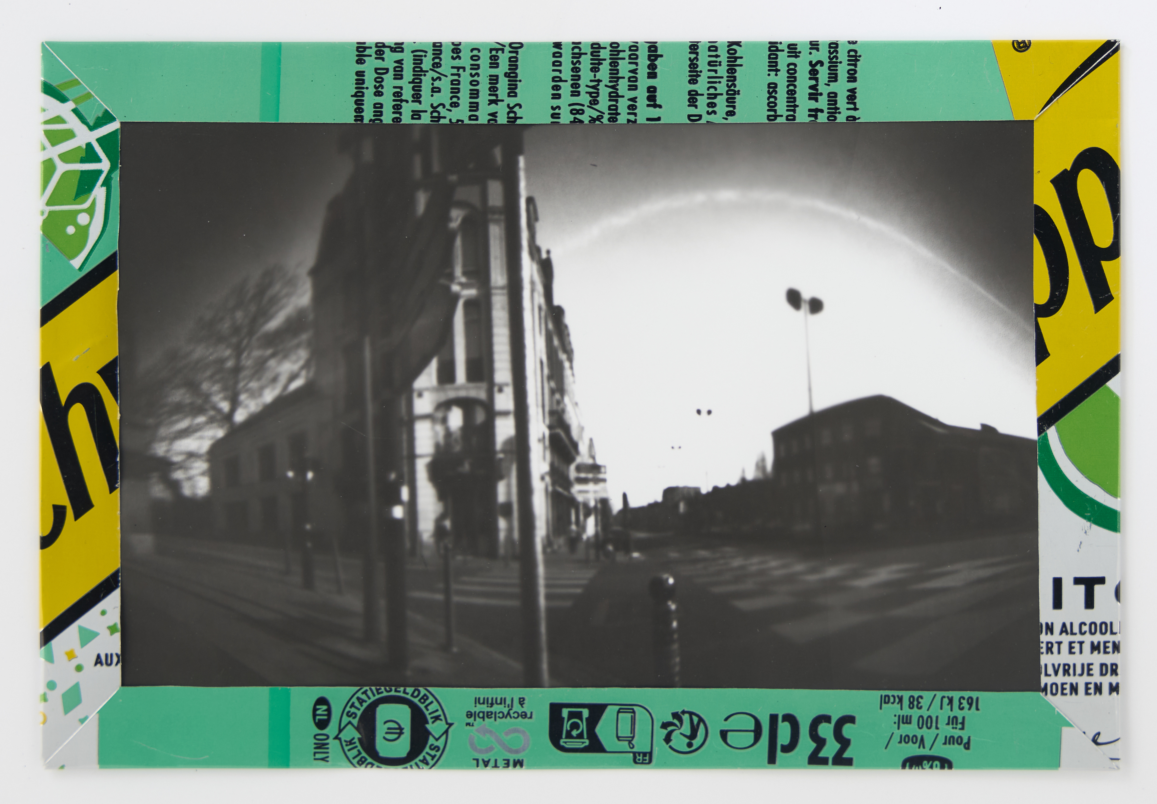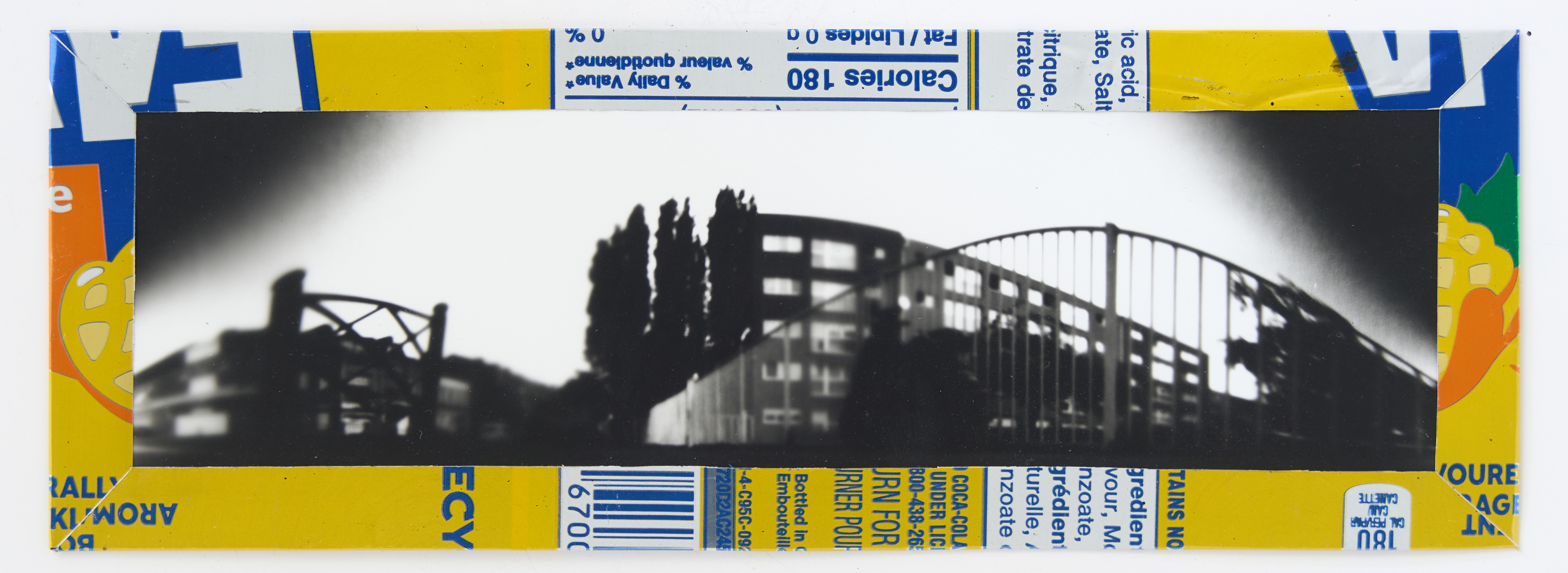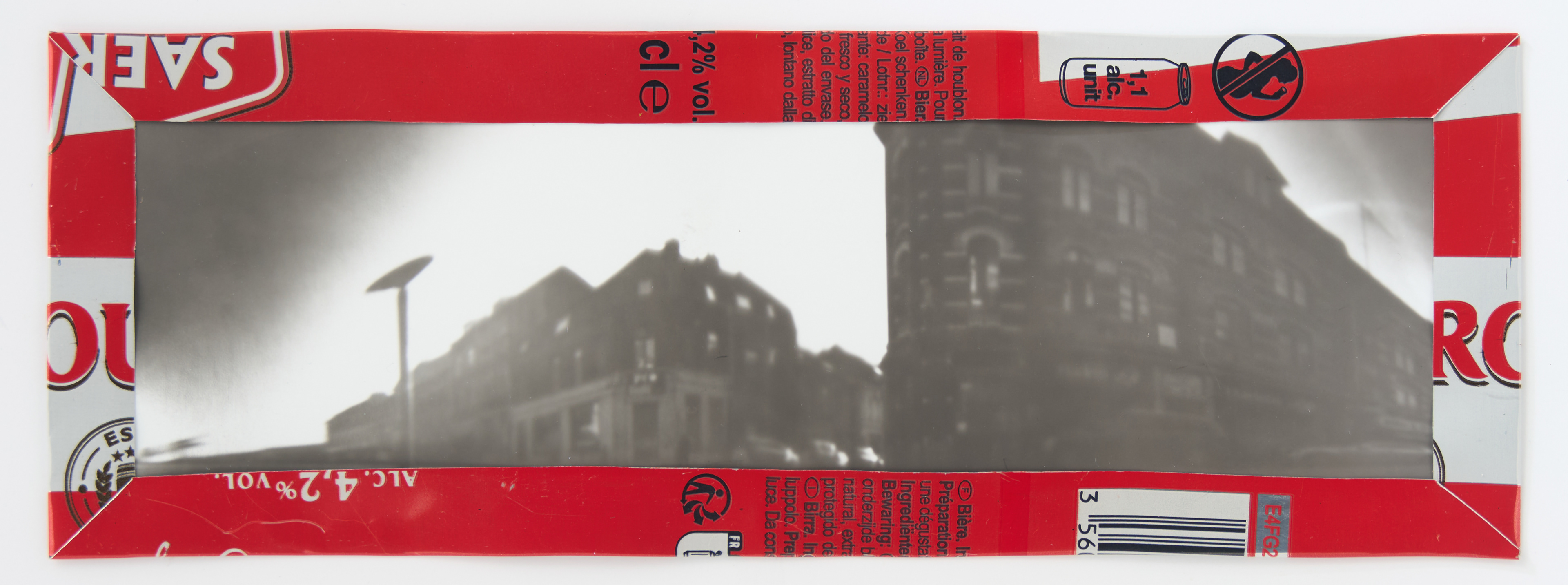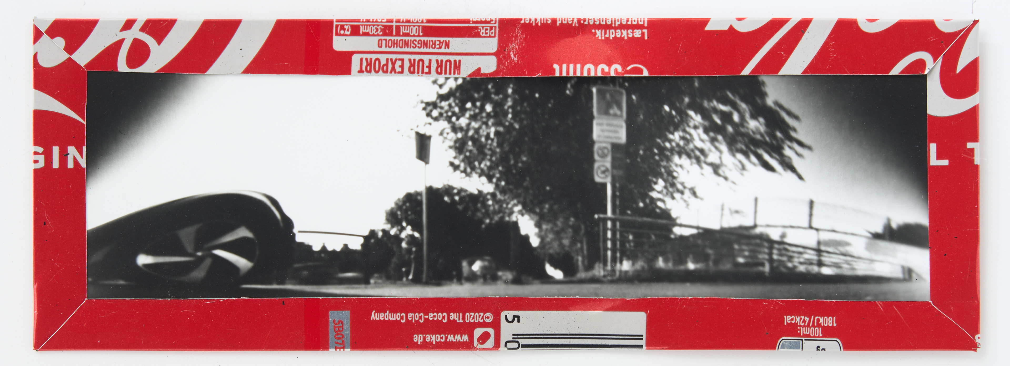 La canette sert ensuite d’encadrement à sa photographie, découpée et pliée ; ainsi ce cadre devient une extension du processus, cherchant à optimiser son recyclage.