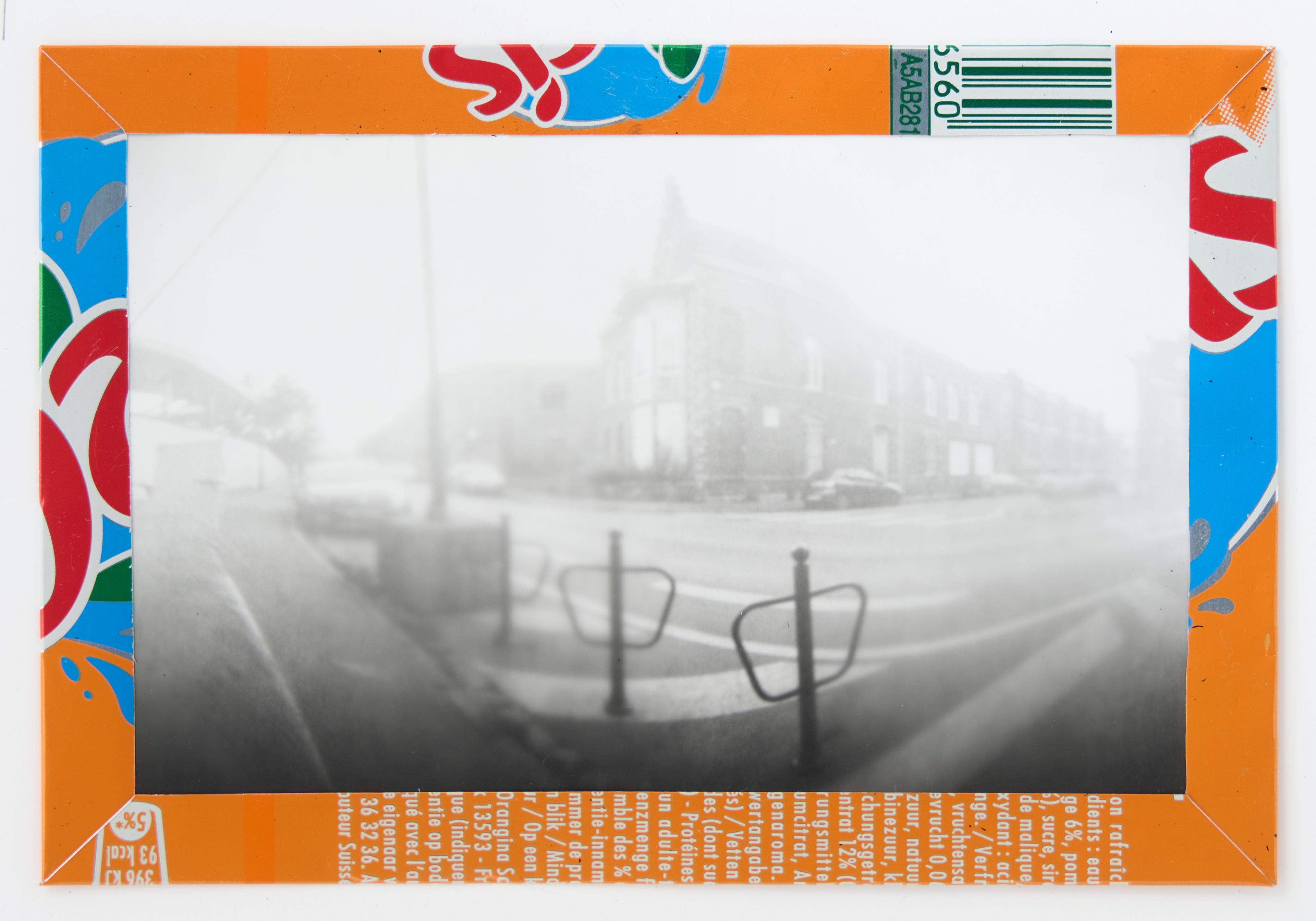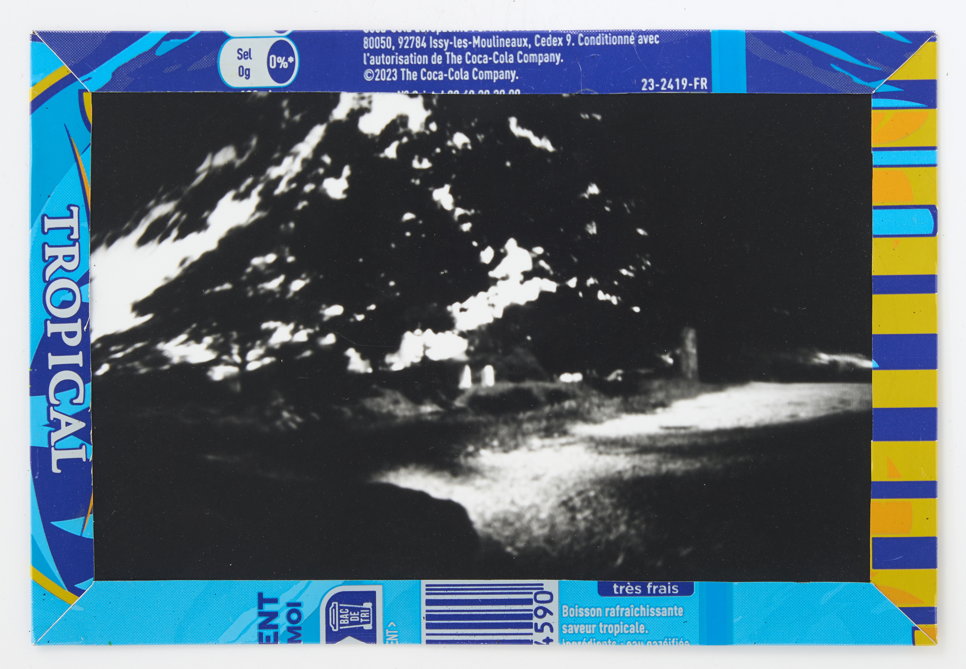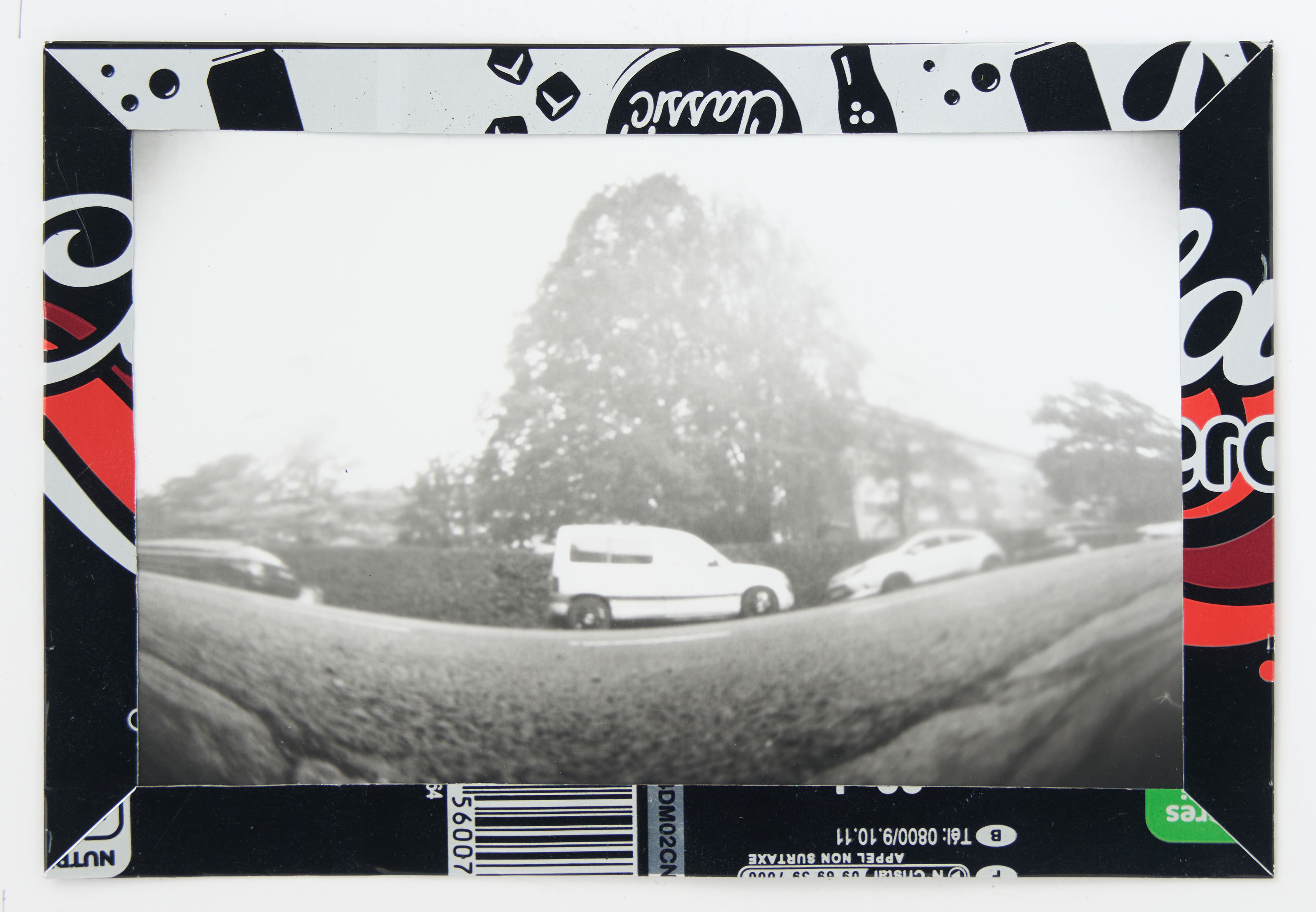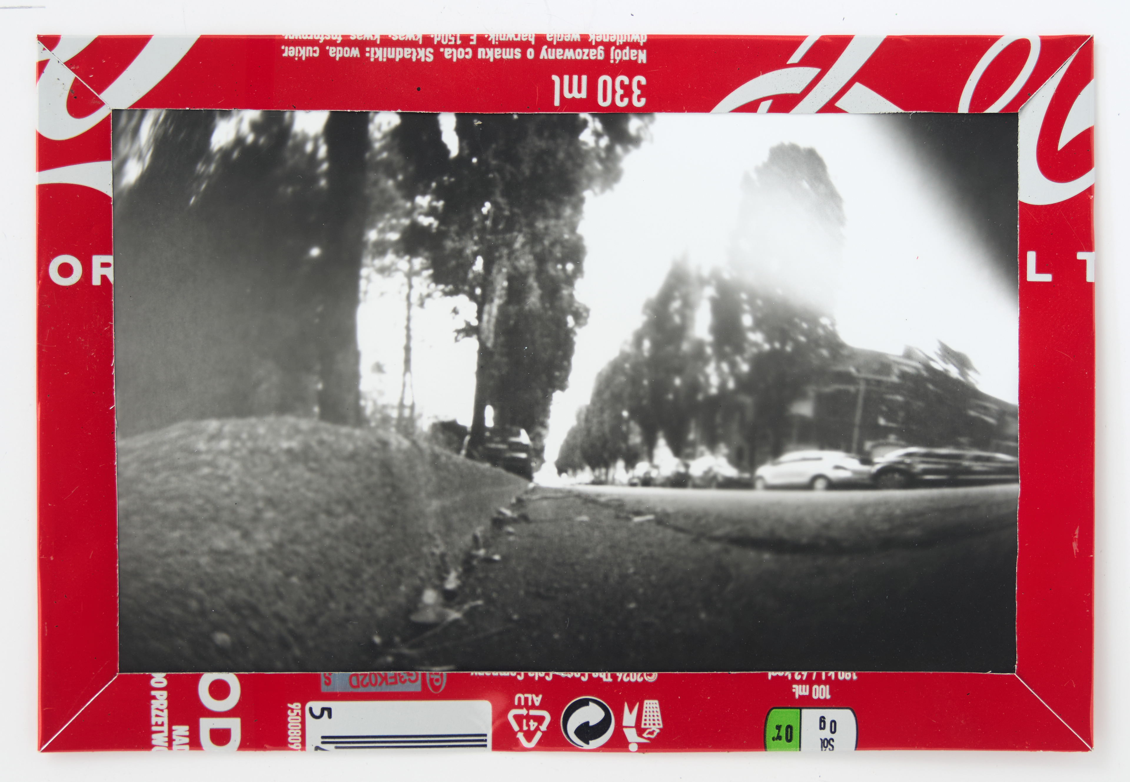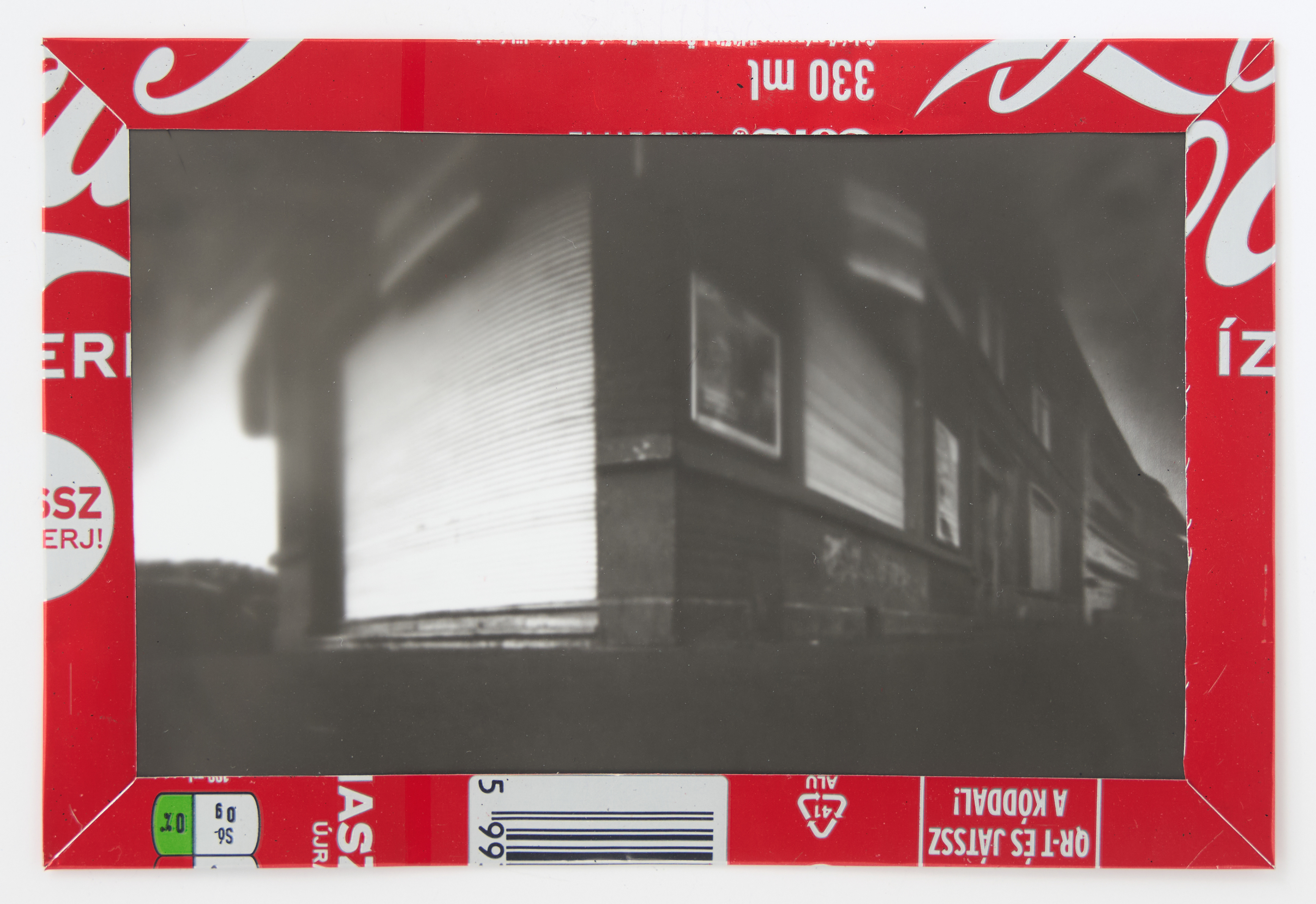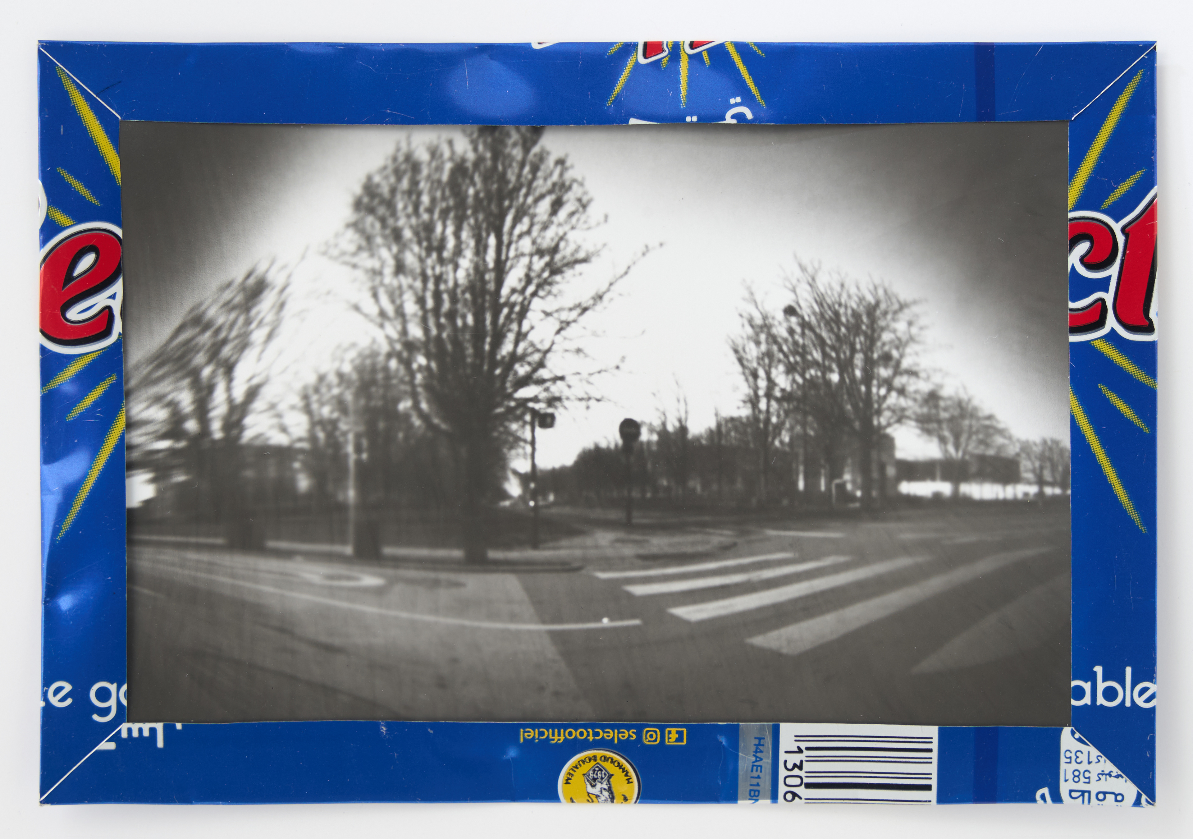 La canette sert ensuite d’encadrement à sa photographie, découpée et pliée ; ainsi ce cadre devient une extension du processus, cherchant à optimiser son recyclage.