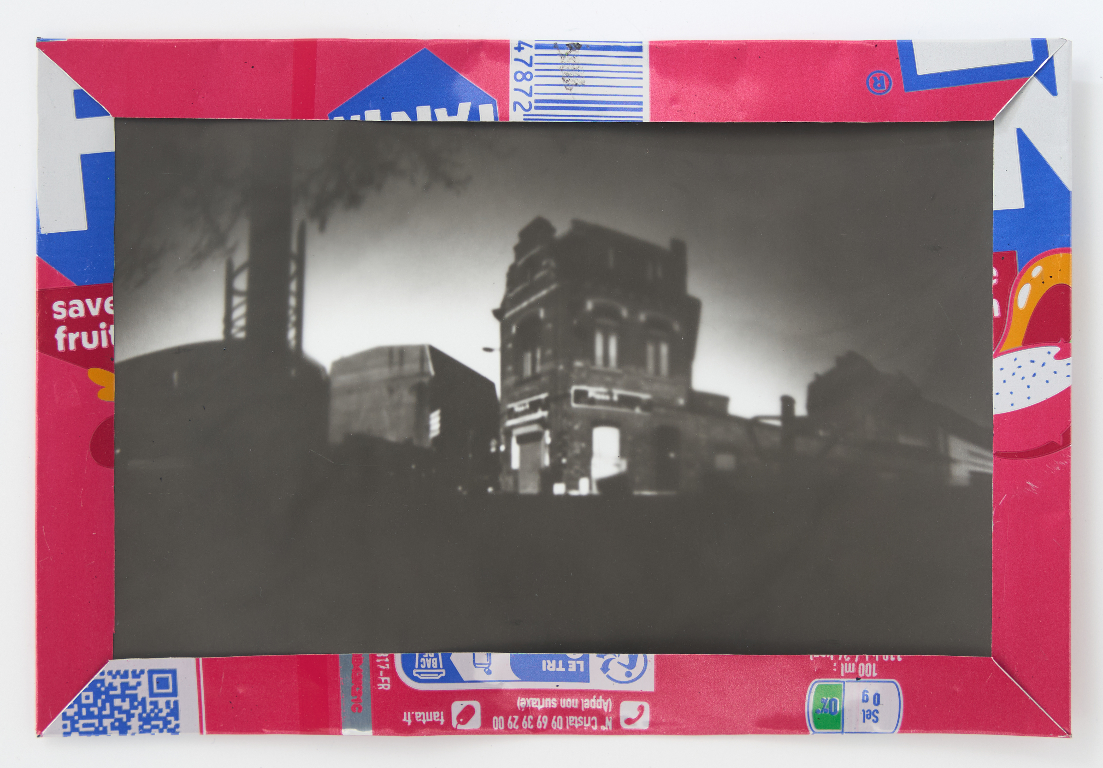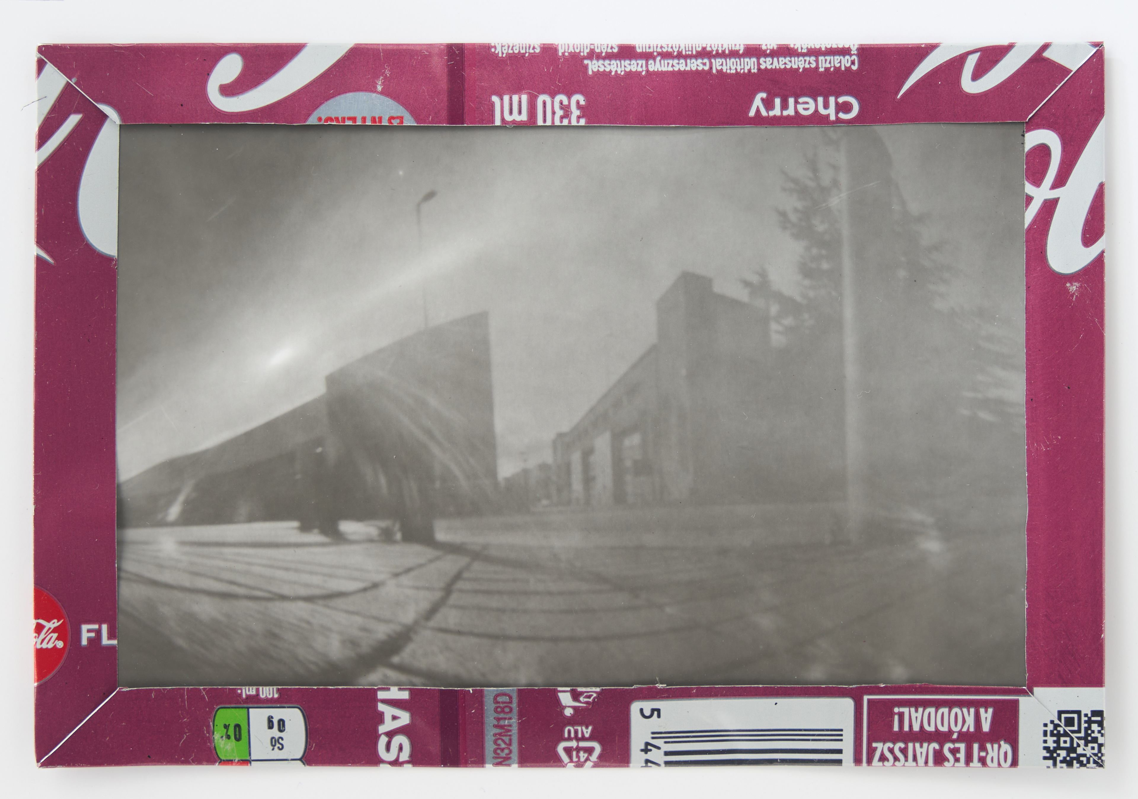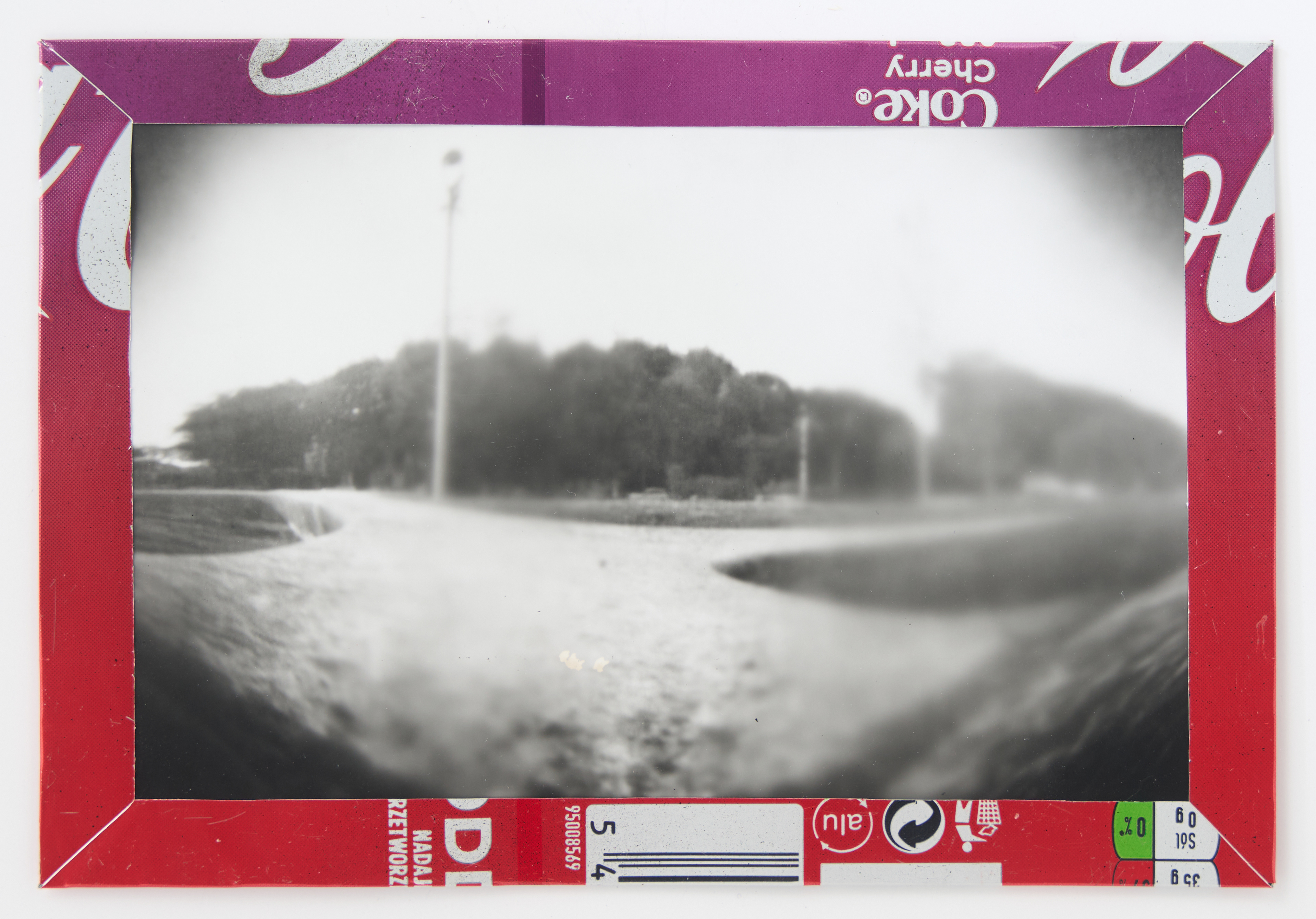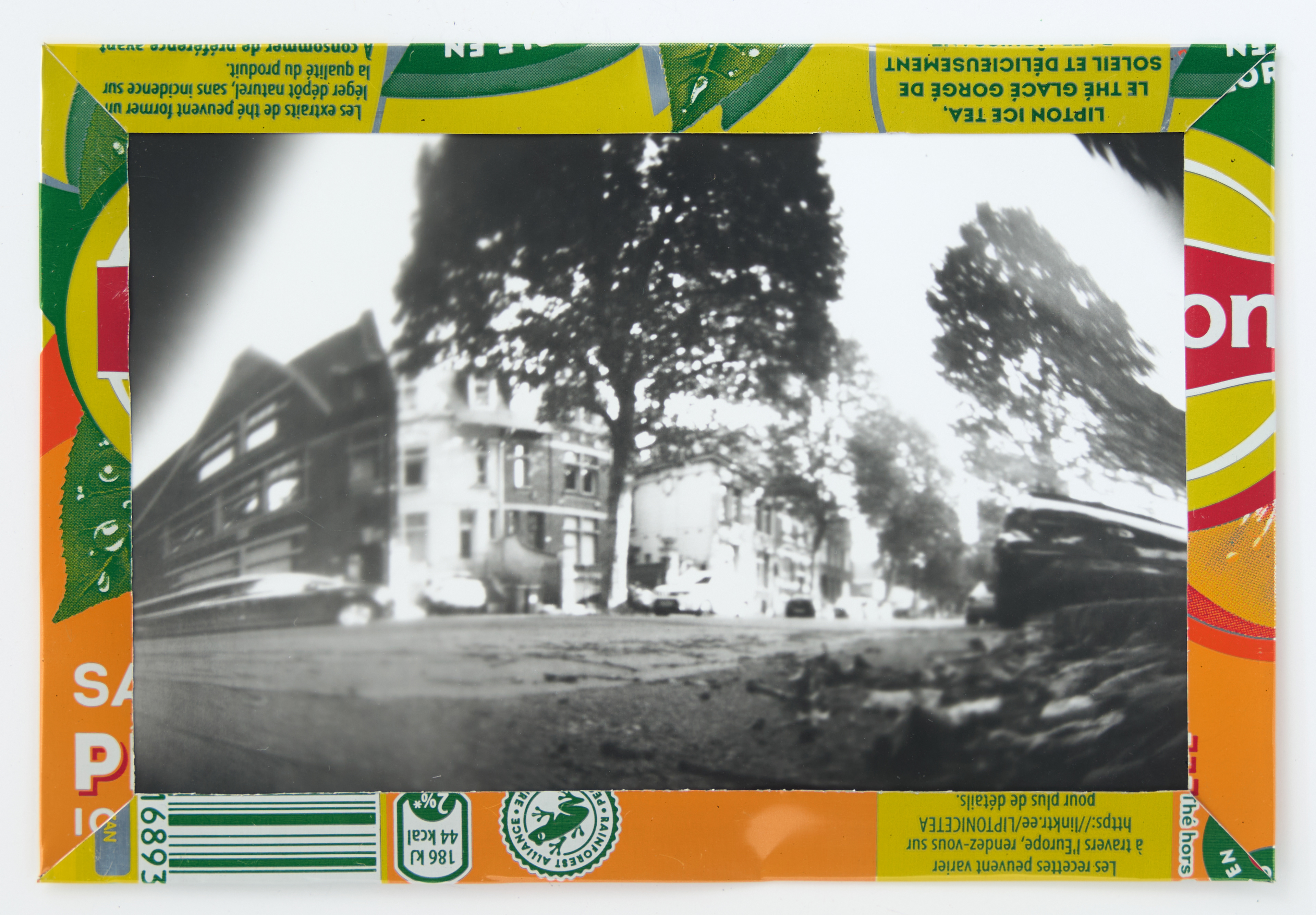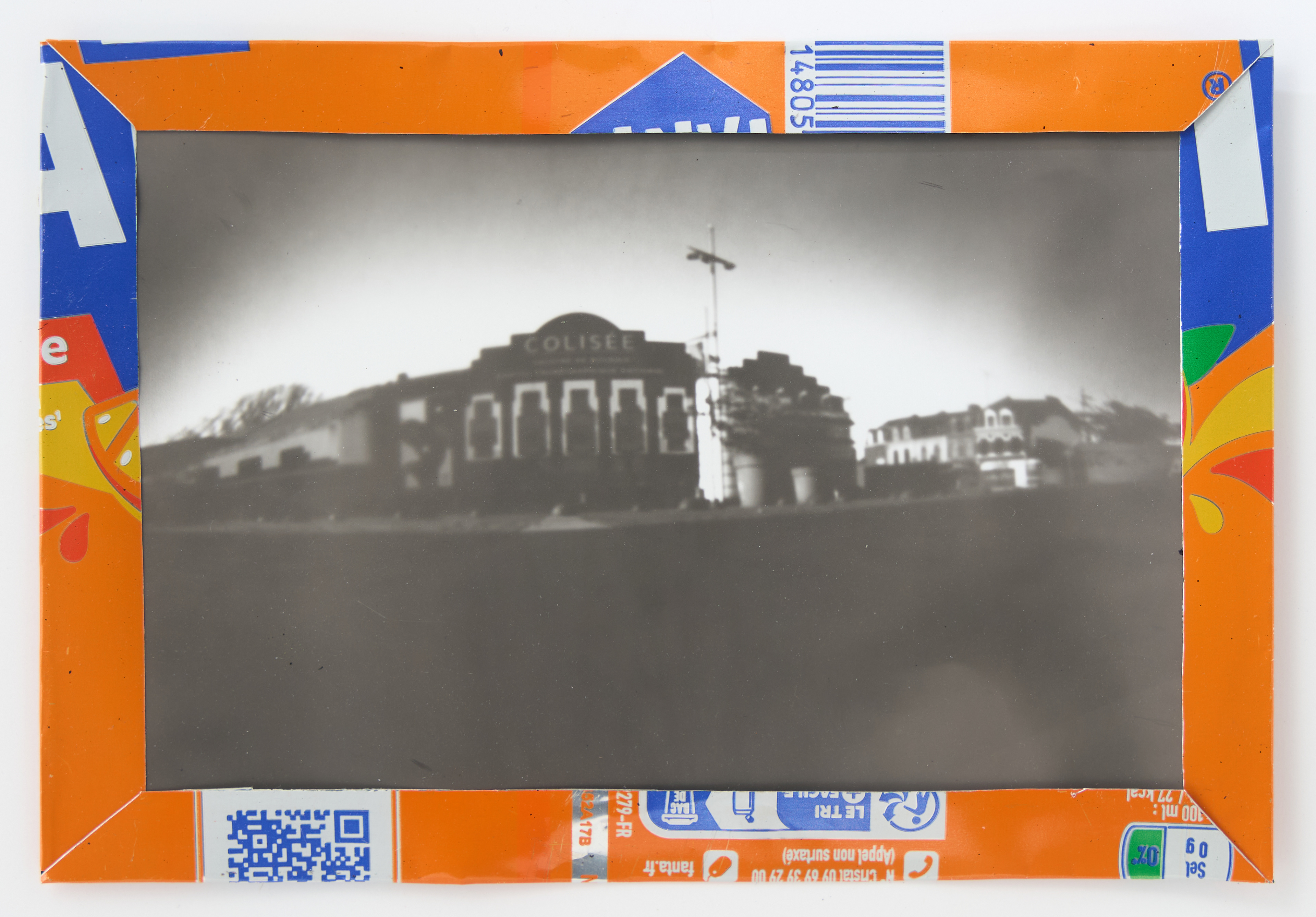 La canette sert ensuite d’encadrement à sa photographie, découpée et pliée ; ainsi ce cadre devient une extension du processus, cherchant à optimiser son recyclage.