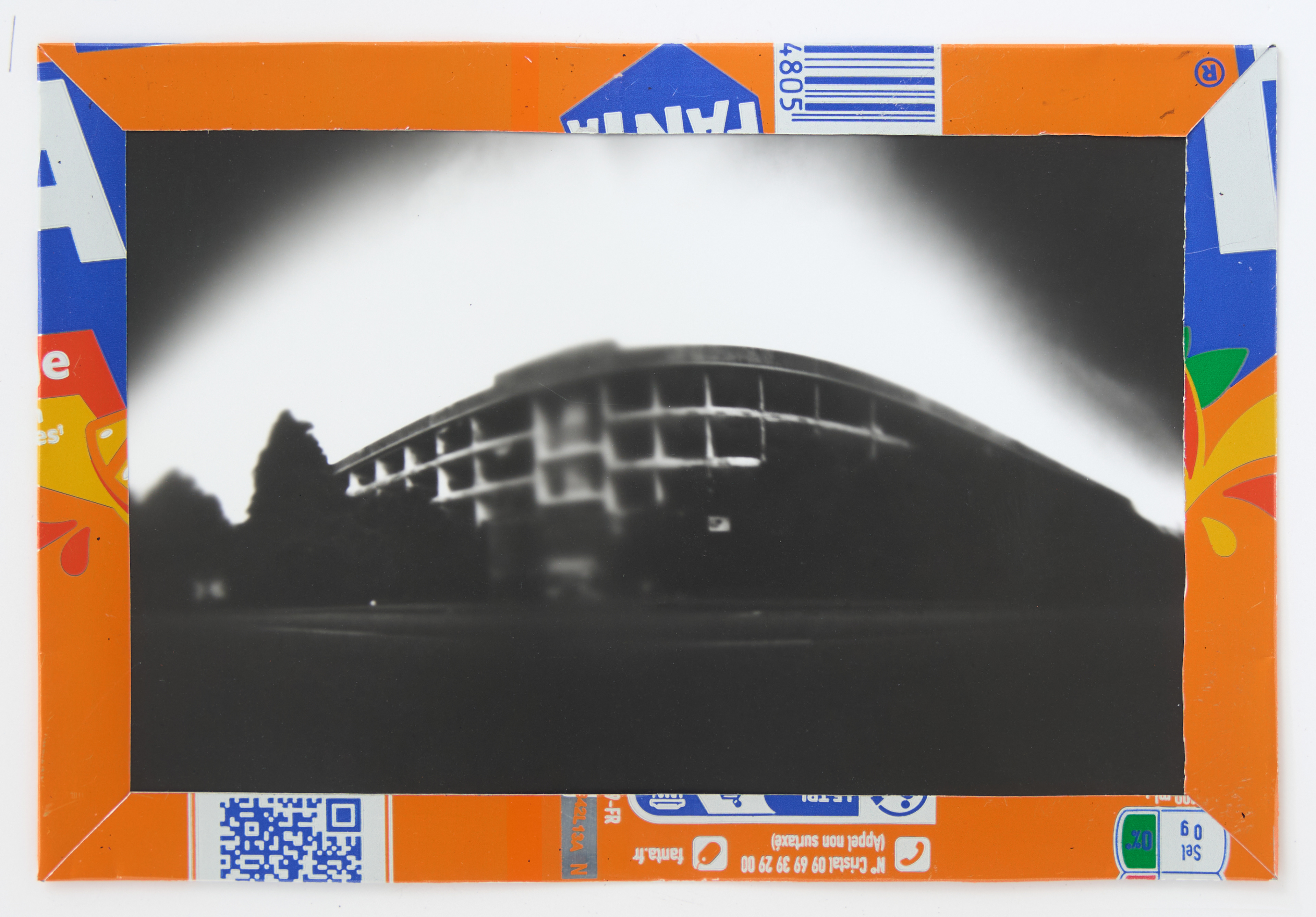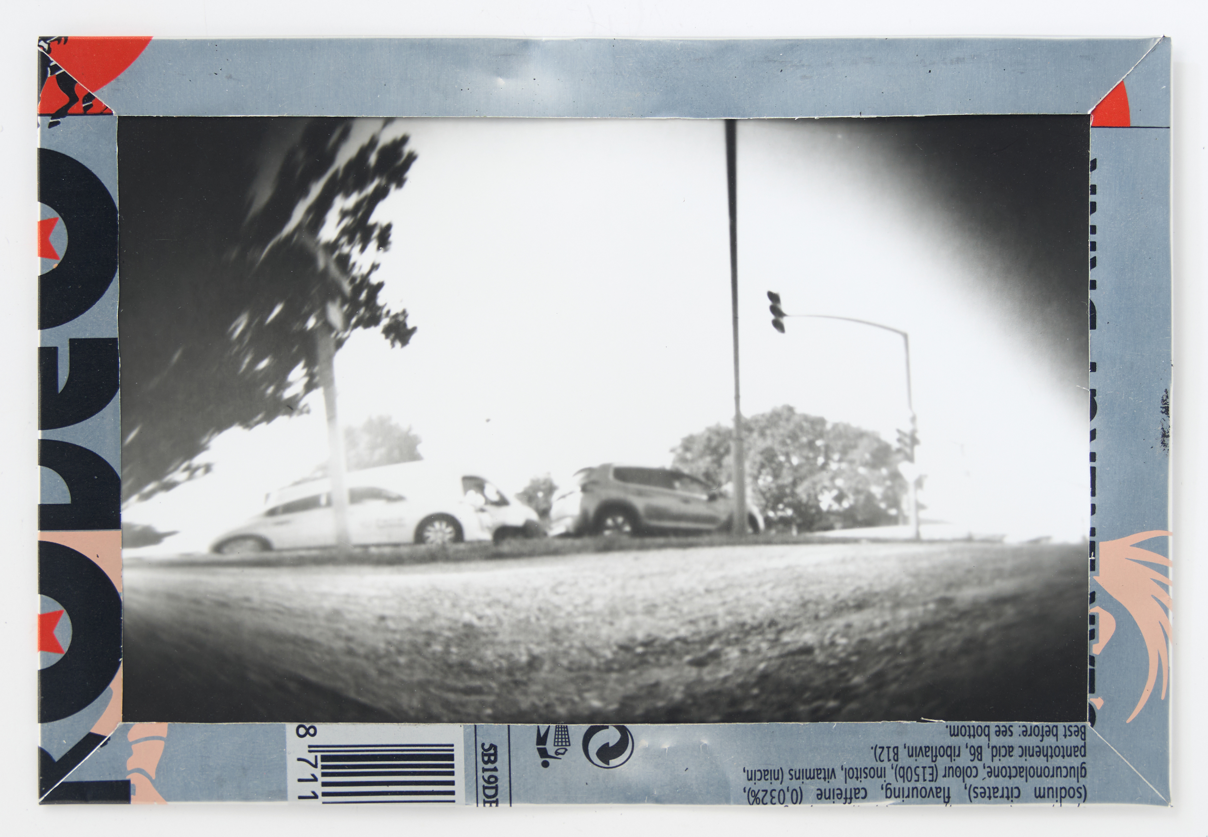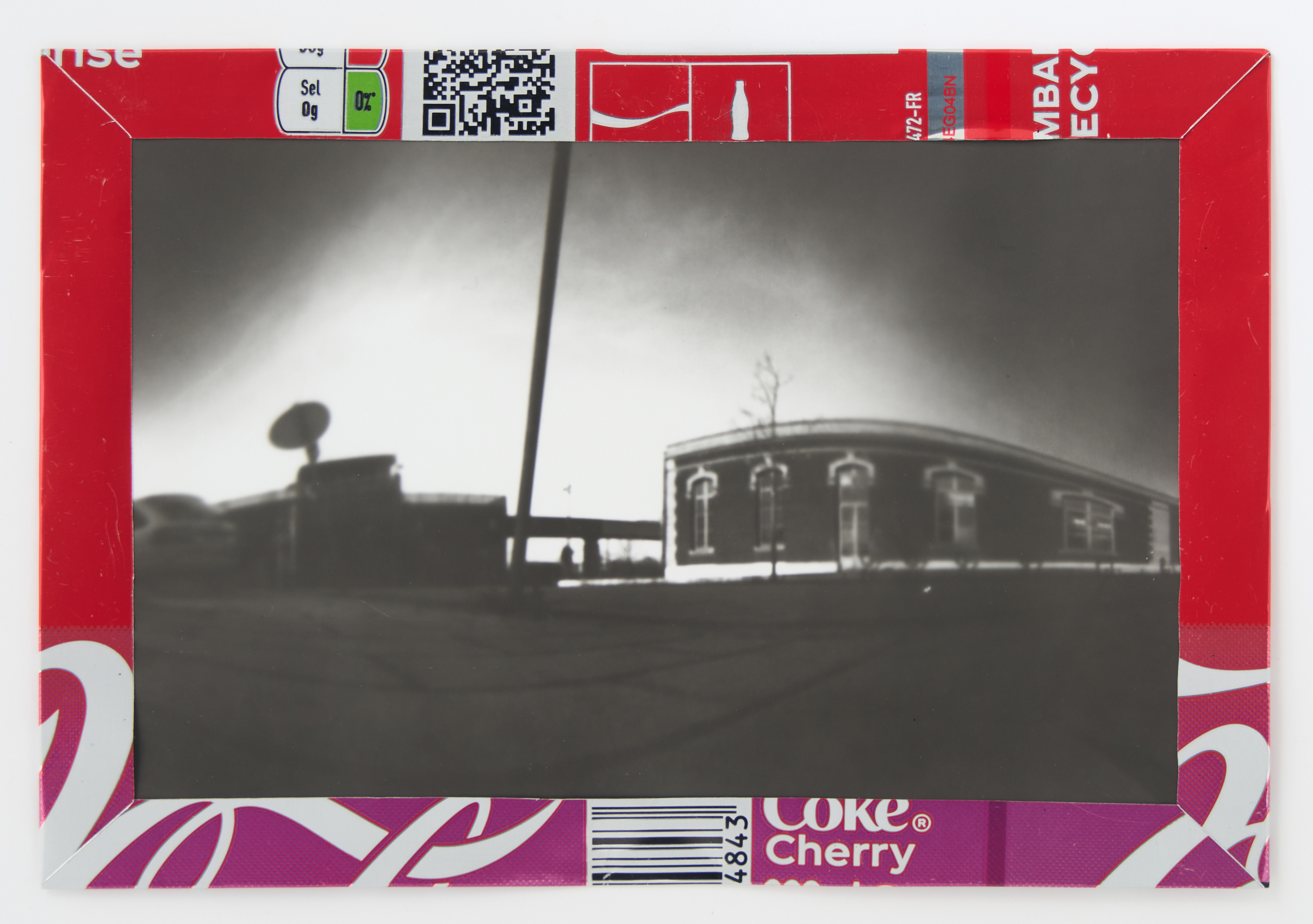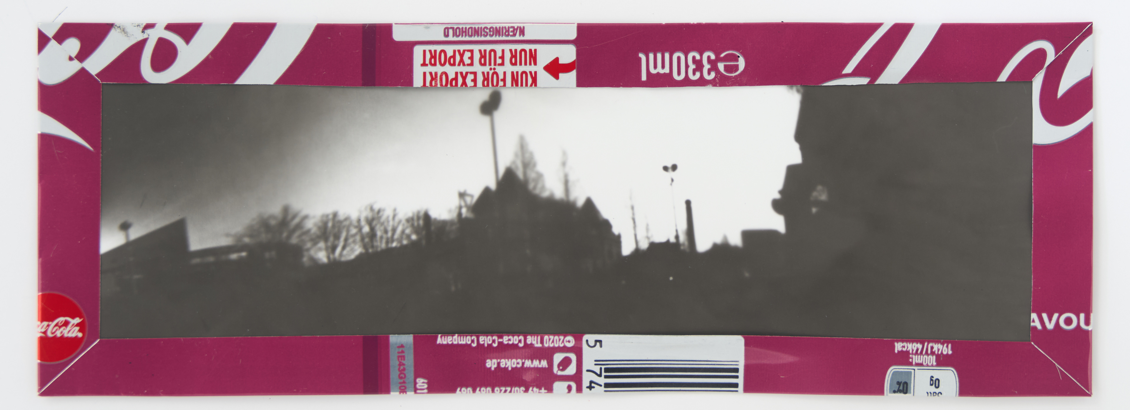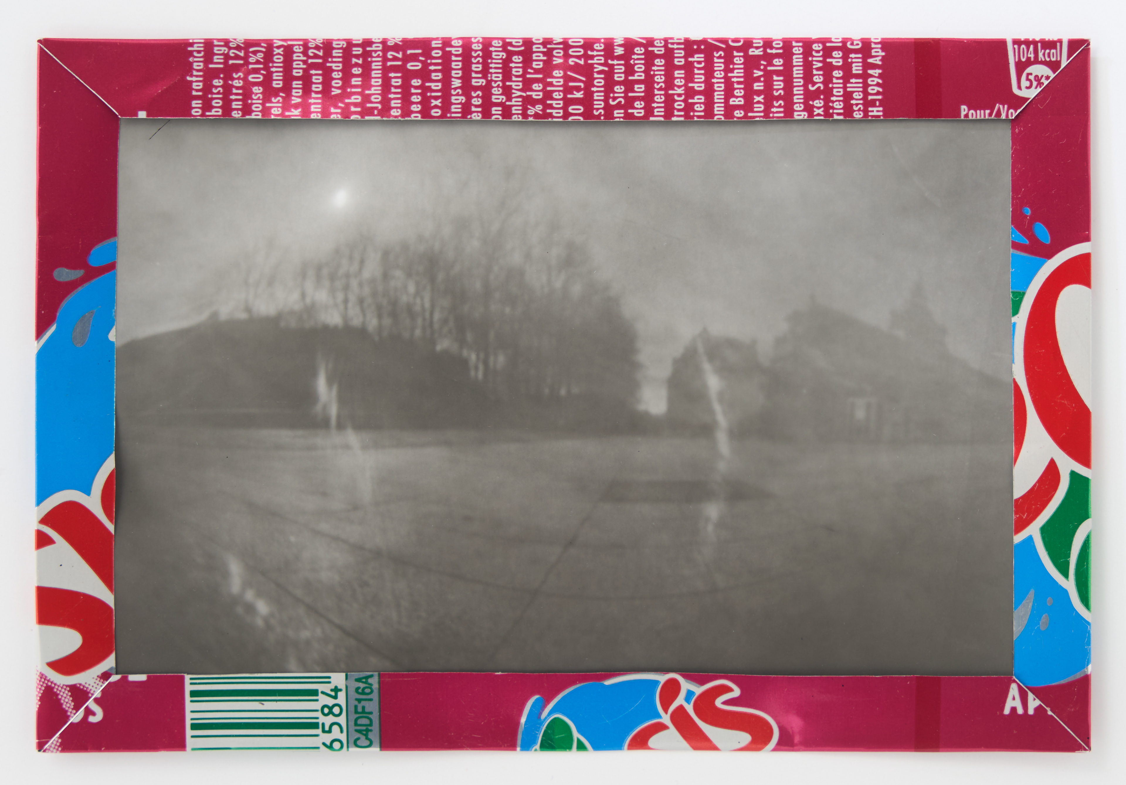 La canette sert ensuite d’encadrement à sa photographie, découpée et pliée ; ainsi ce cadre devient une extension du processus, cherchant à optimiser son recyclage.
