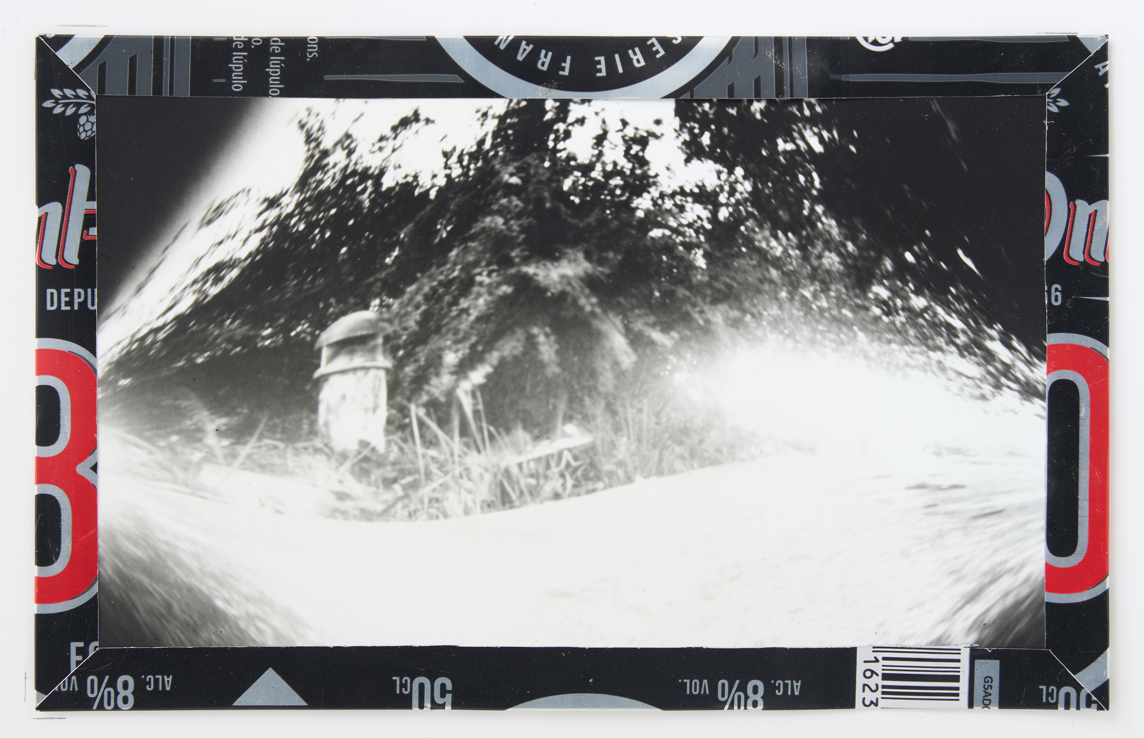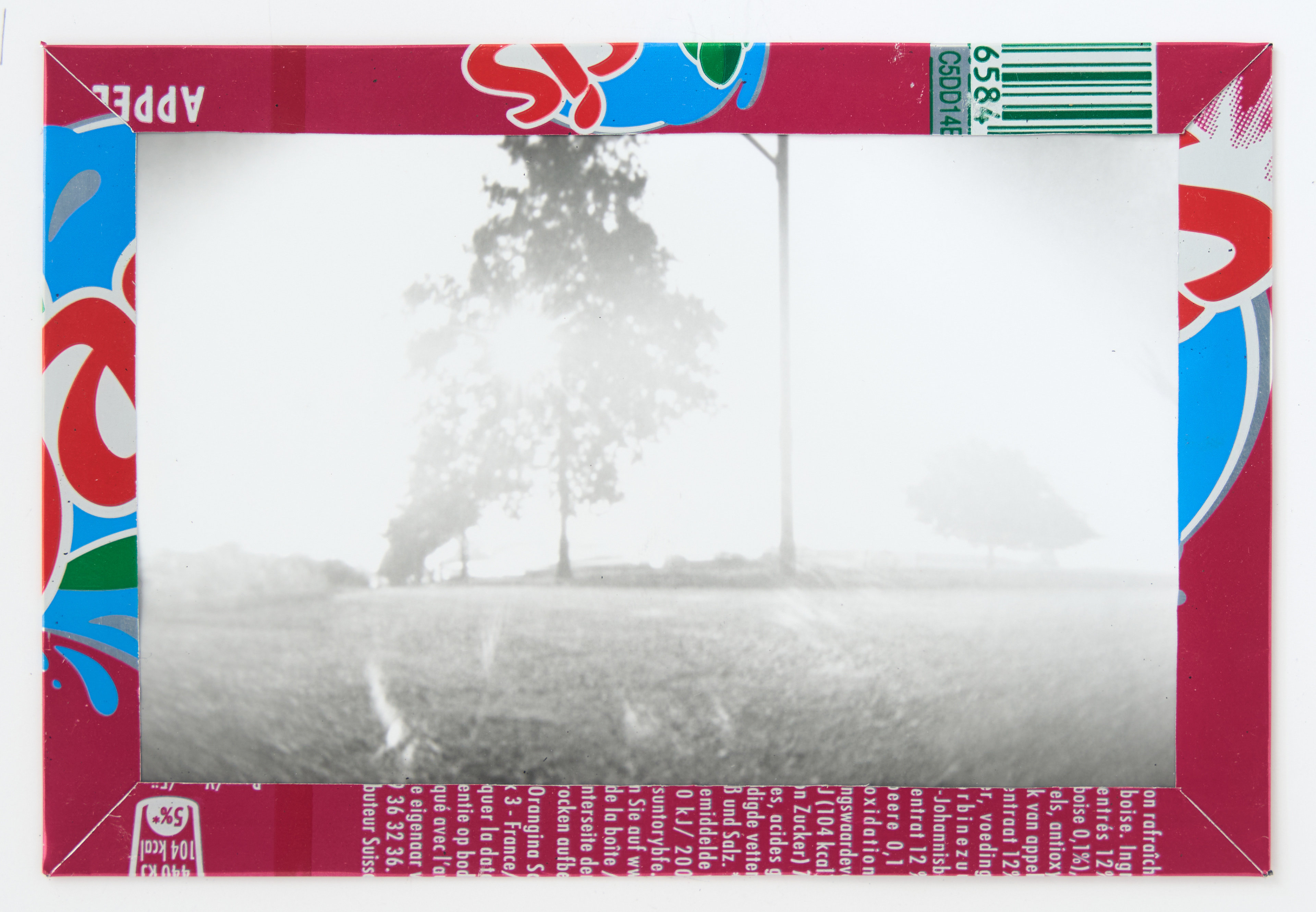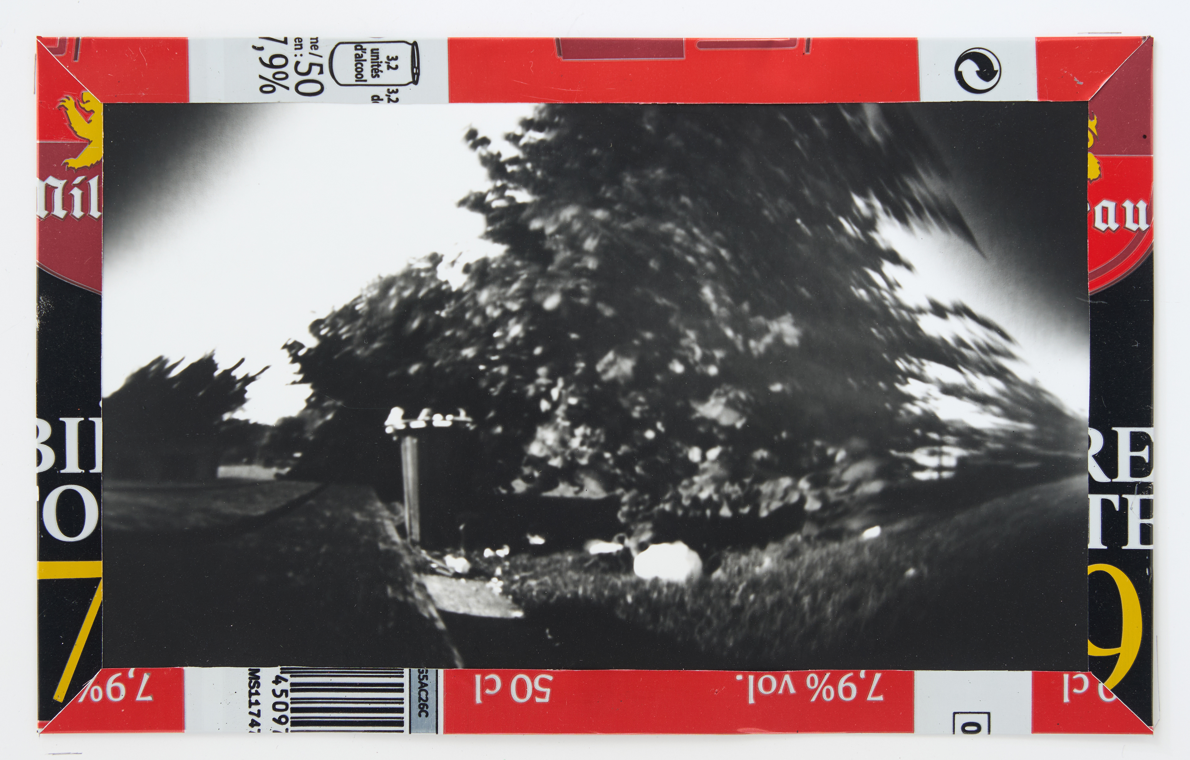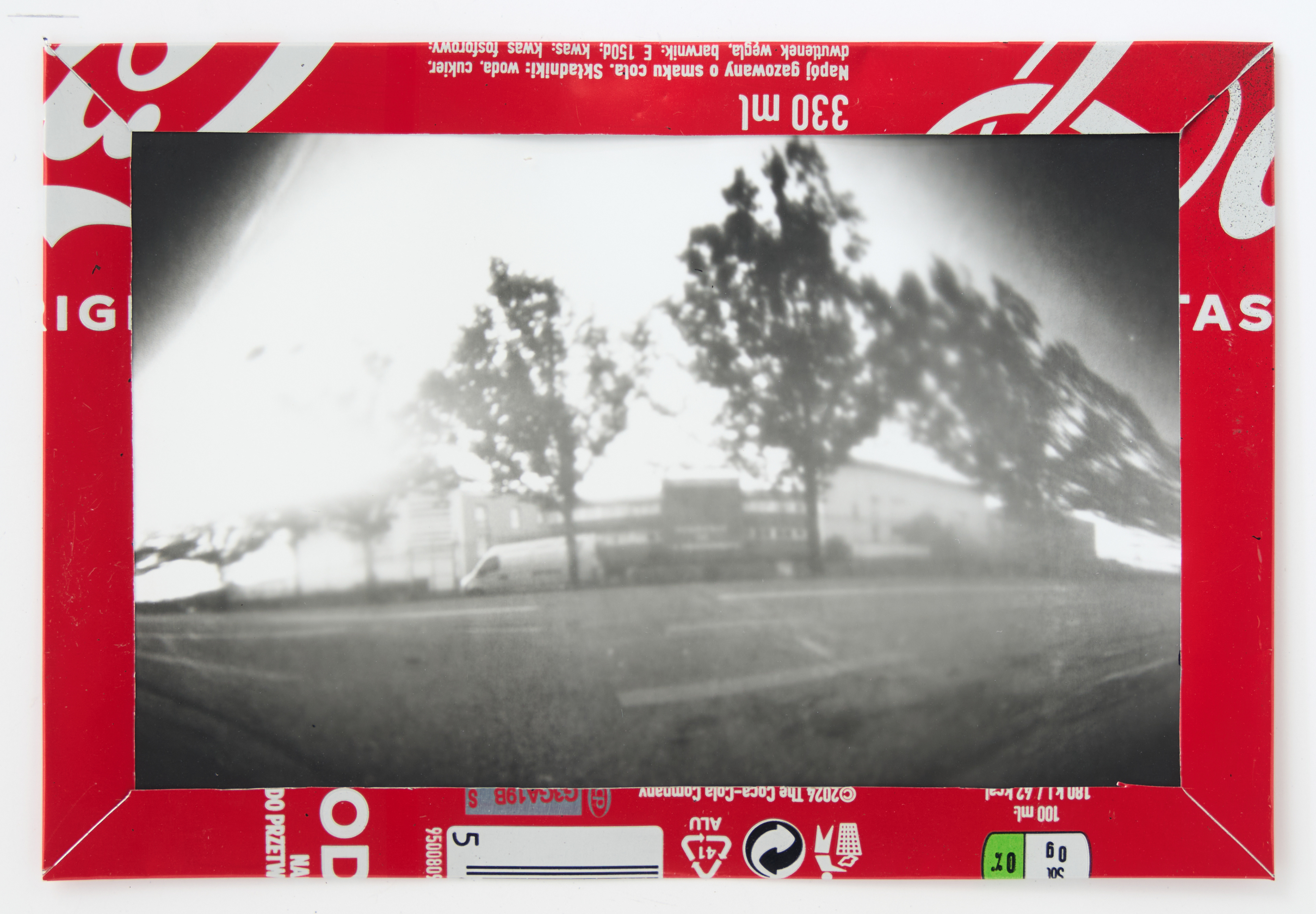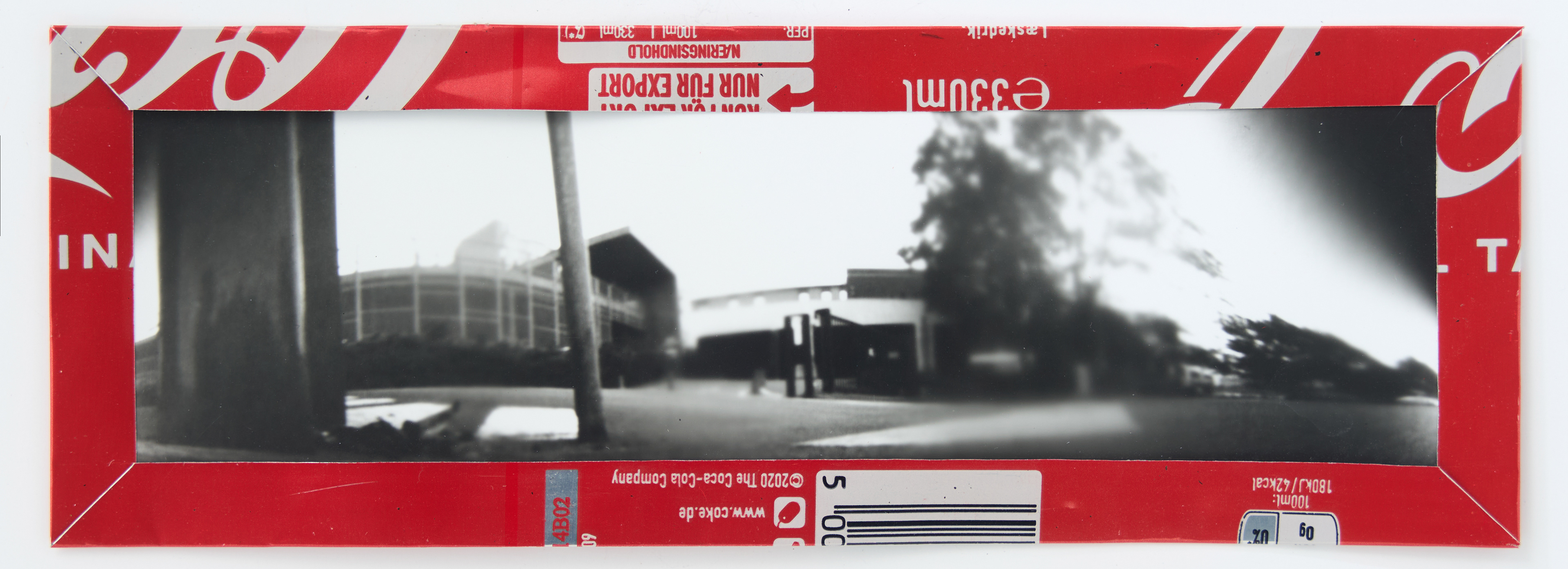 La canette sert ensuite d’encadrement à sa photographie, découpée et pliée ; ainsi ce cadre devient une extension du processus, cherchant à optimiser son recyclage.