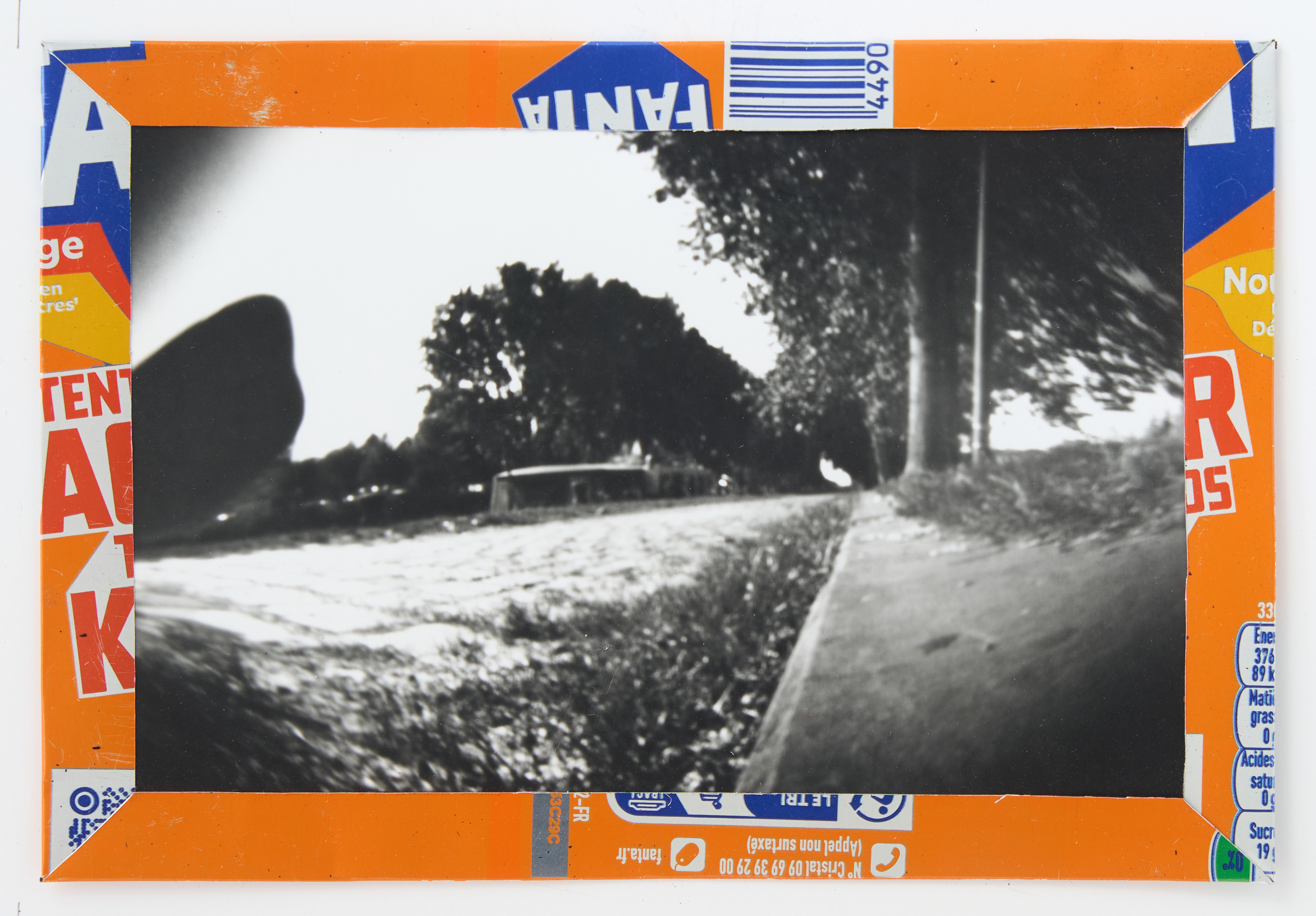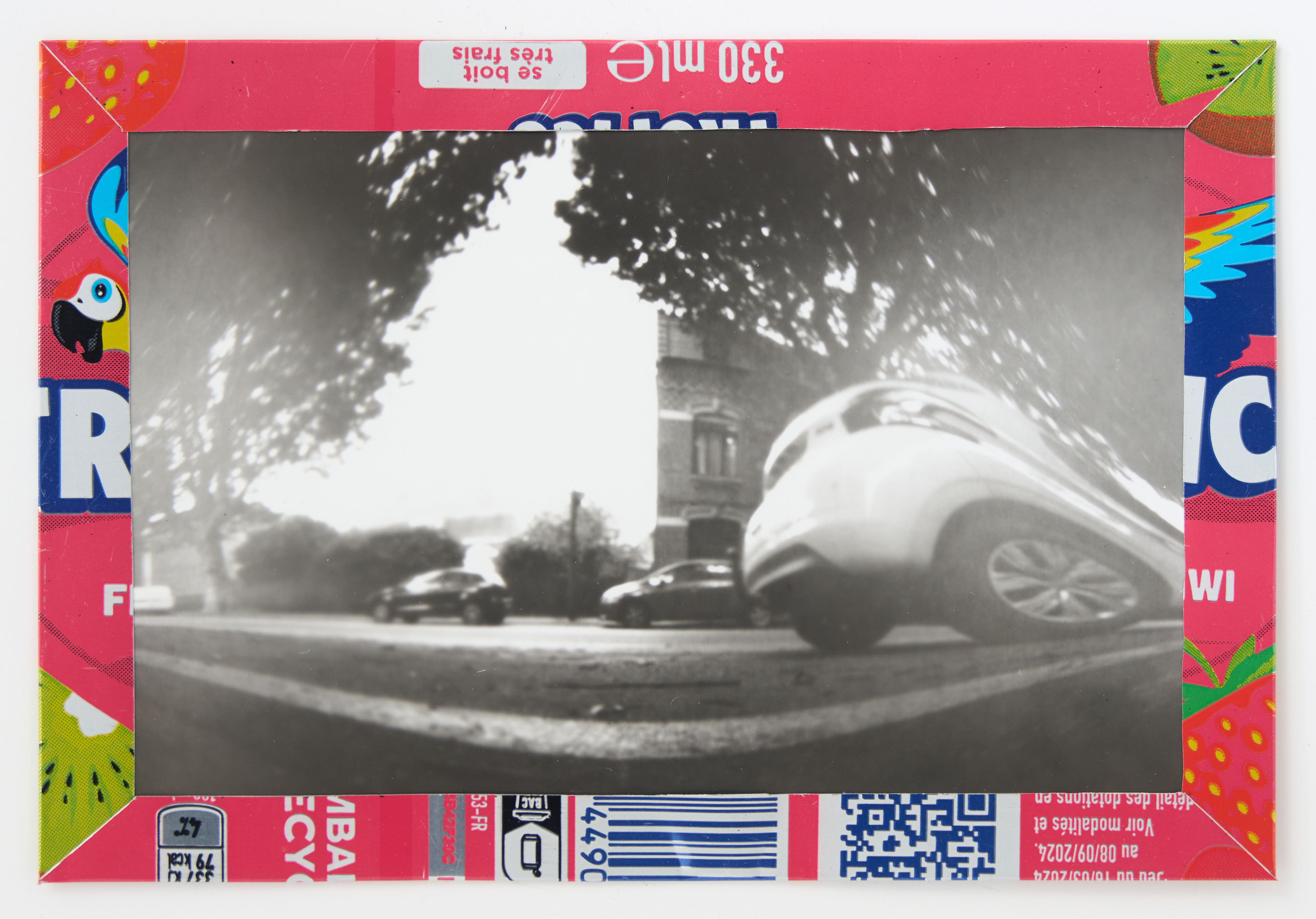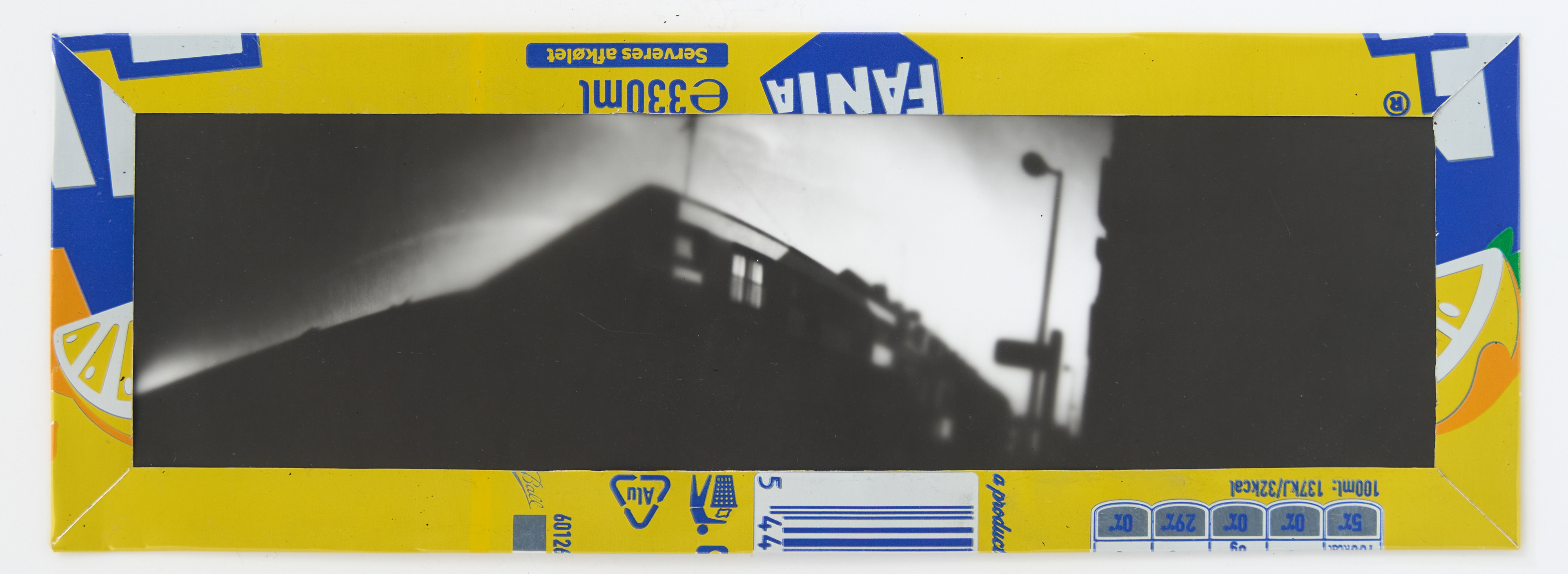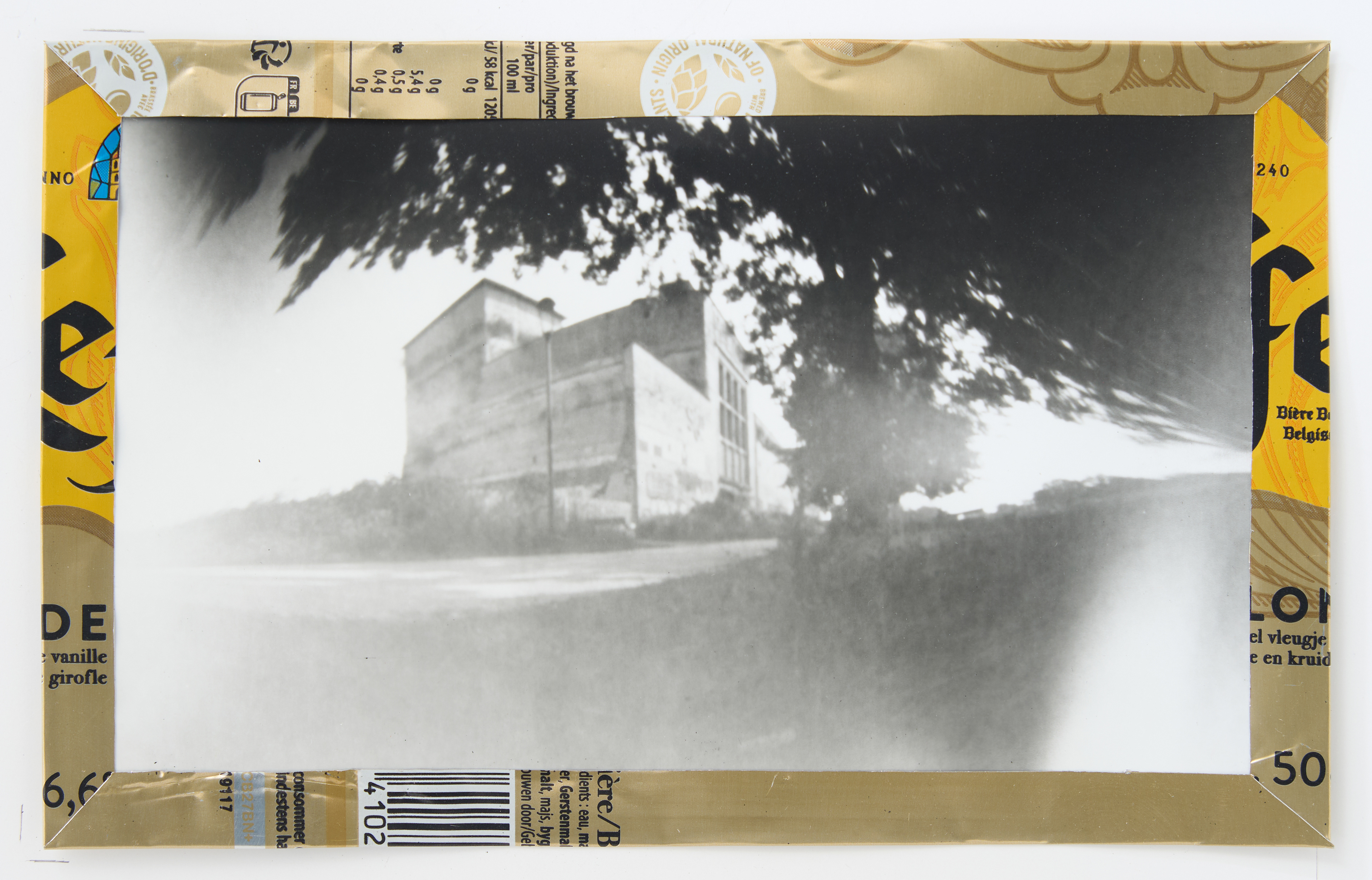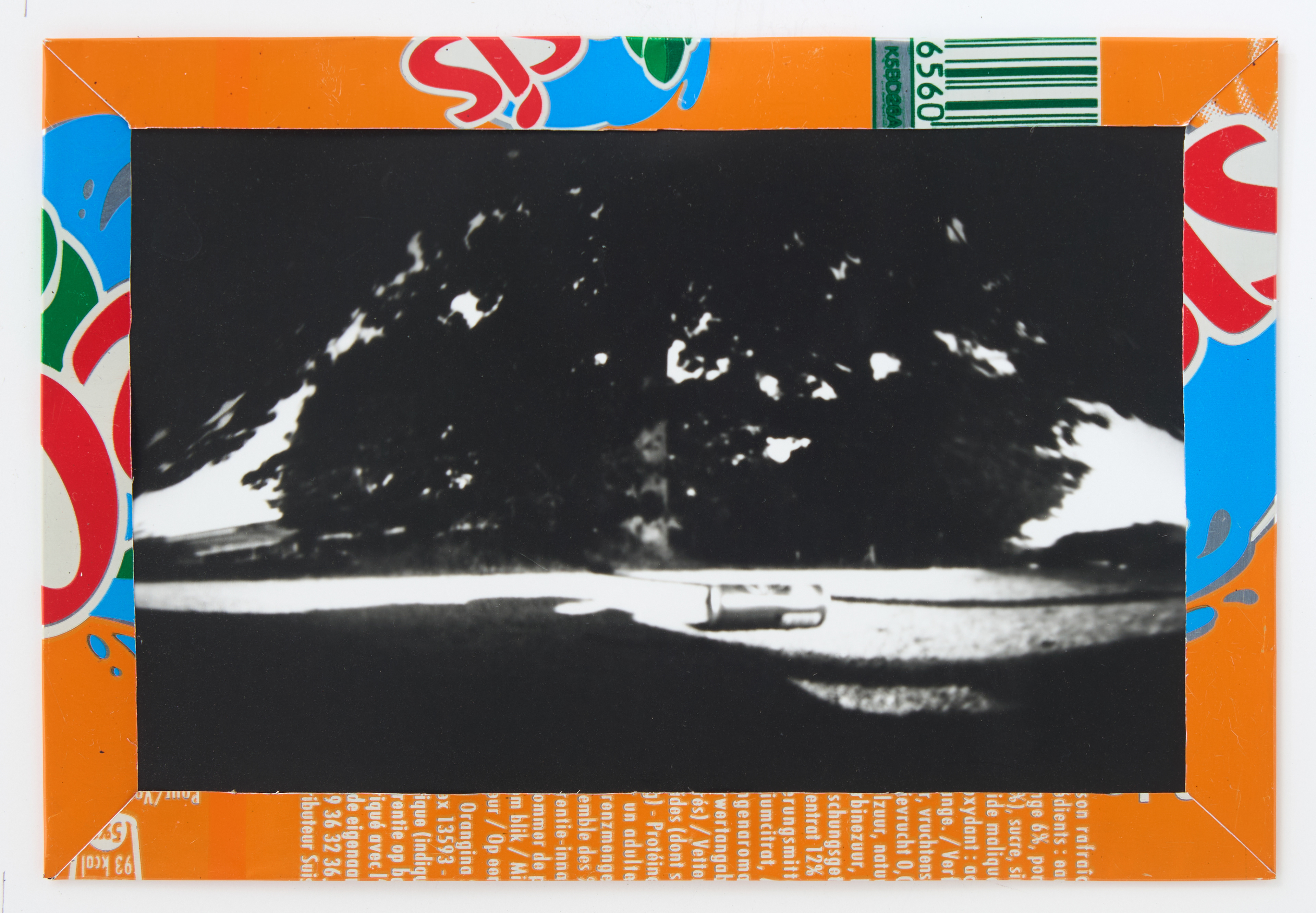 La canette sert ensuite d’encadrement à sa photographie, découpée et pliée ; ainsi ce cadre devient une extension du processus, cherchant à optimiser son recyclage.