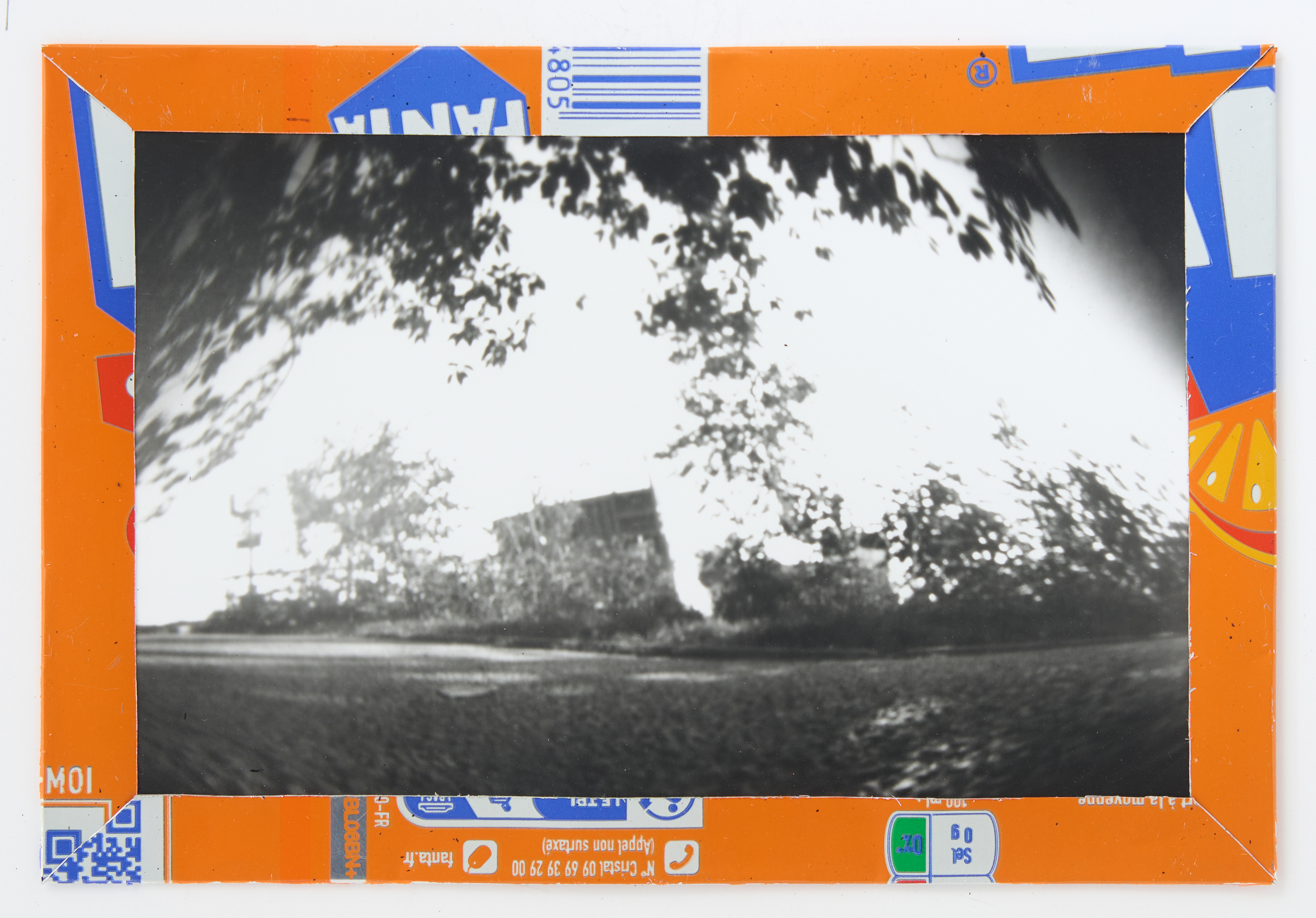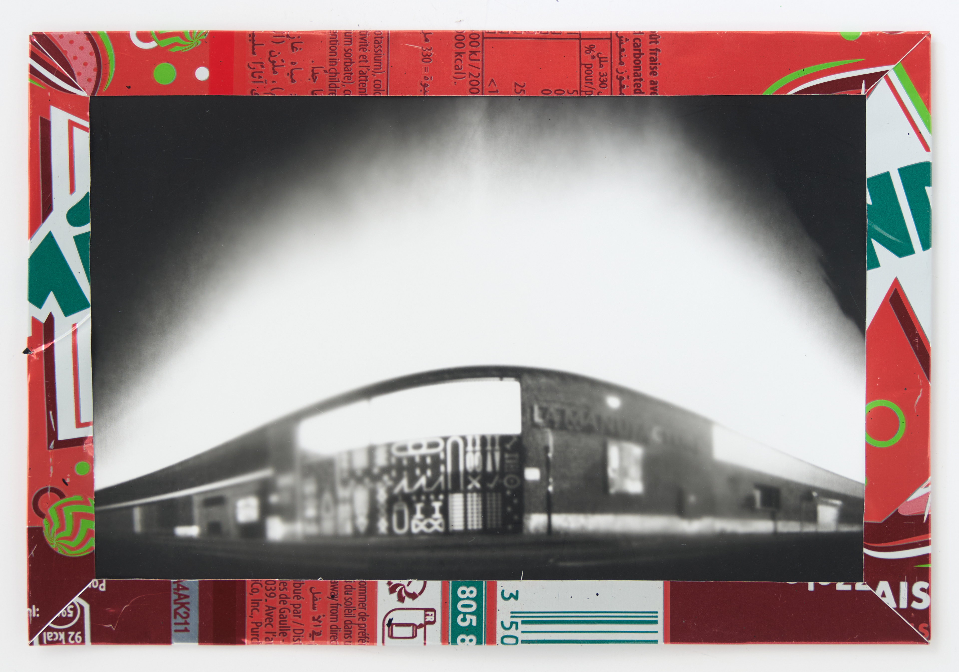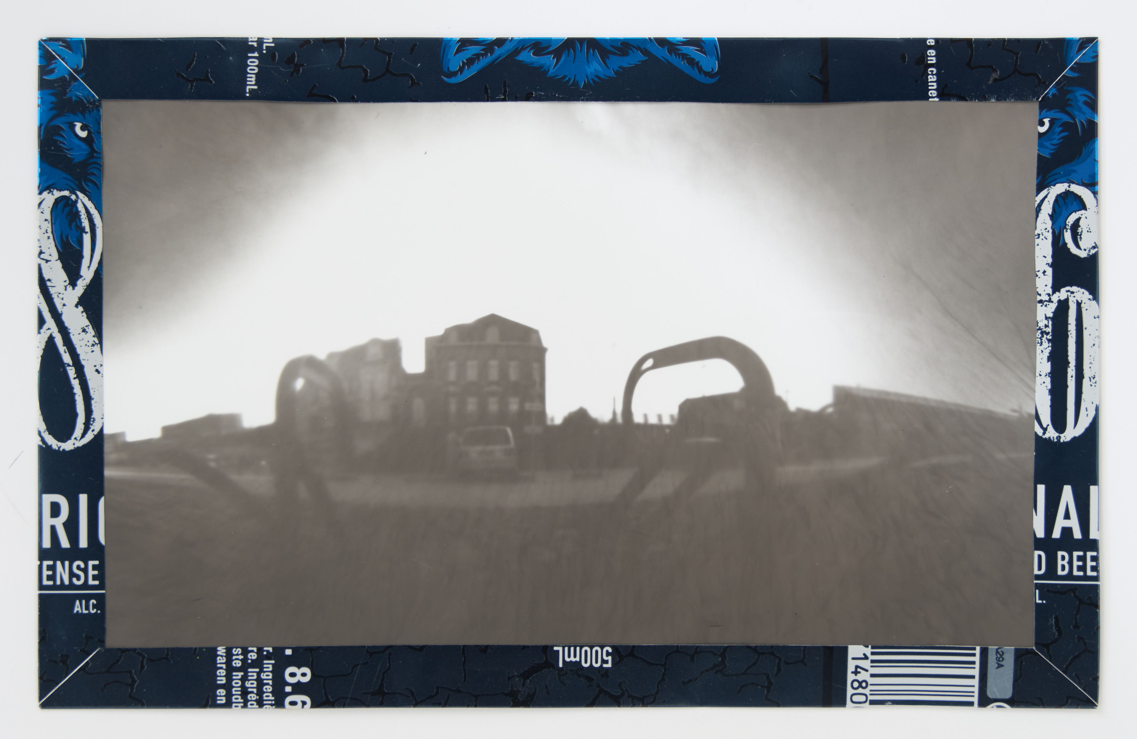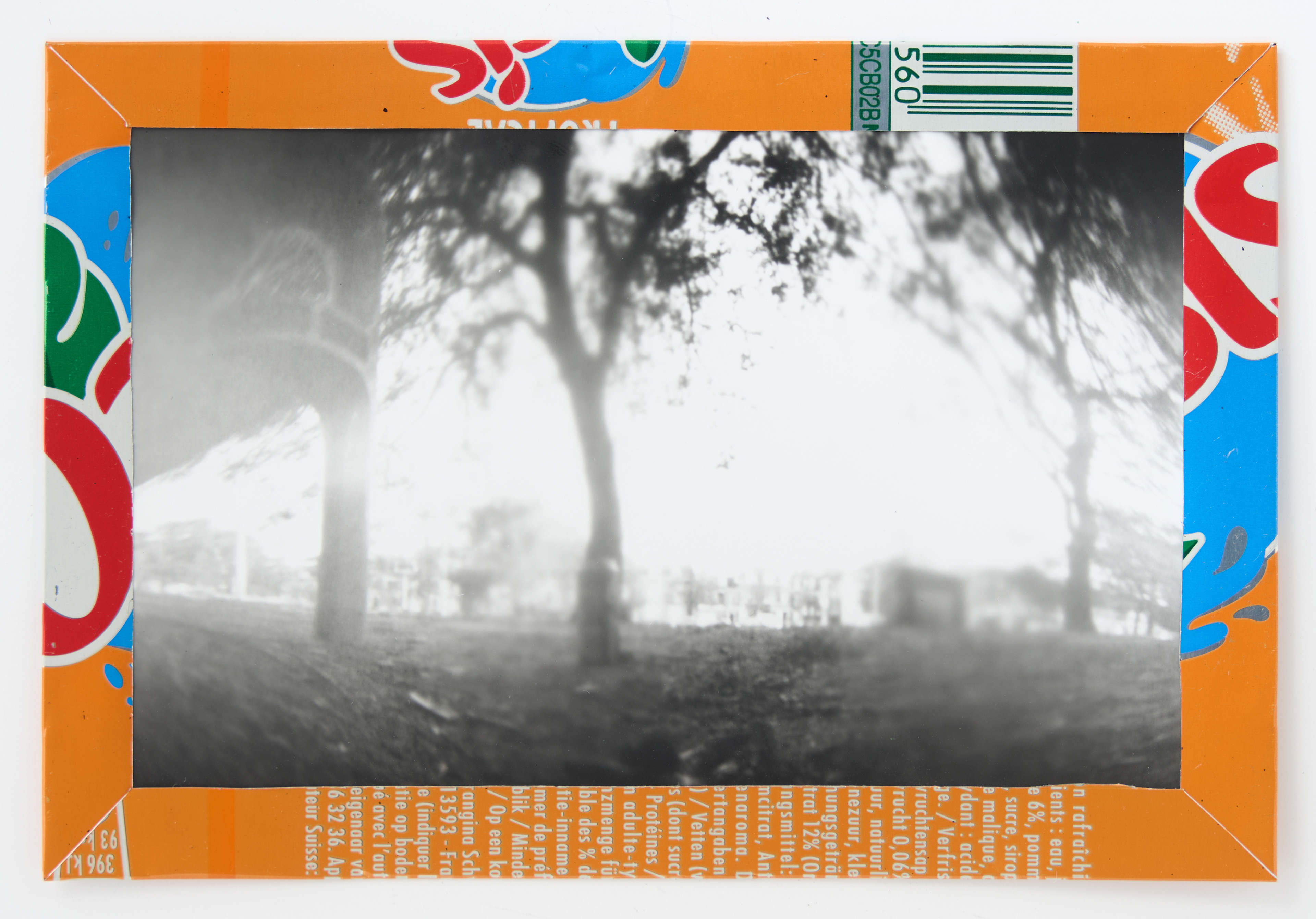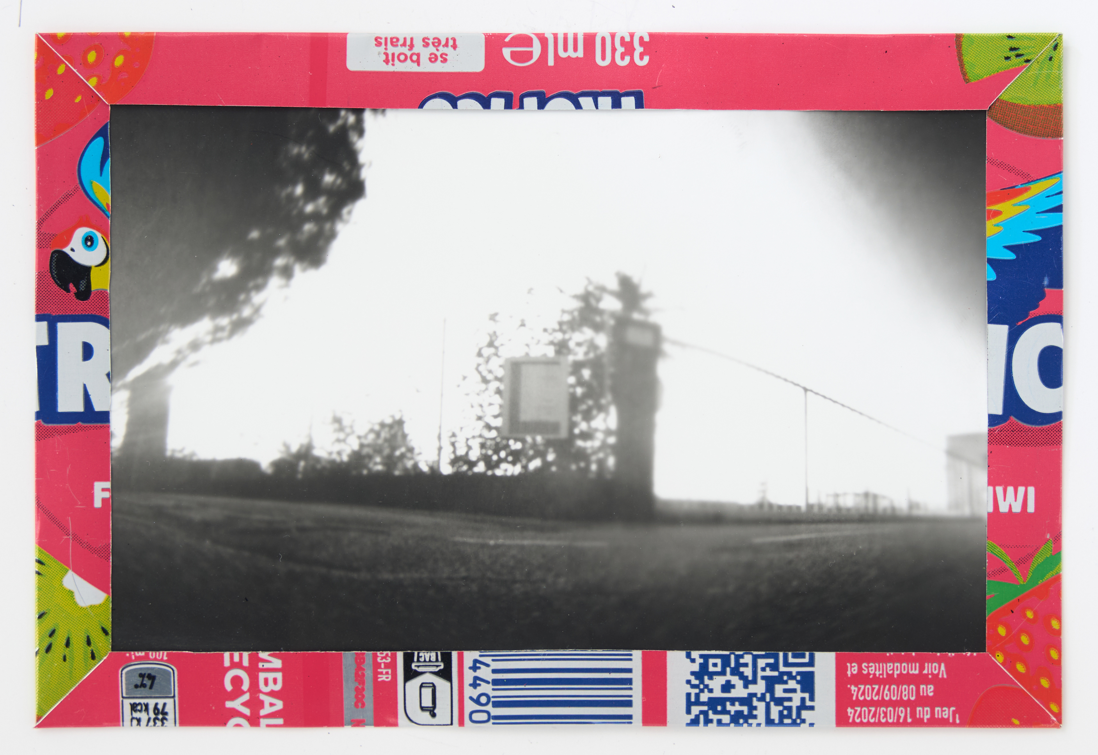 La canette sert ensuite d’encadrement à sa photographie, découpée et pliée ; ainsi ce cadre devient une extension du processus, cherchant à optimiser son recyclage.