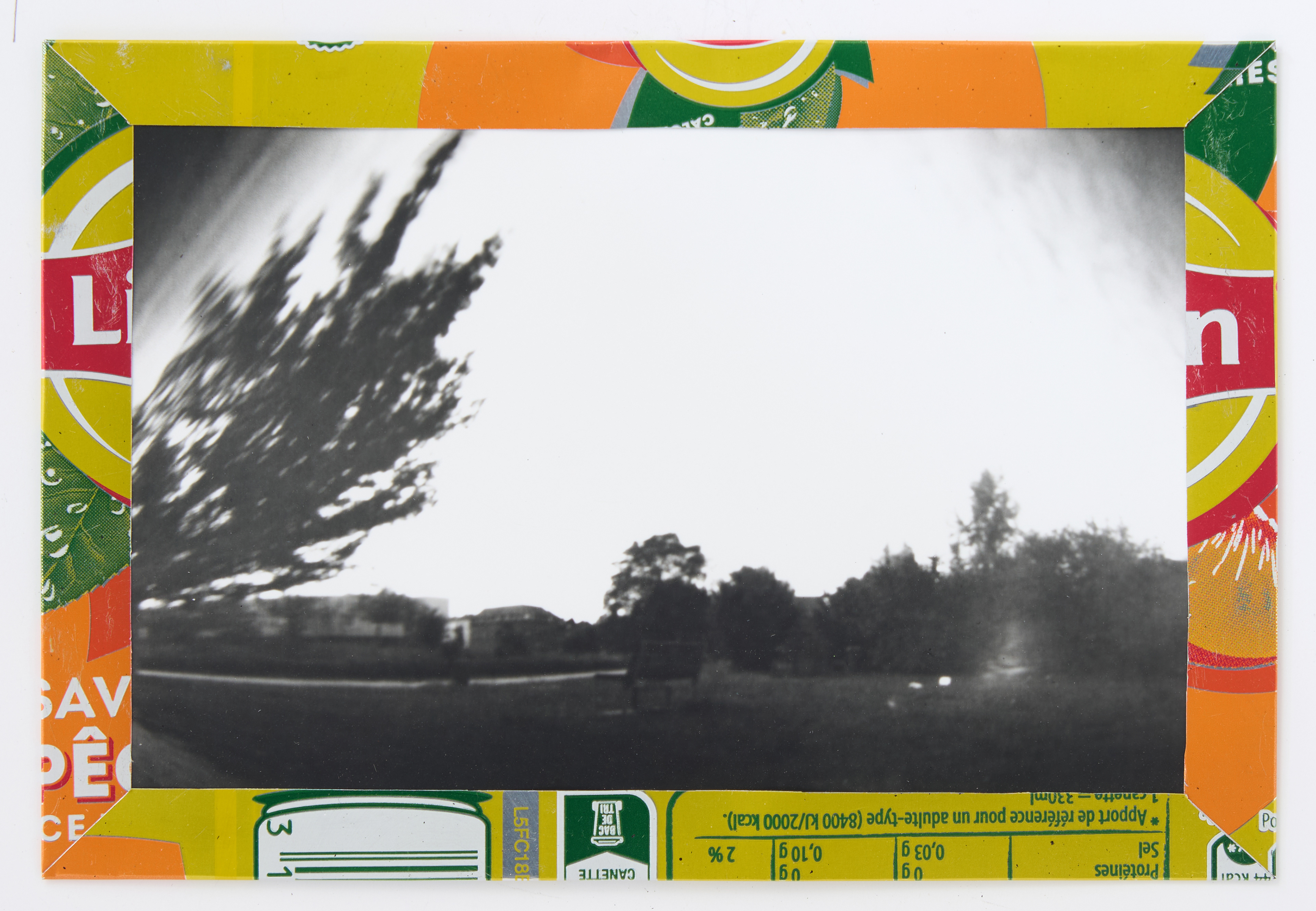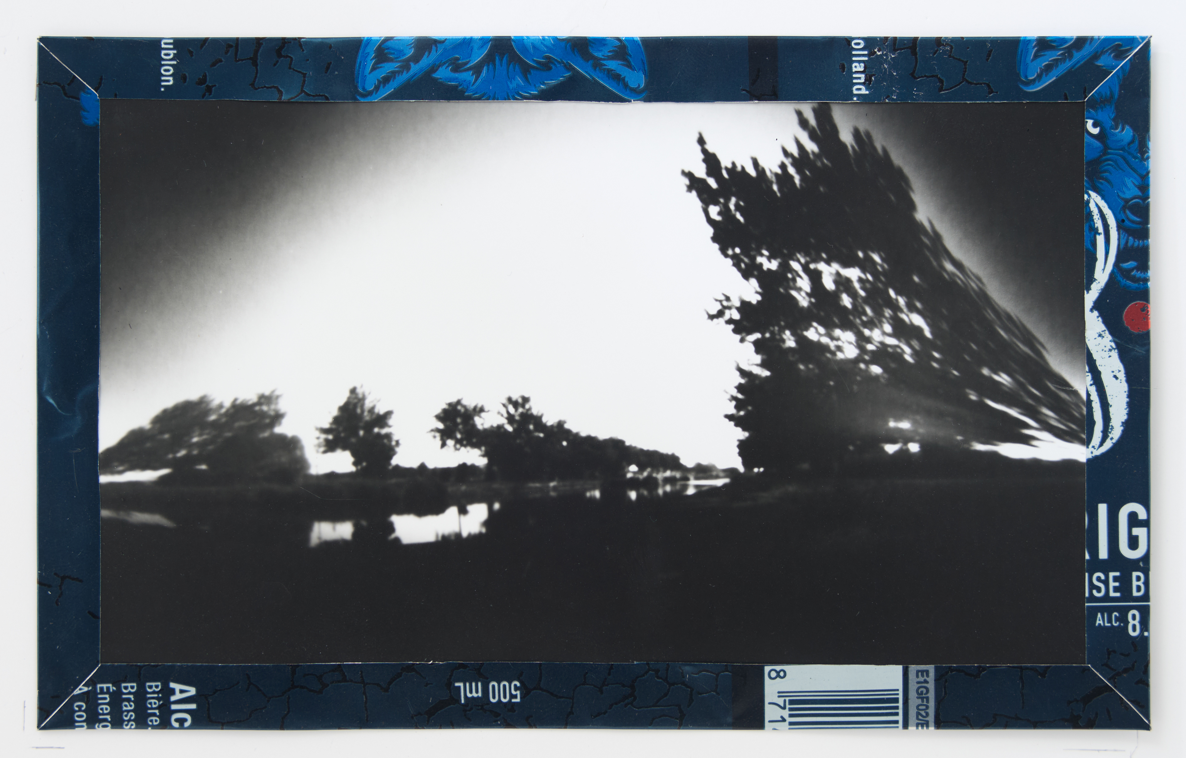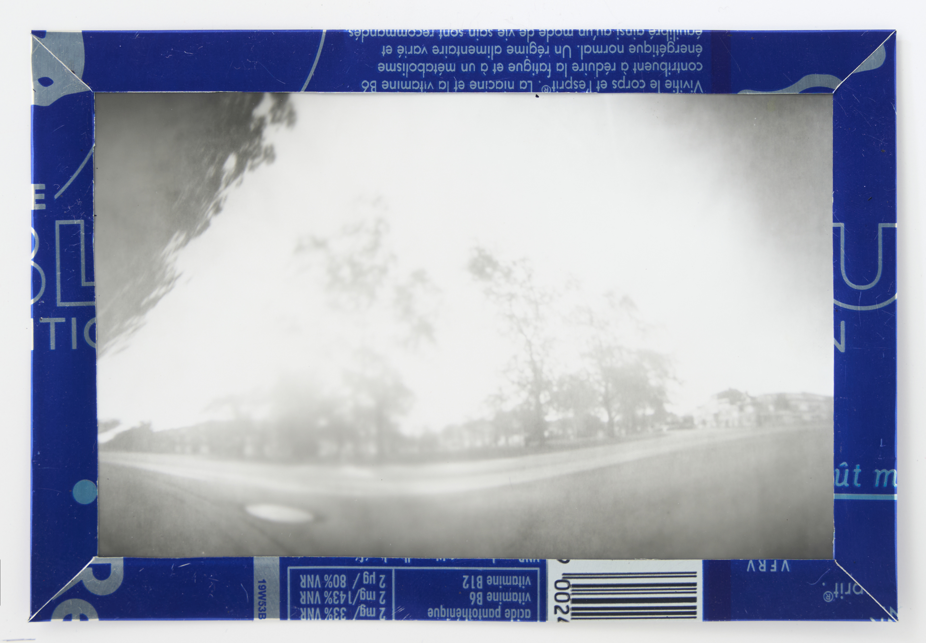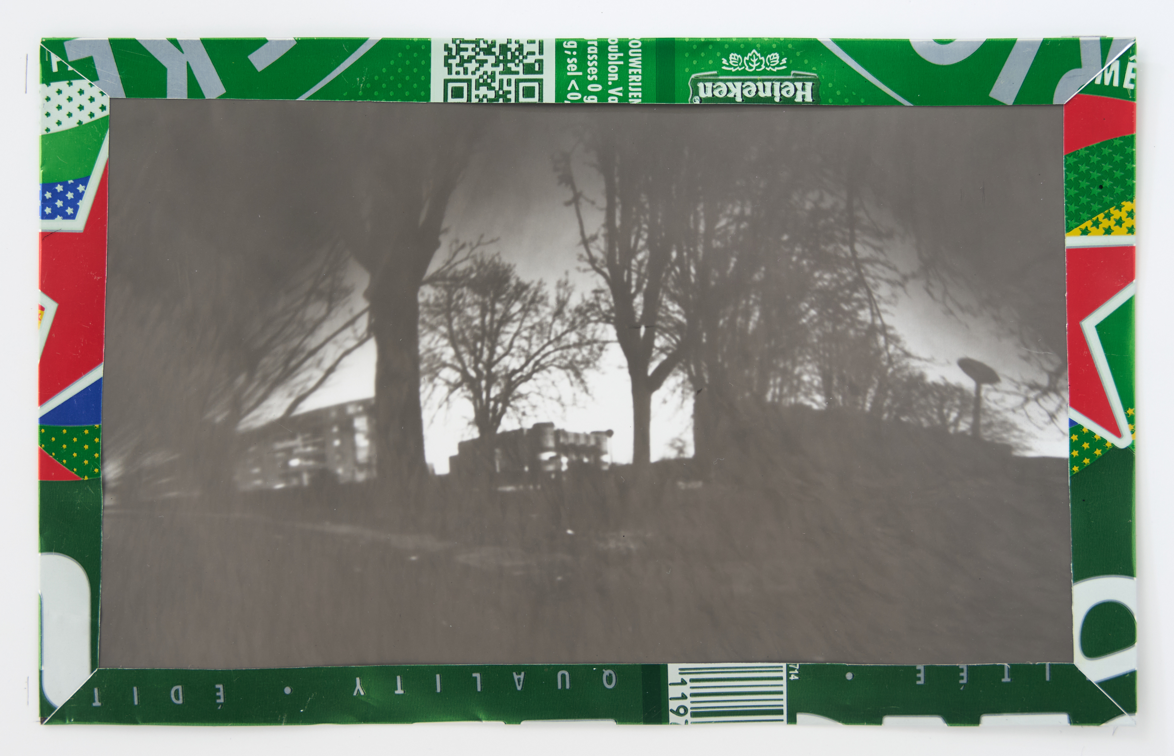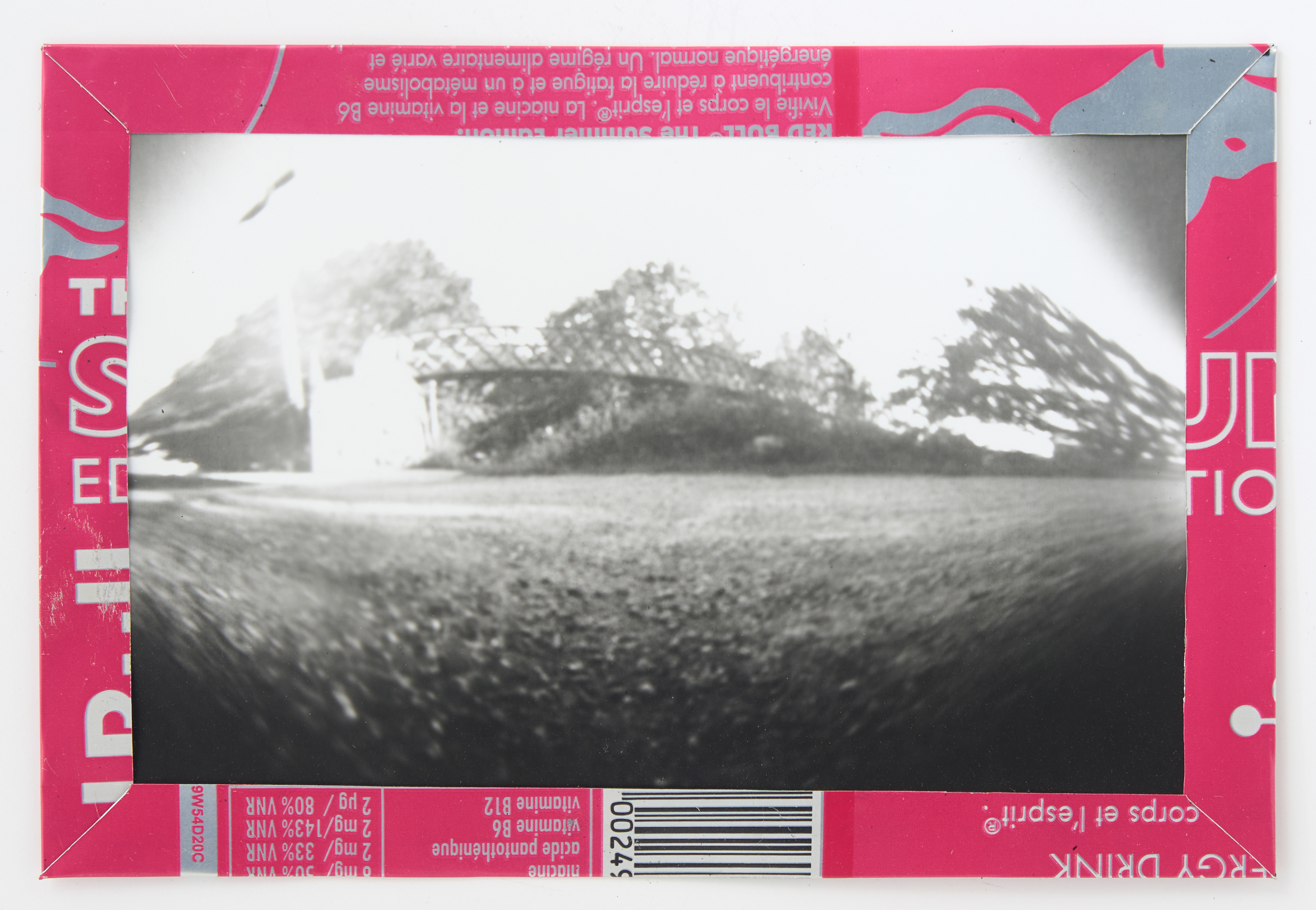 La canette sert ensuite d’encadrement à sa photographie, découpée et pliée ; ainsi ce cadre devient une extension du processus, cherchant à optimiser son recyclage.