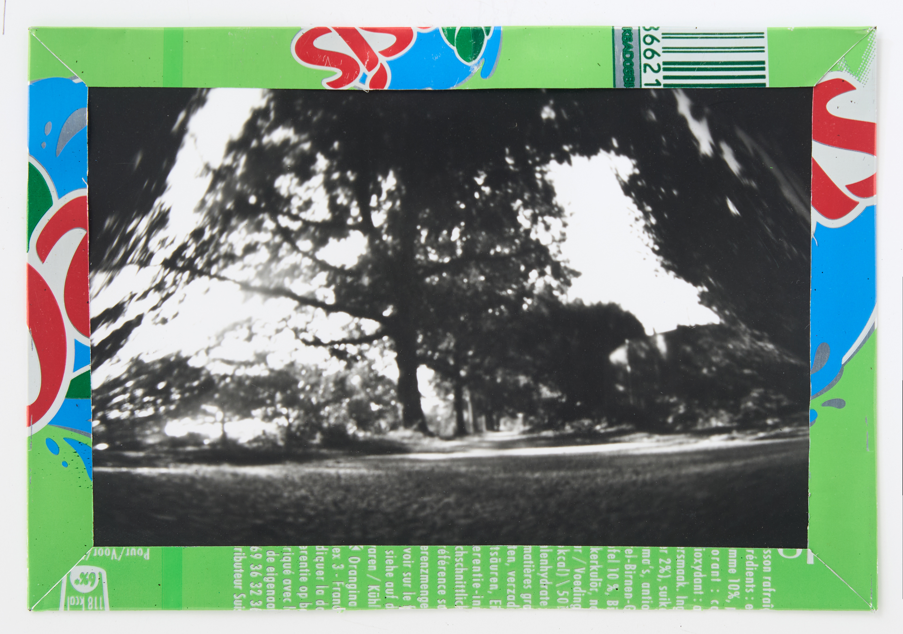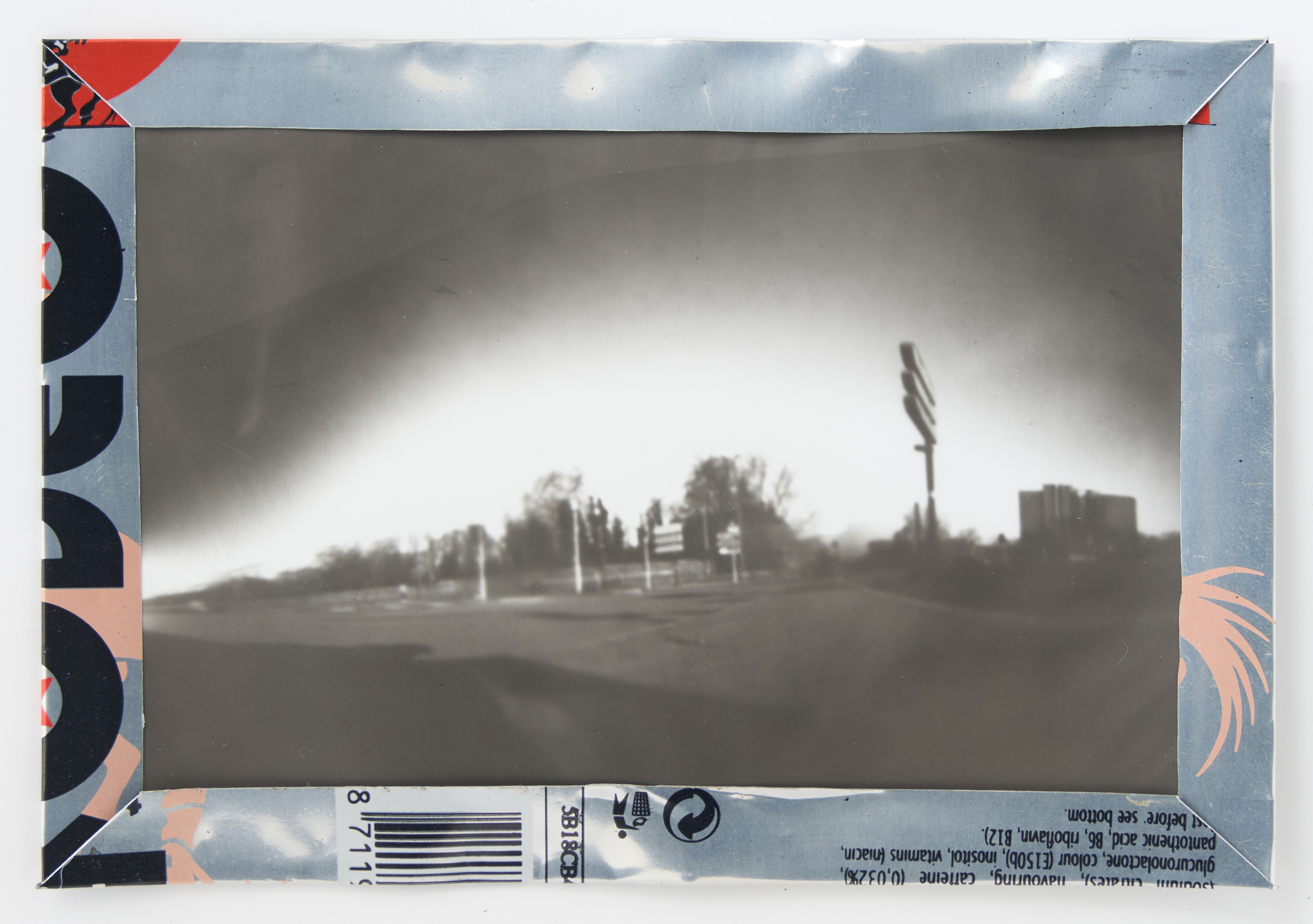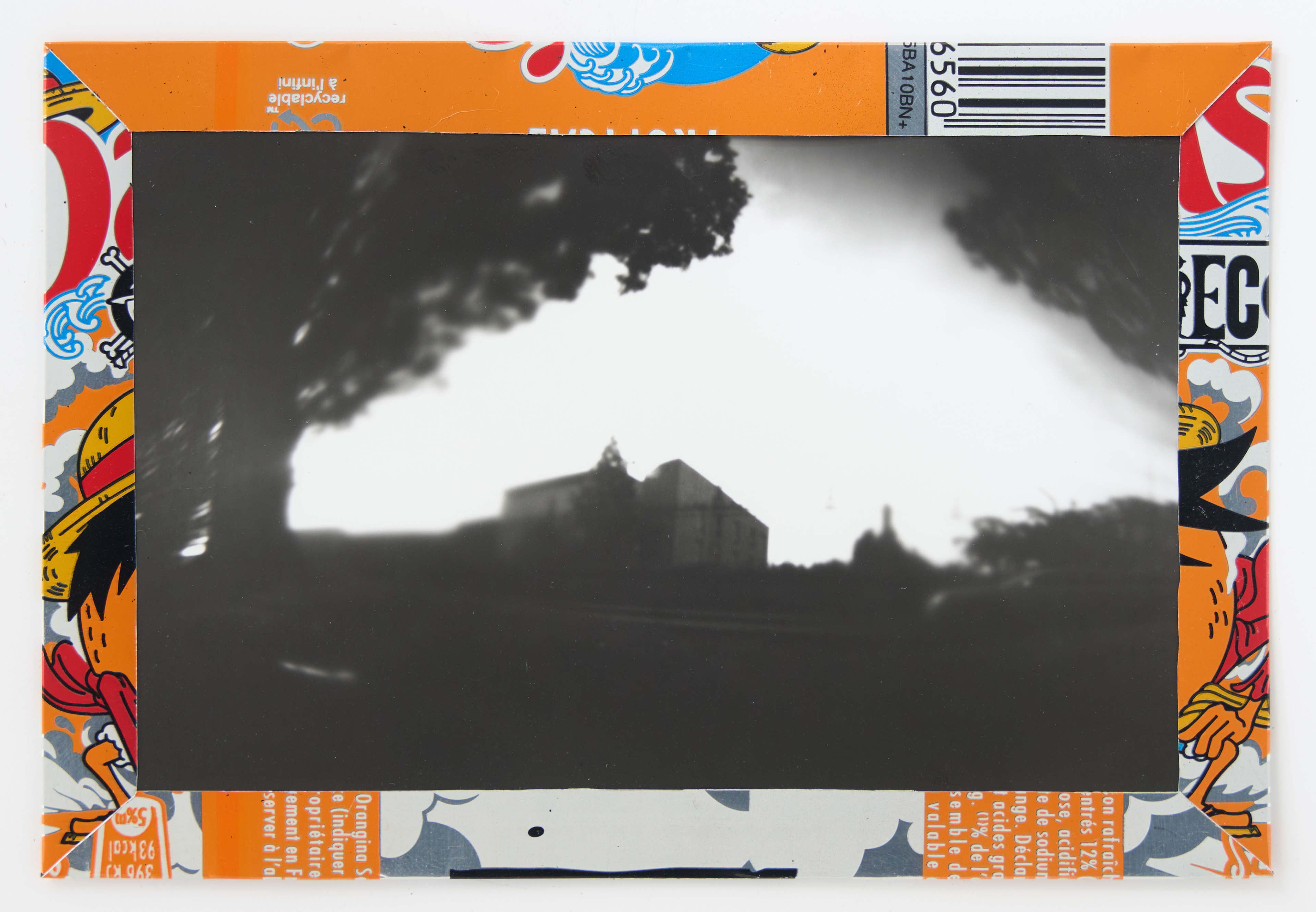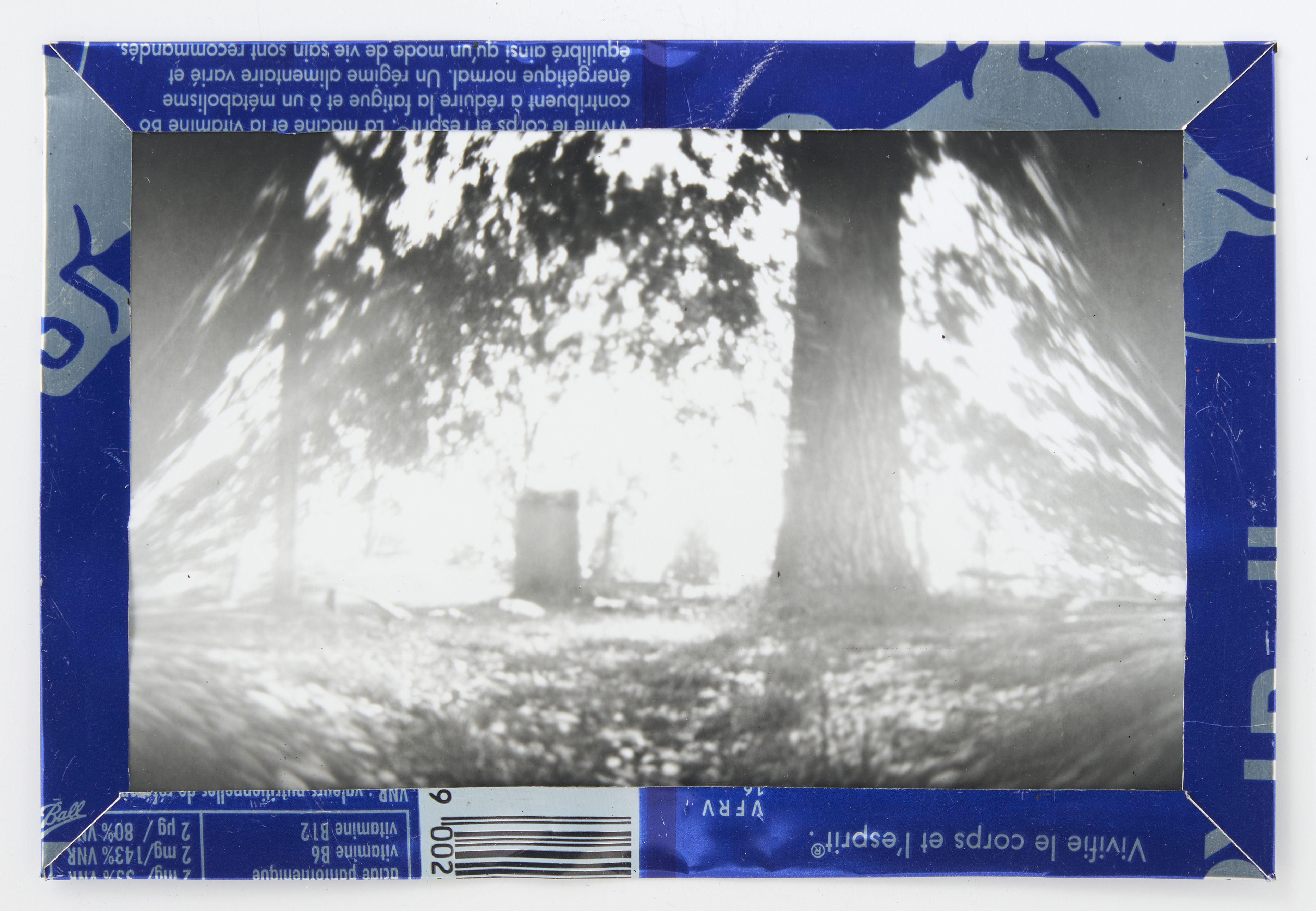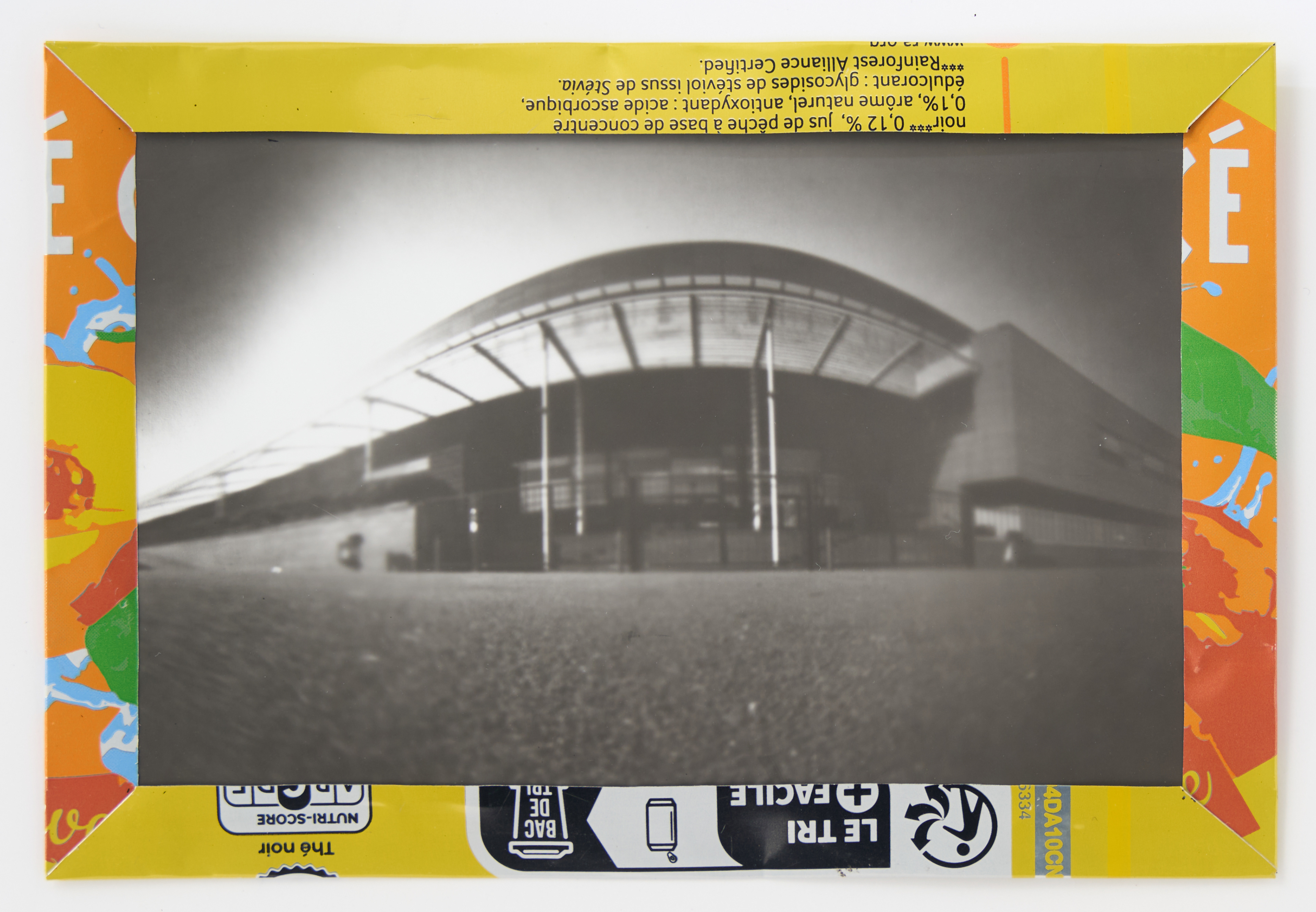 La canette sert ensuite d’encadrement à sa photographie, découpée et pliée ; ainsi ce cadre devient une extension du processus, cherchant à optimiser son recyclage.