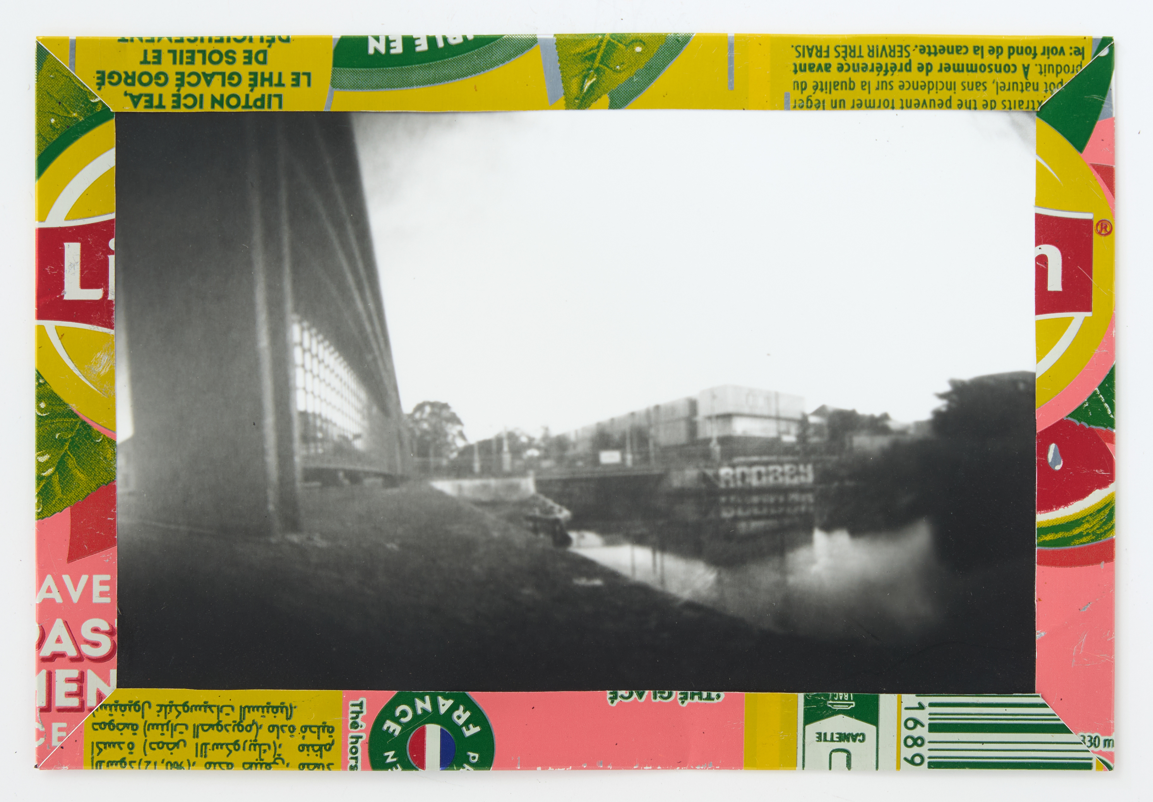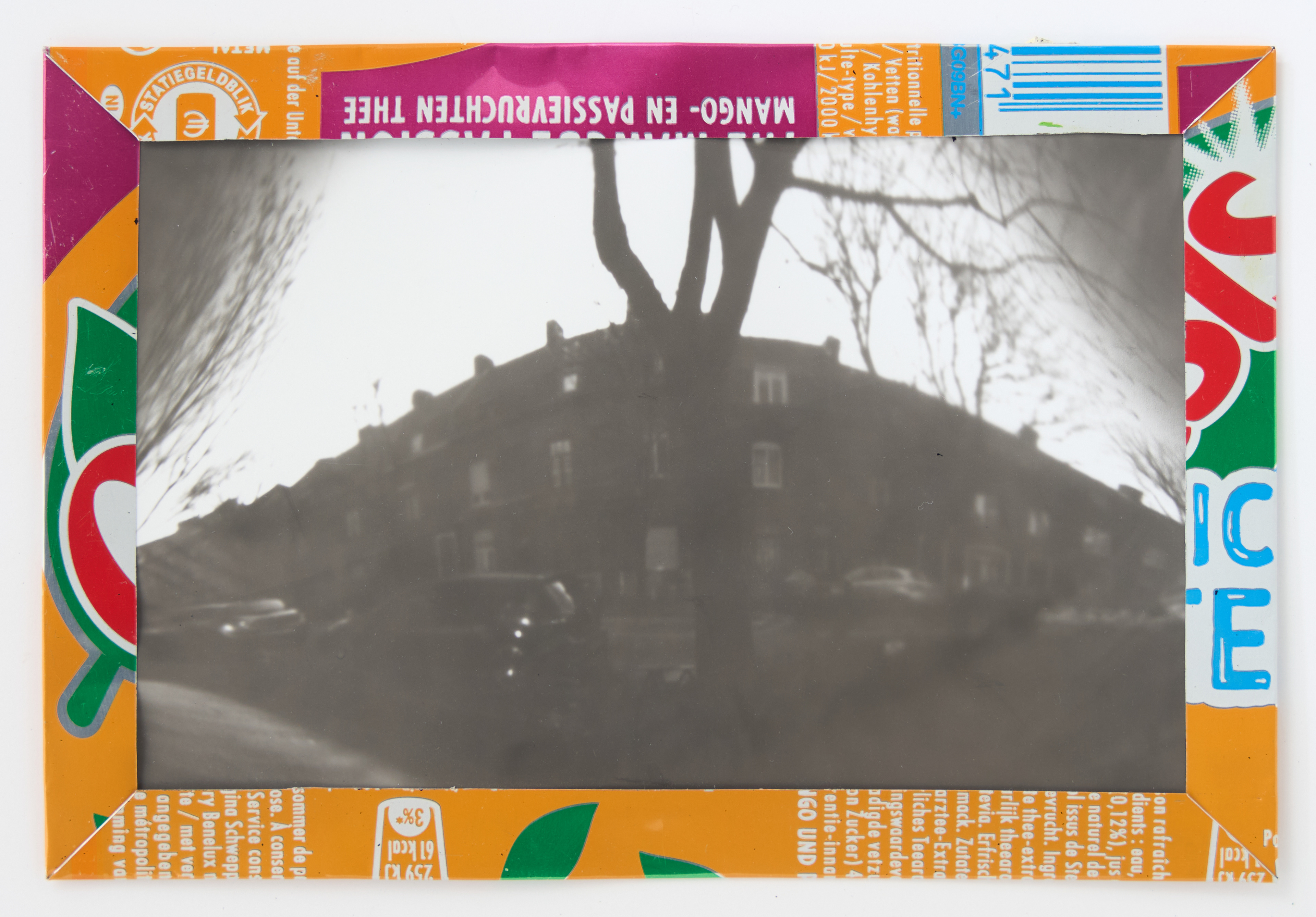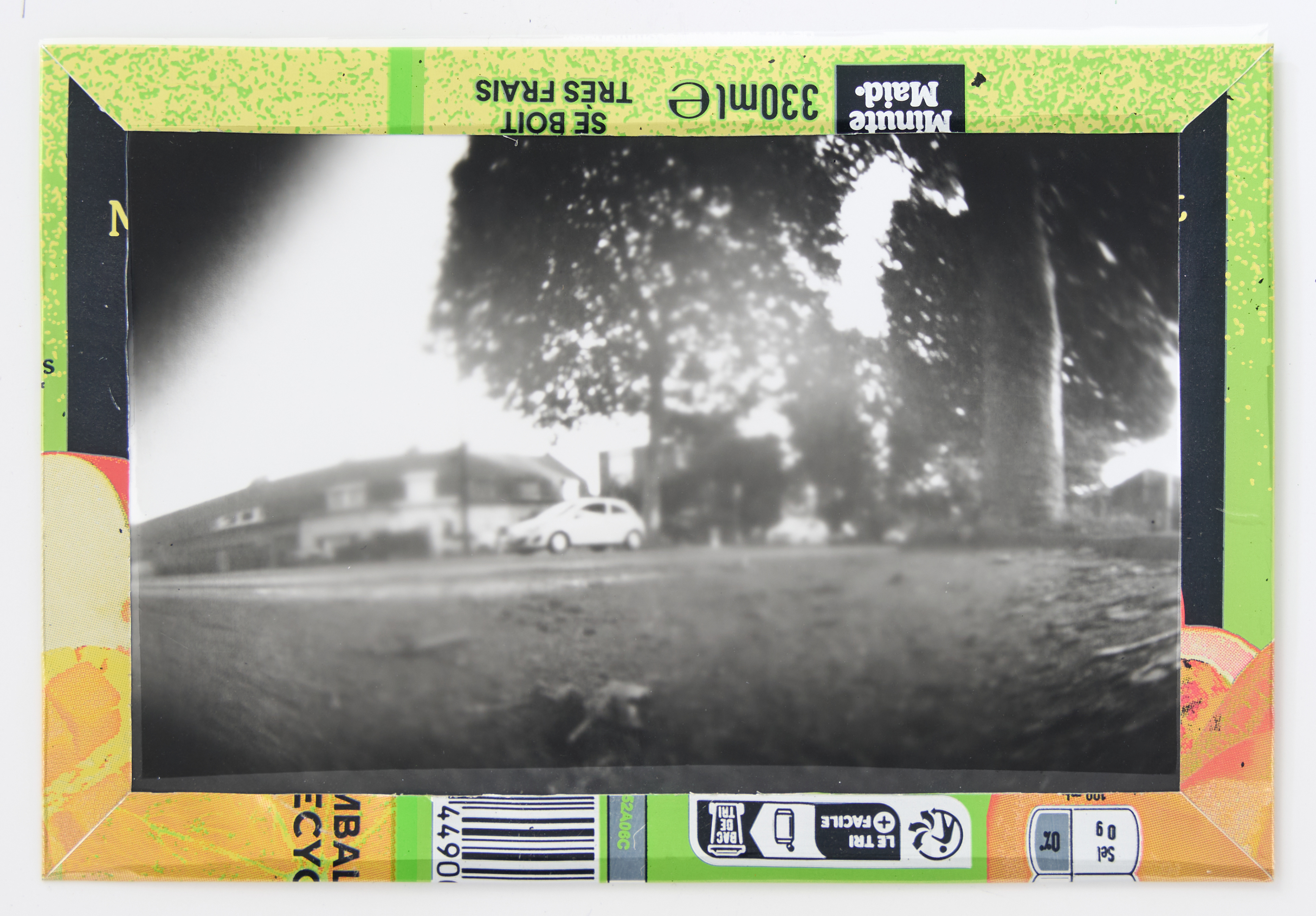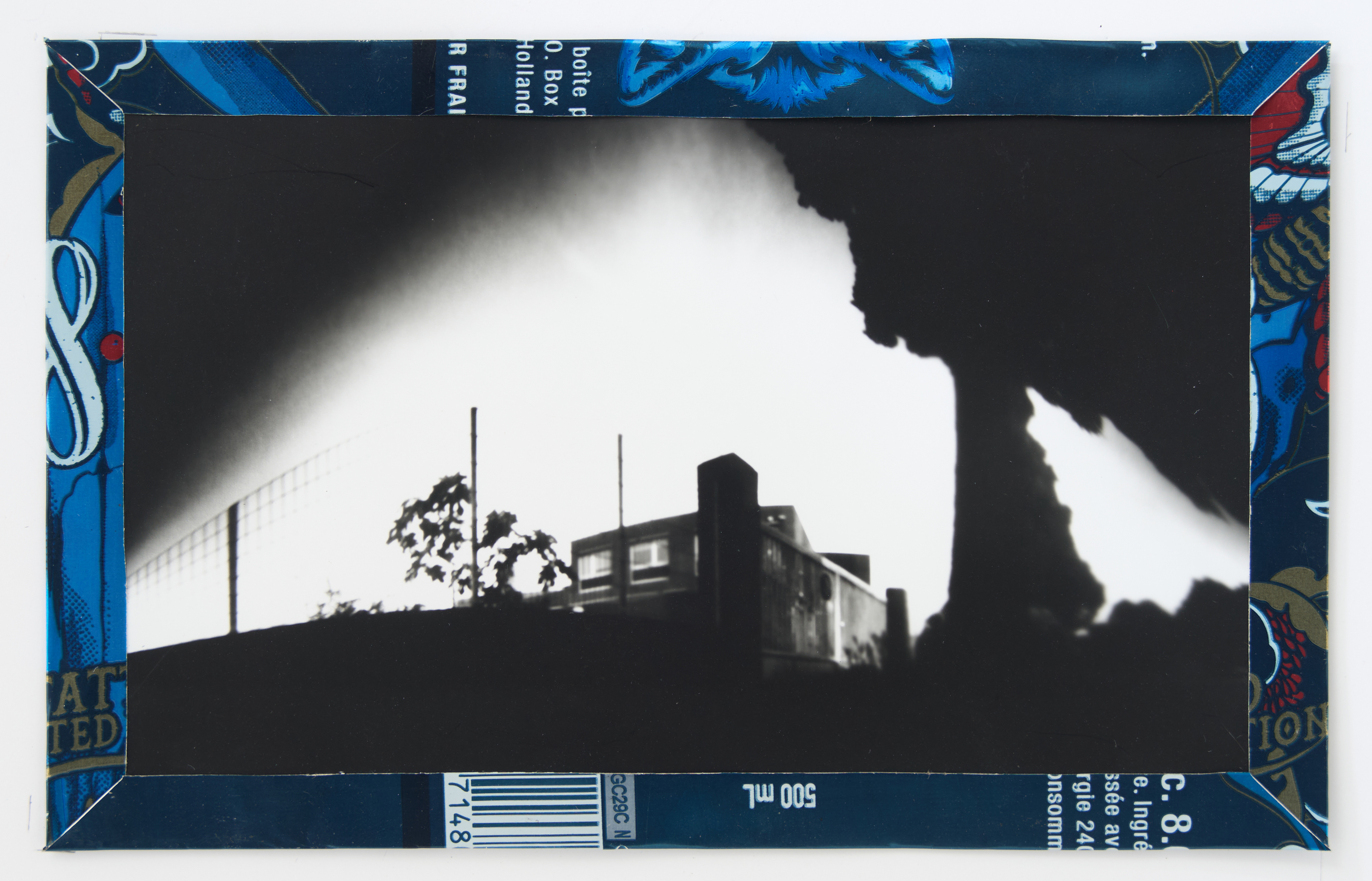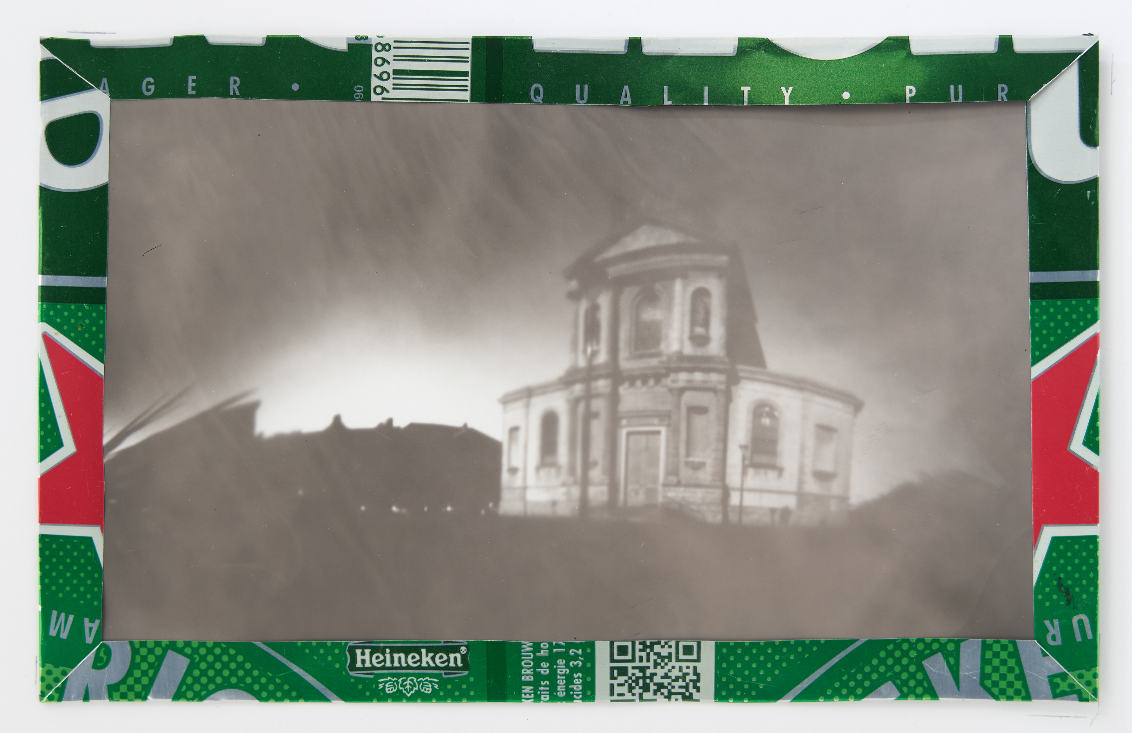 La canette sert ensuite d’encadrement à sa photographie, découpée et pliée ; ainsi ce cadre devient une extension du processus, cherchant à optimiser son recyclage.