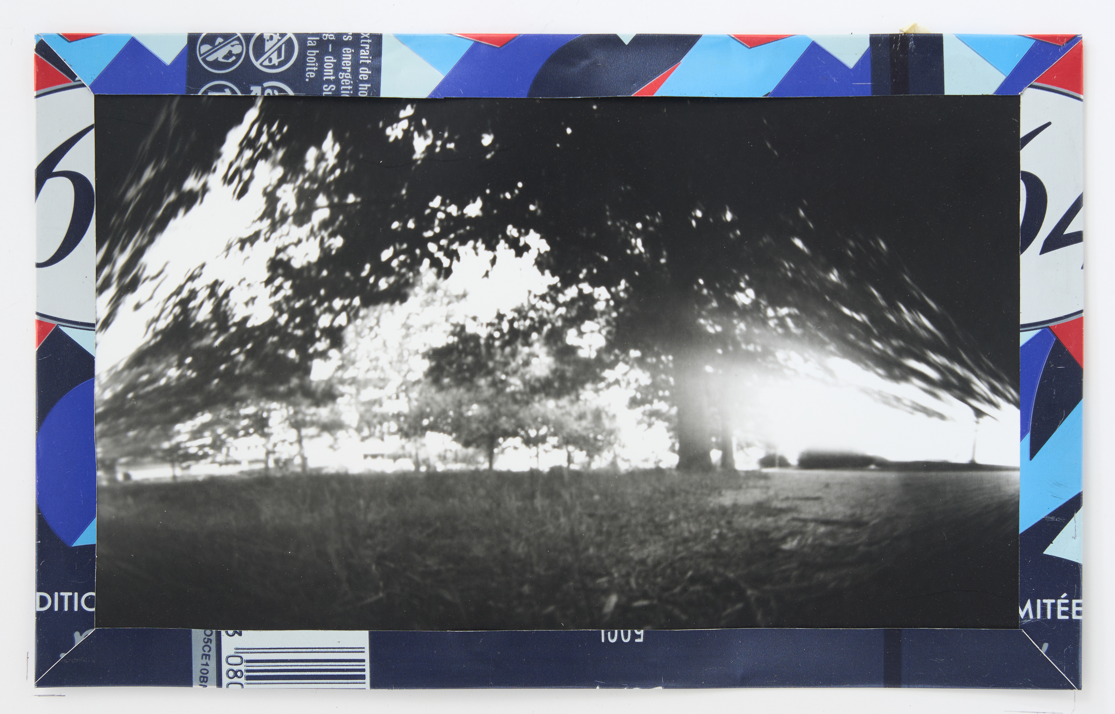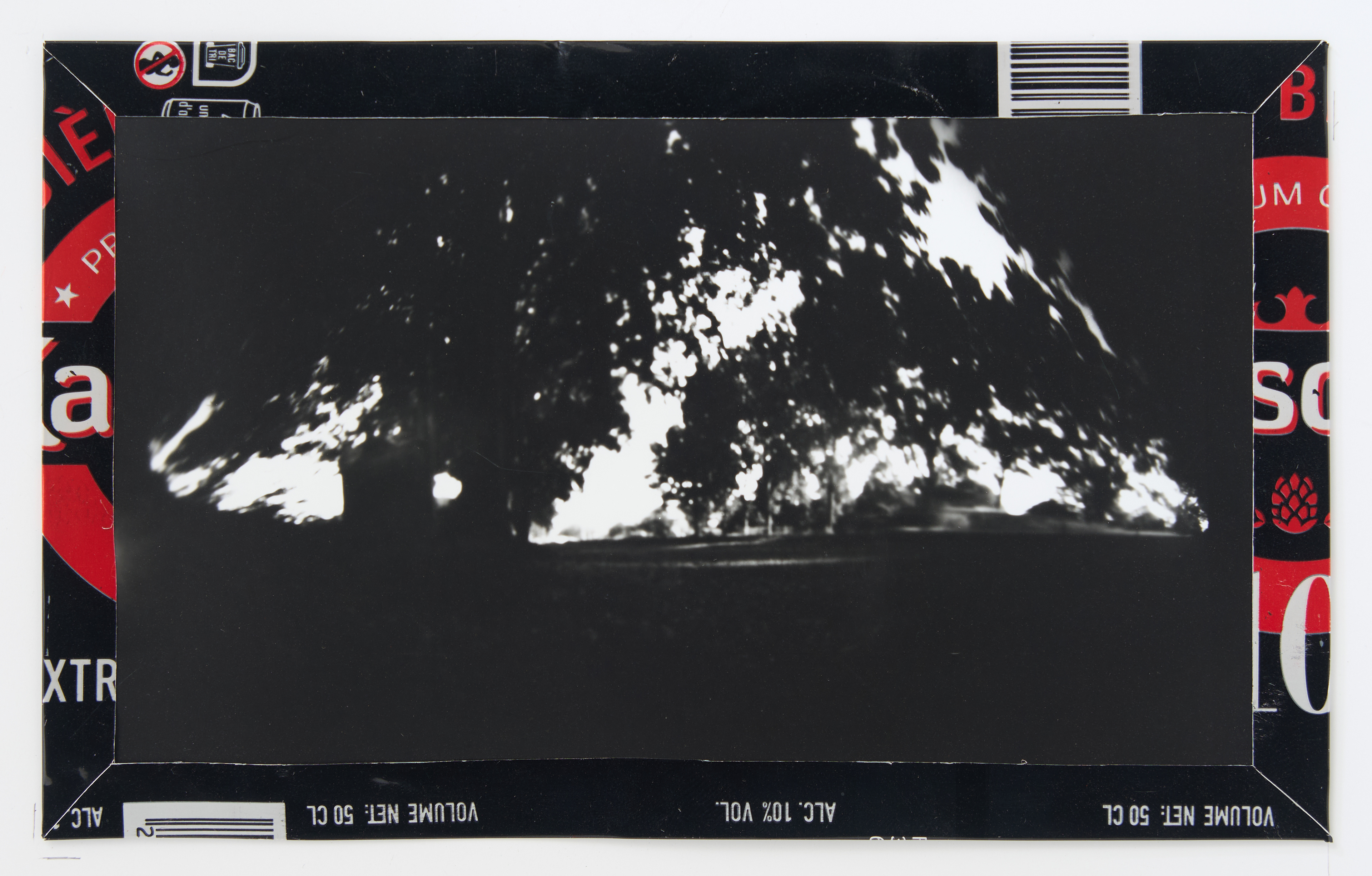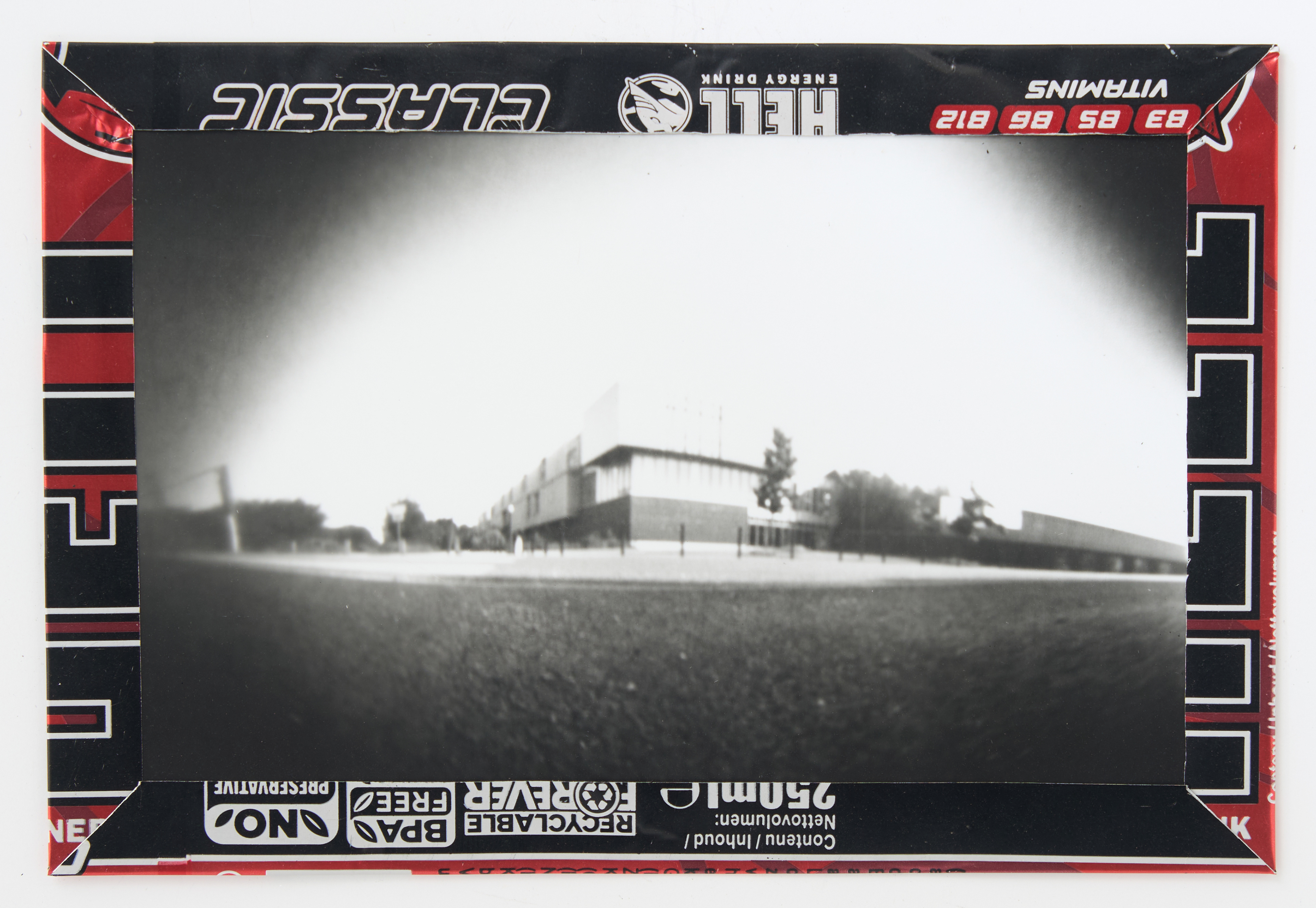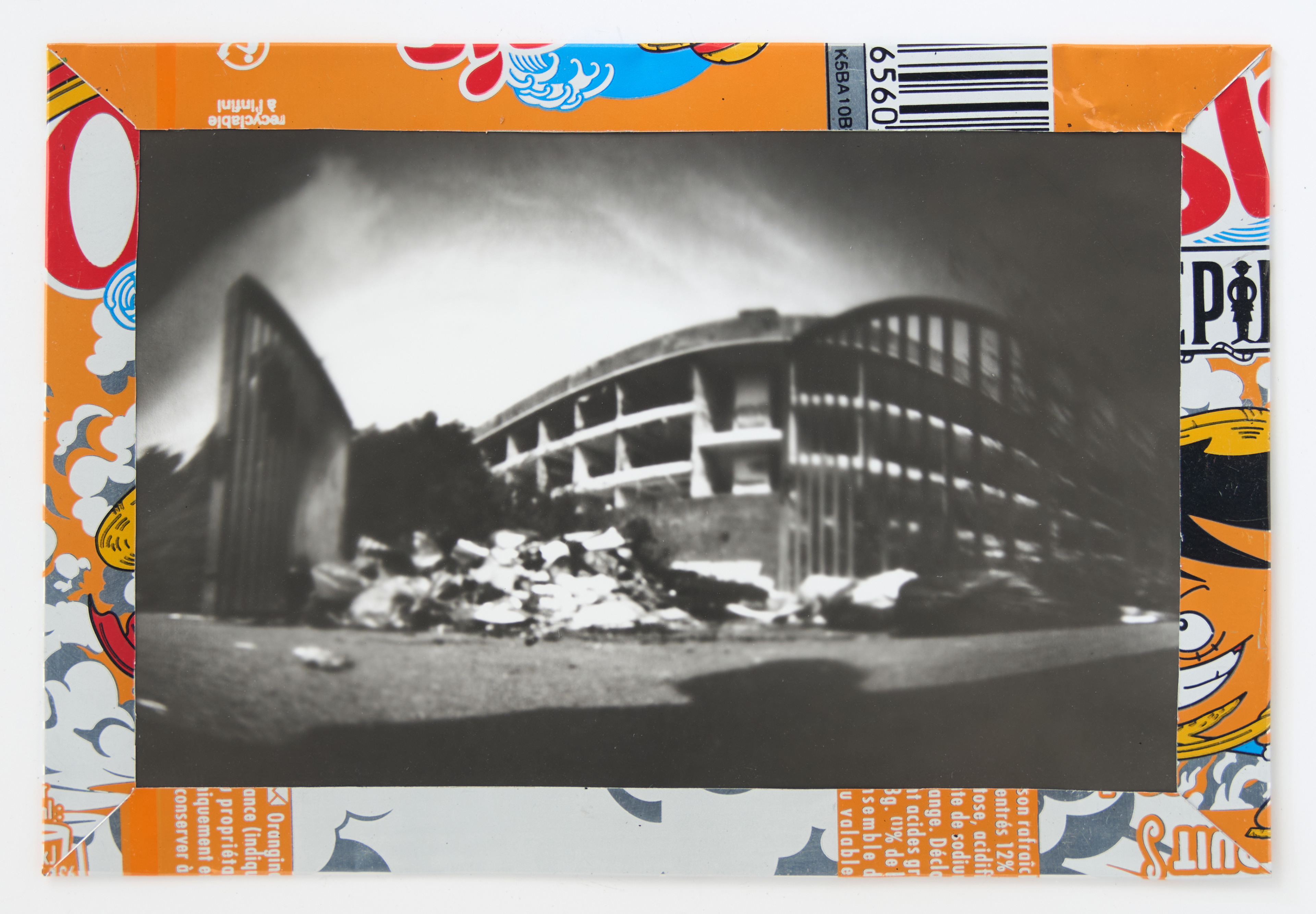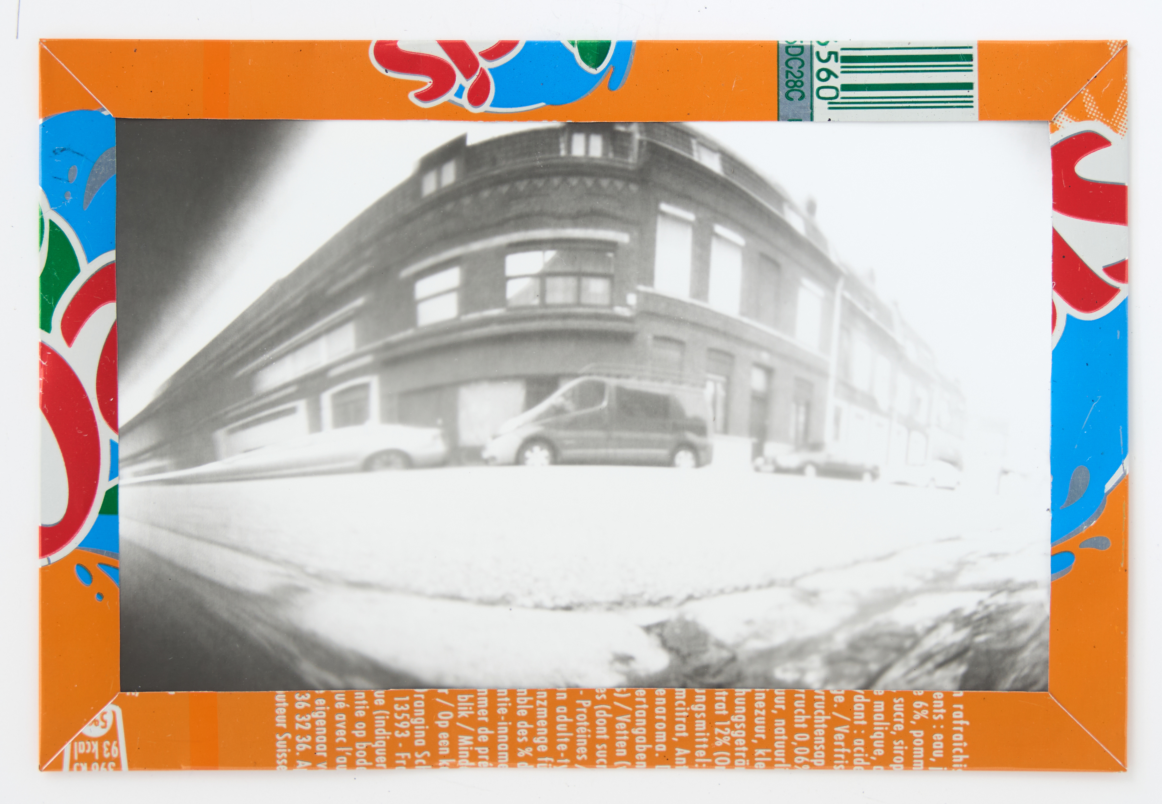 La canette sert ensuite d’encadrement à sa photographie, découpée et pliée ; ainsi ce cadre devient une extension du processus, cherchant à optimiser son recyclage.