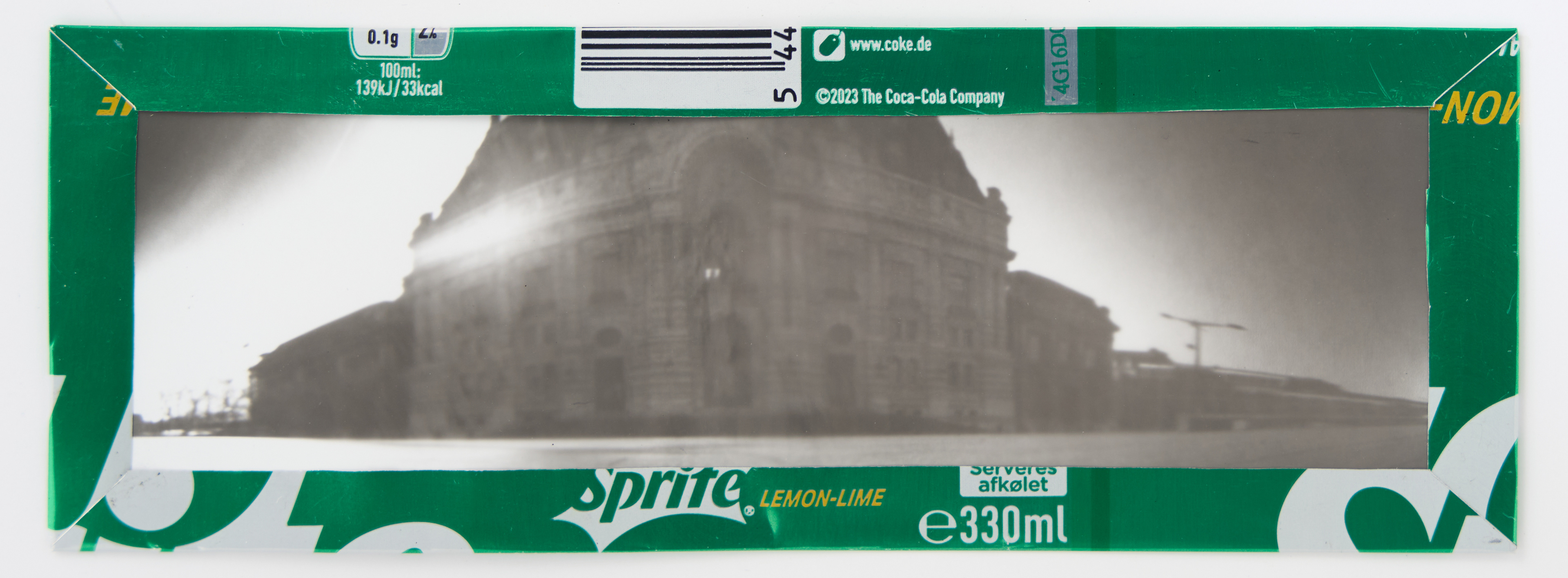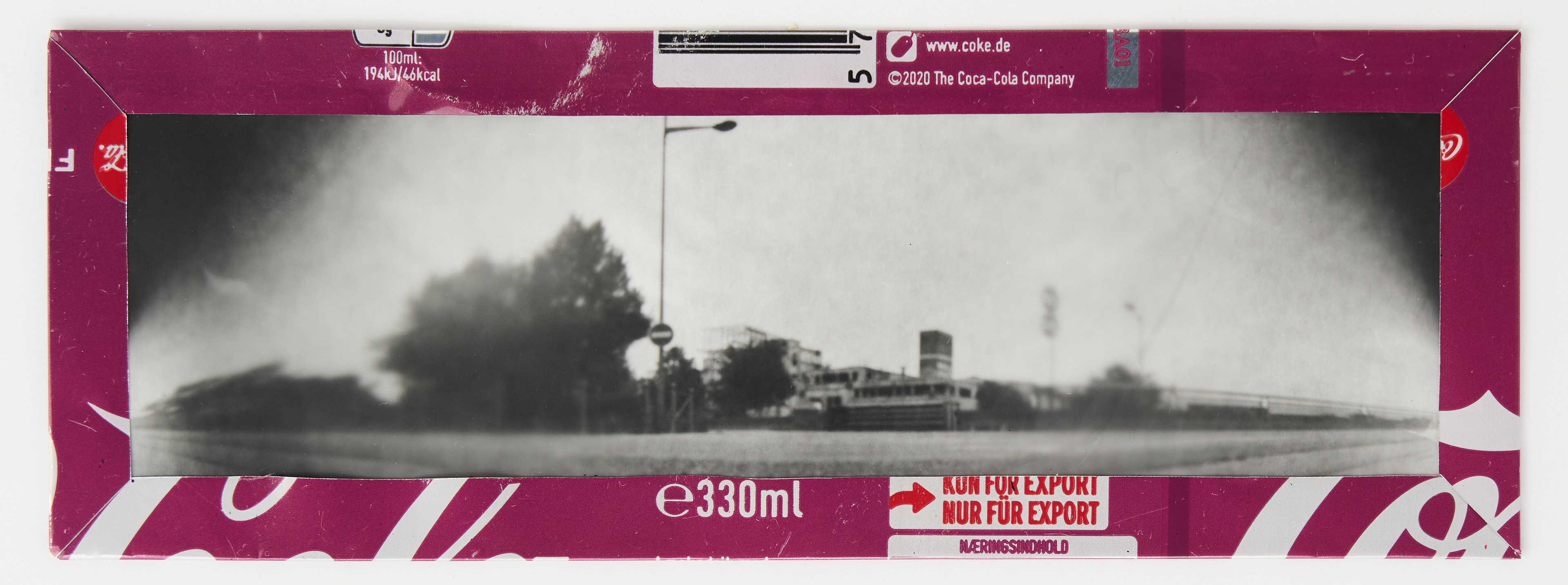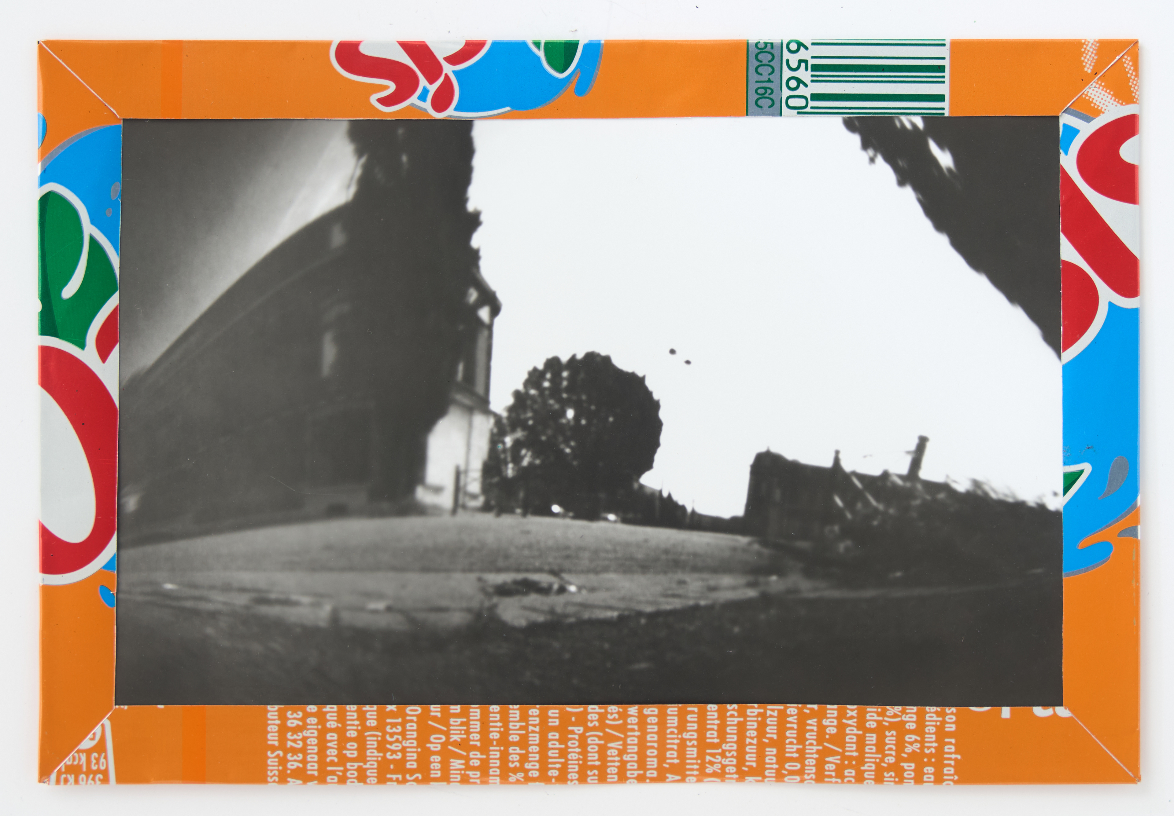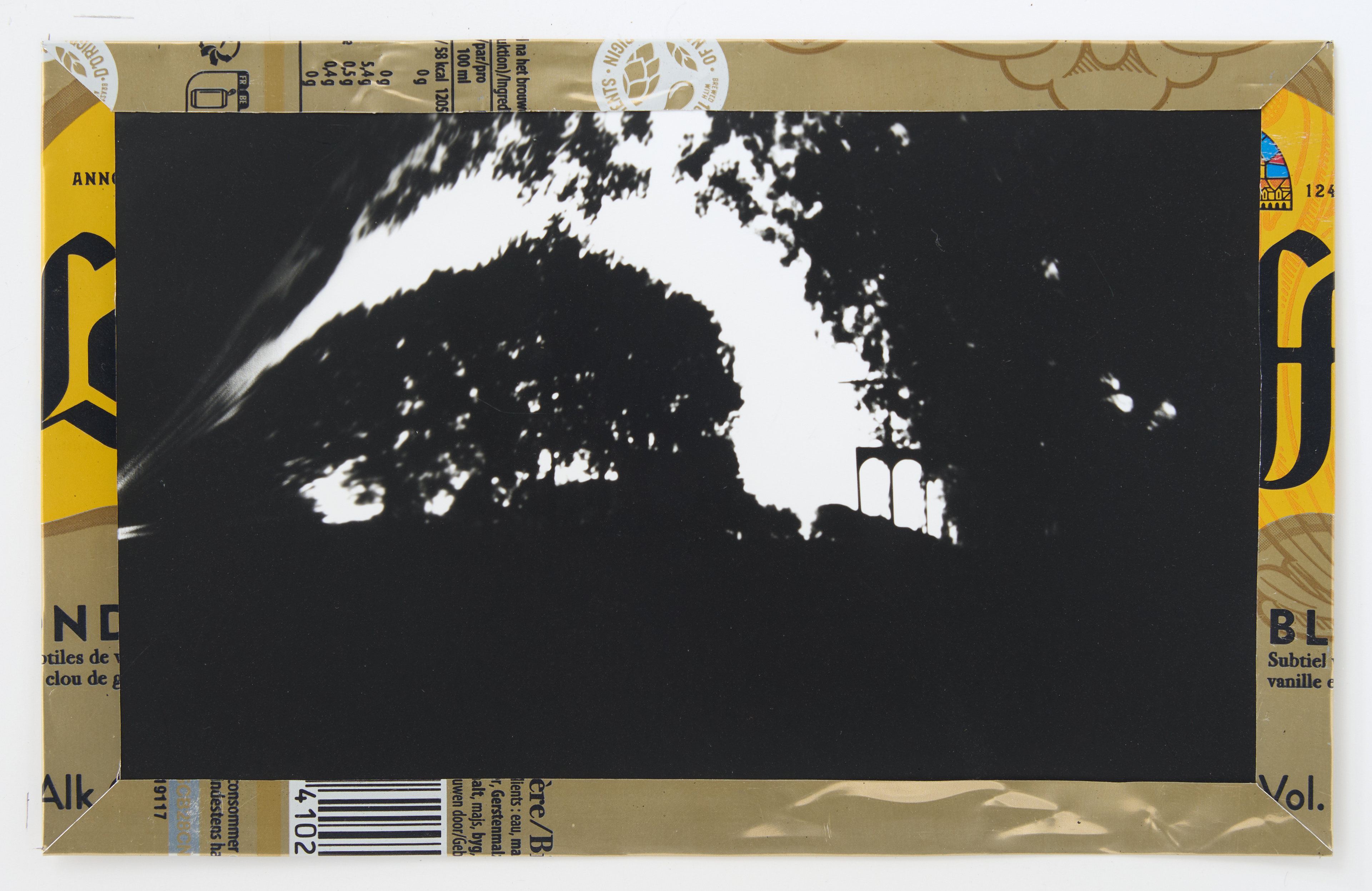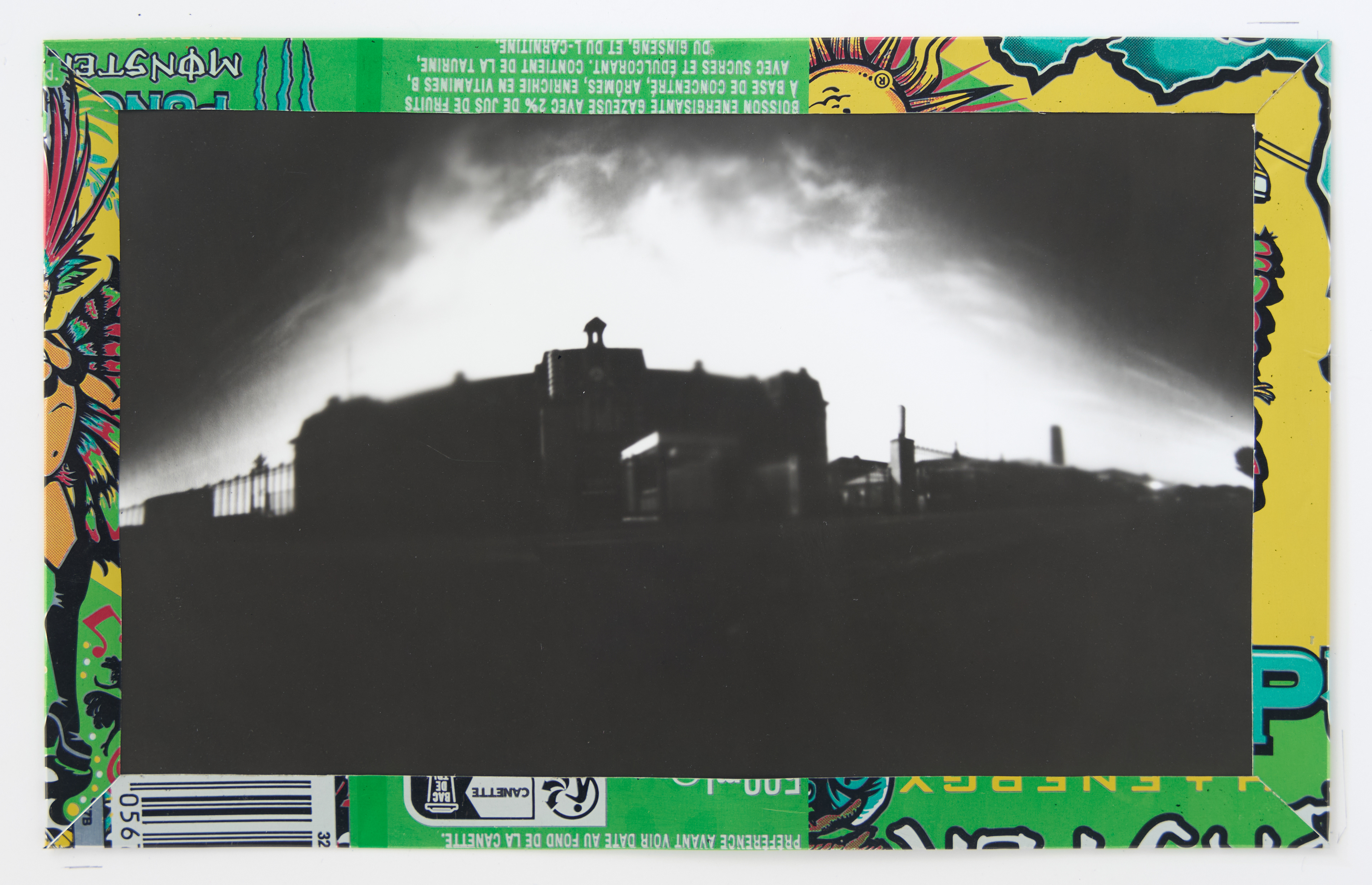 La canette sert ensuite d’encadrement à sa photographie, découpée et pliée ; ainsi ce cadre devient une extension du processus, cherchant à optimiser son recyclage.